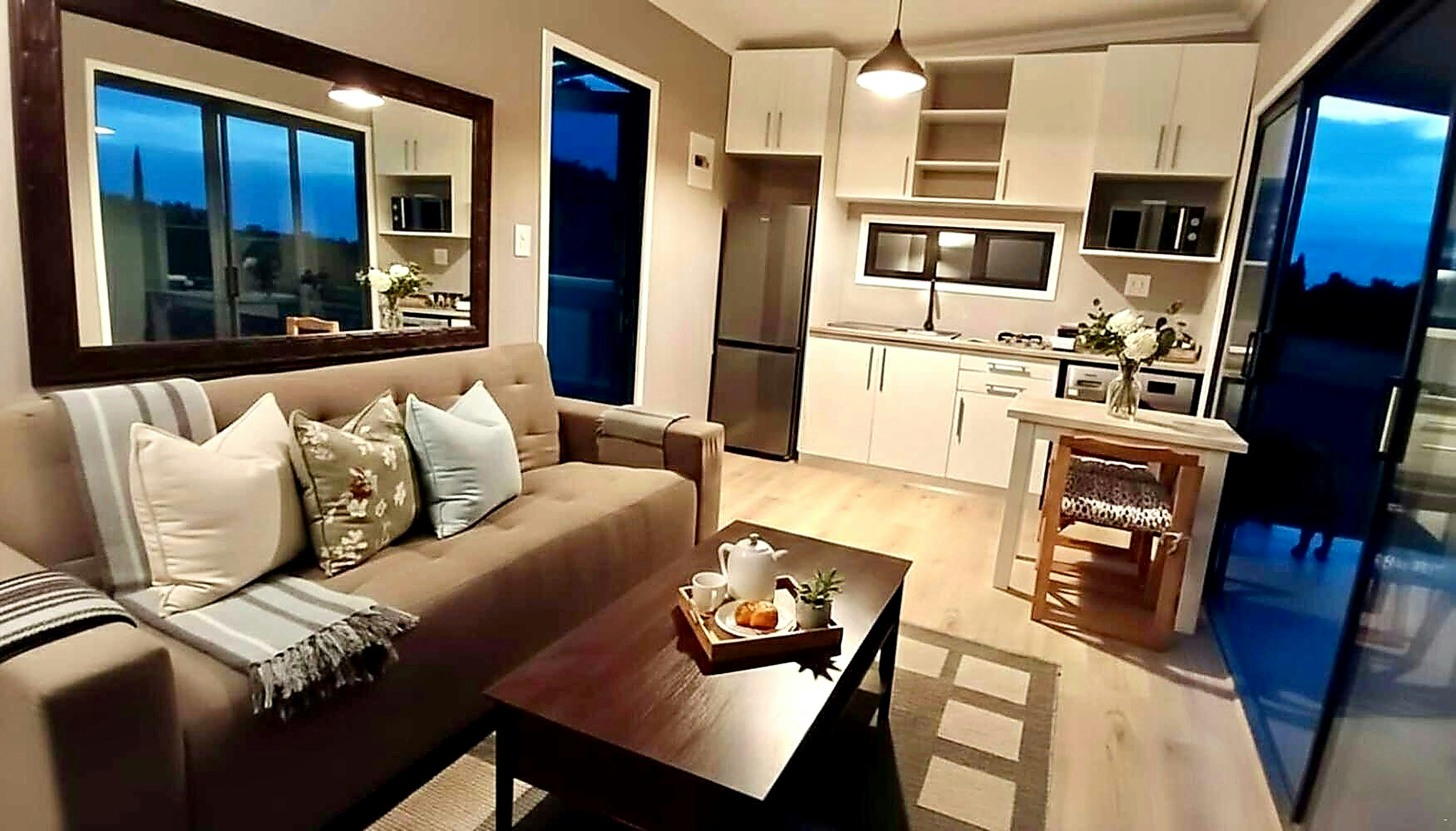 The open-plan living space features a 2-seater dining table and a comfortable couch. The kitchen is equipped with a fridge-freezer, gas stove, toaster, and microwave, as well as tea-and-coffee-making facilities.