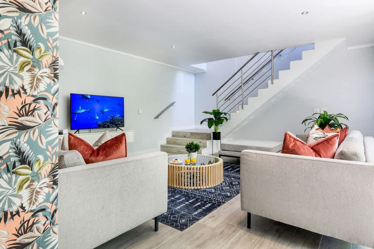 The home features a fully equipped kitchen that includes a stove, oven, microwave, kettle, coffee machine, toaster, fridge-freezer, dishwasher, washing machine, tumble dryer, and a breakfast bar with stools. The lounging and dining areas have comfortable seating for guests to dine and relax, and for entertainment, smart TVs with DStv channels and access to free Wi-Fi are available.