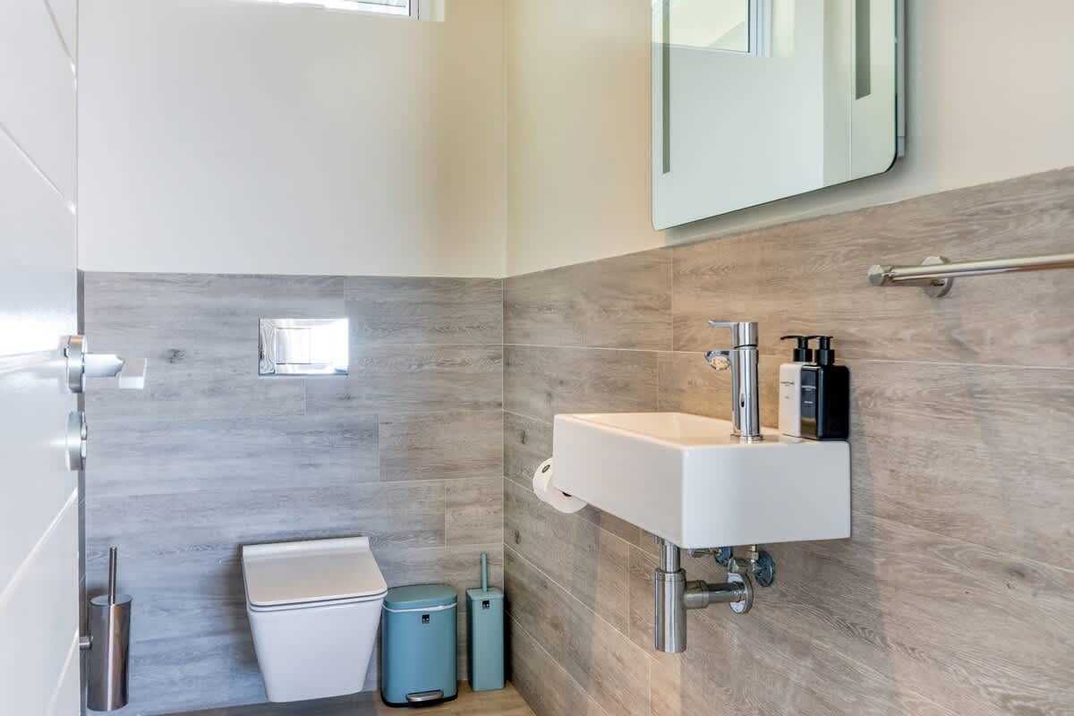 This property can accommodate up to 6 guests and comprises 3 en-suite bedrooms, as well as a guest toilet. The first bedroom is furnished with a king-size bed, has air conditioning, a walk-in dressing room, and a bathroom fitted with both a bath and a double walk-in shower. This room has direct access to the rooftop patio. The second and third bedrooms each feature a double bed, standing fan, and a bathroom fitted with a shower. Both of these bedrooms have access to a patio. Linen and bath towels are provided.