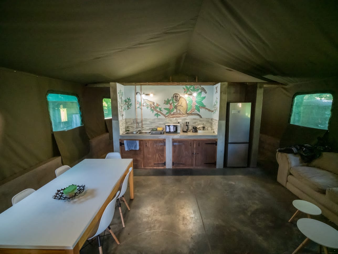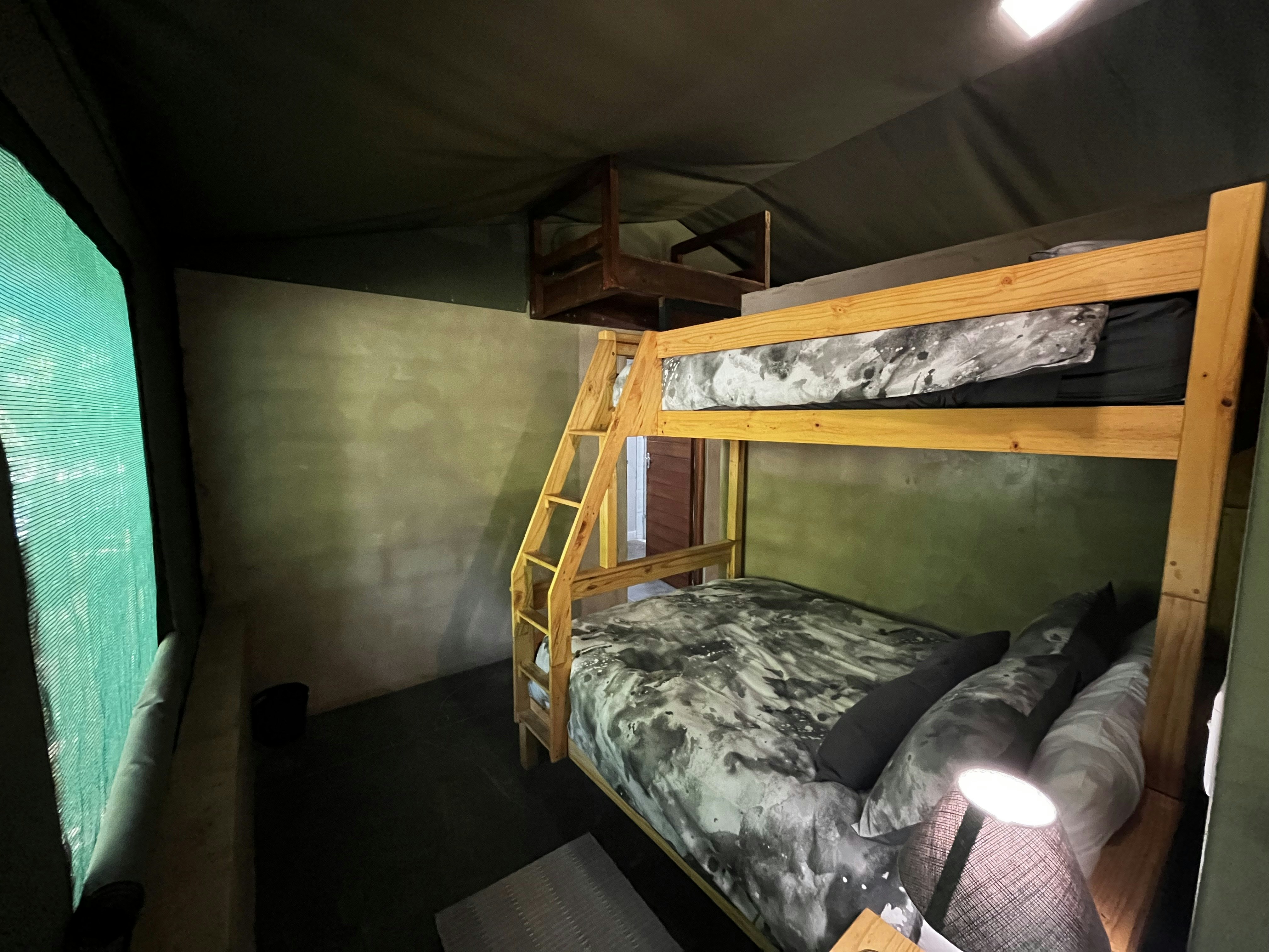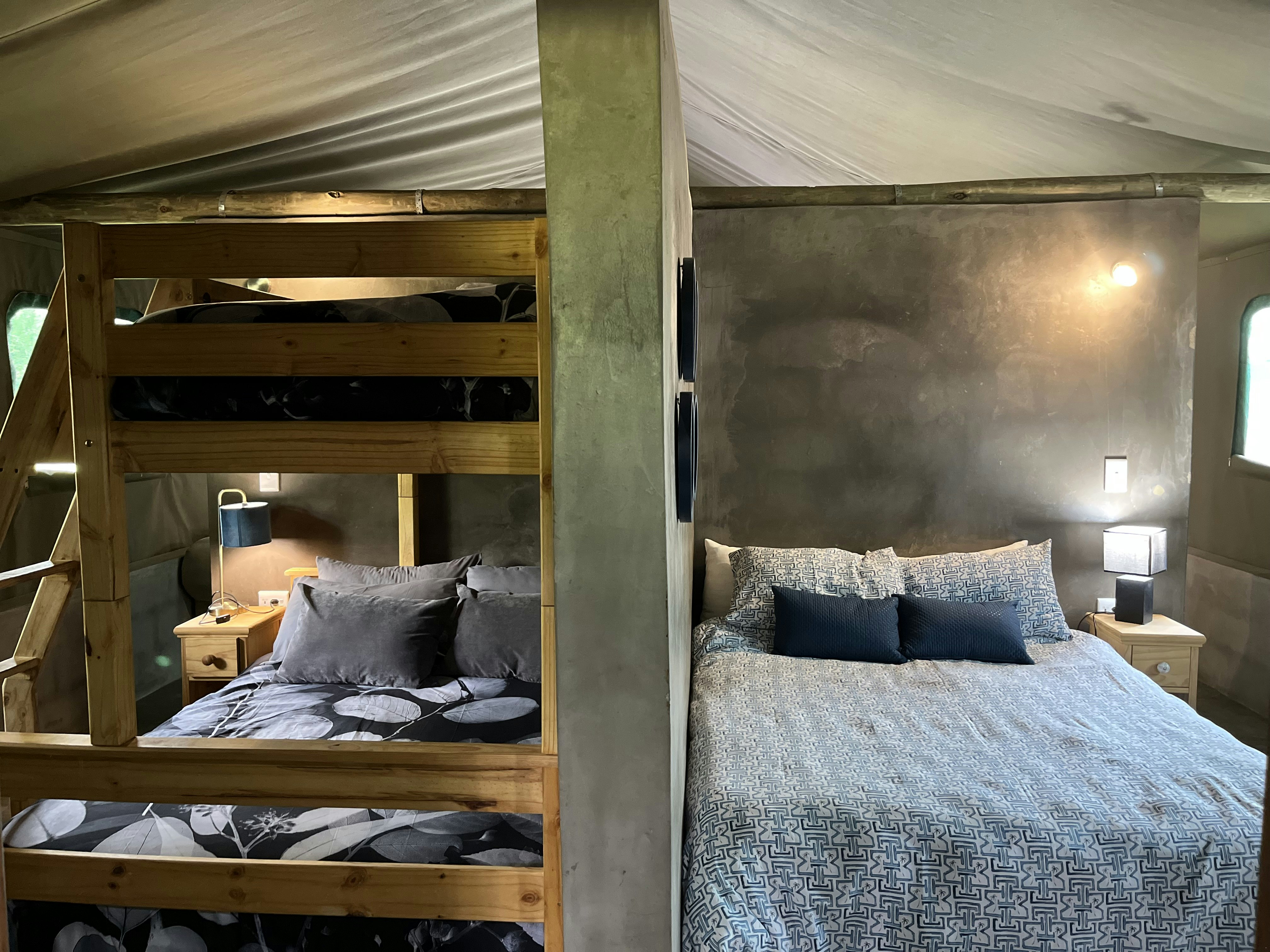Accommodation is available in 3 different units as well as the Mini Glamping Tents. The Mini Glamping Tents are furnished with 2 single beds and are equipped with a bar fridge, lights, a microwave and a selection of crockery. These tents have access to either private or shared ablution hot-water facilities that are fitted with a shower, toilet and wash basin.