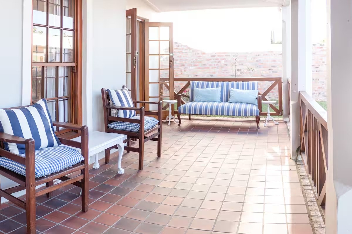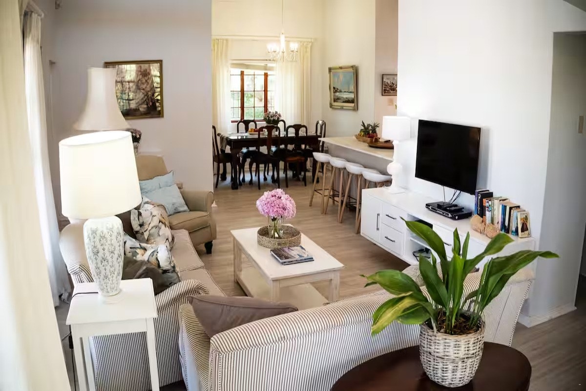 Outside, at the front of the house, guests can enjoy a covered patio with comfortable outdoor seating, perfect for morning coffee while enjoying the peaceful surroundings. At the back, another covered patio features a dining area ideal for alfresco meals, with easy access to the braai area. Secure parking is available, and the central location offers convenient access to a variety of local restaurants and amenities.