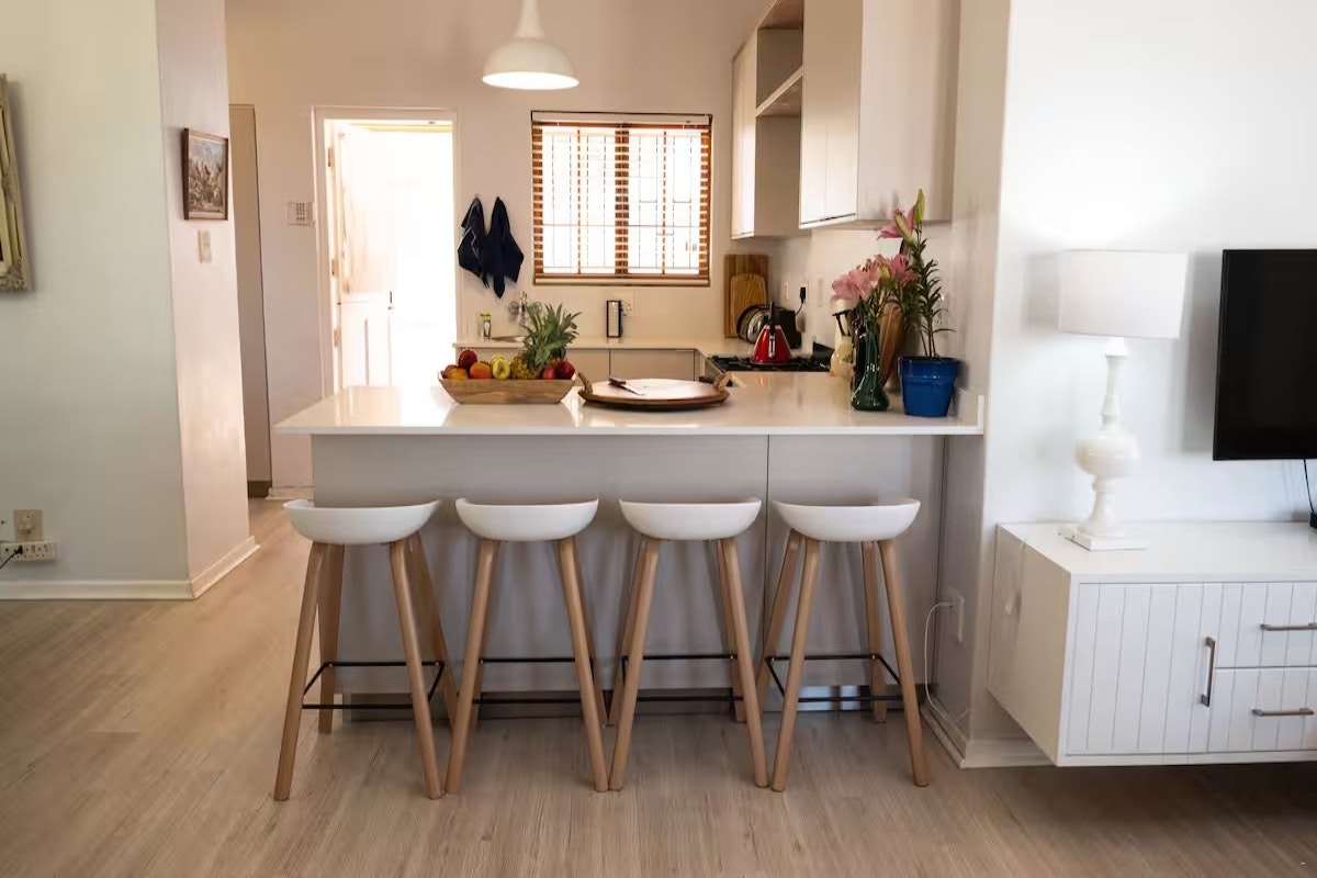 The light and airy living area includes a kitchen equipped with a fridge-freezer, gas stove, microwave, cutlery and crockery, tea- and coffee-making facilities, and a breakfast bar with stools. A washing machine and dishwasher are also available for added convenience. Adjacent to the kitchen is a comfortably furnished lounge with a Smart TV offering Netflix streaming, and complimentary Wi-Fi is available throughout the house. The lounge flows into a dining area with a 6-seater table where guests can enjoy meals together. A second fully equipped kitchen is also provided.