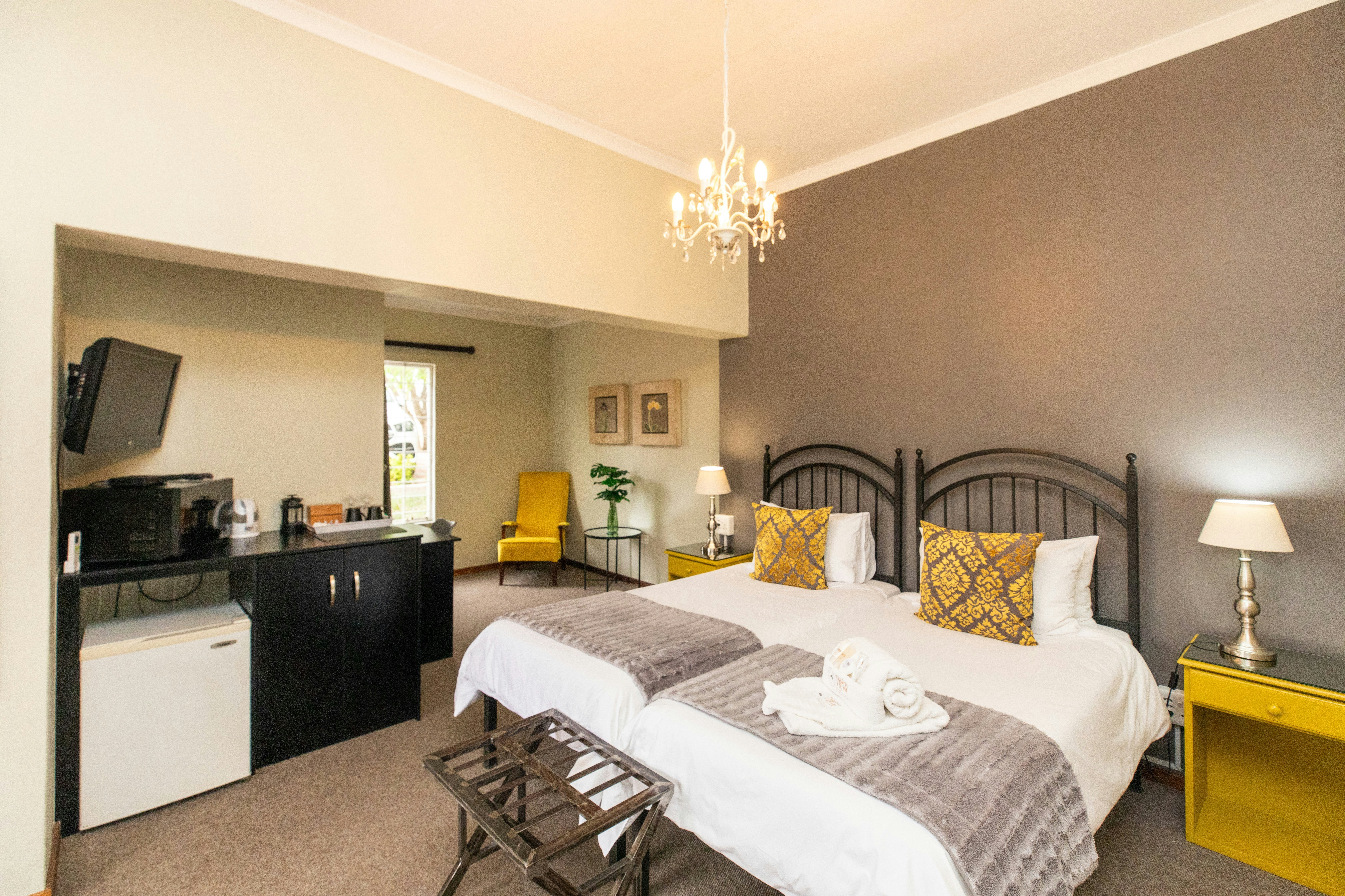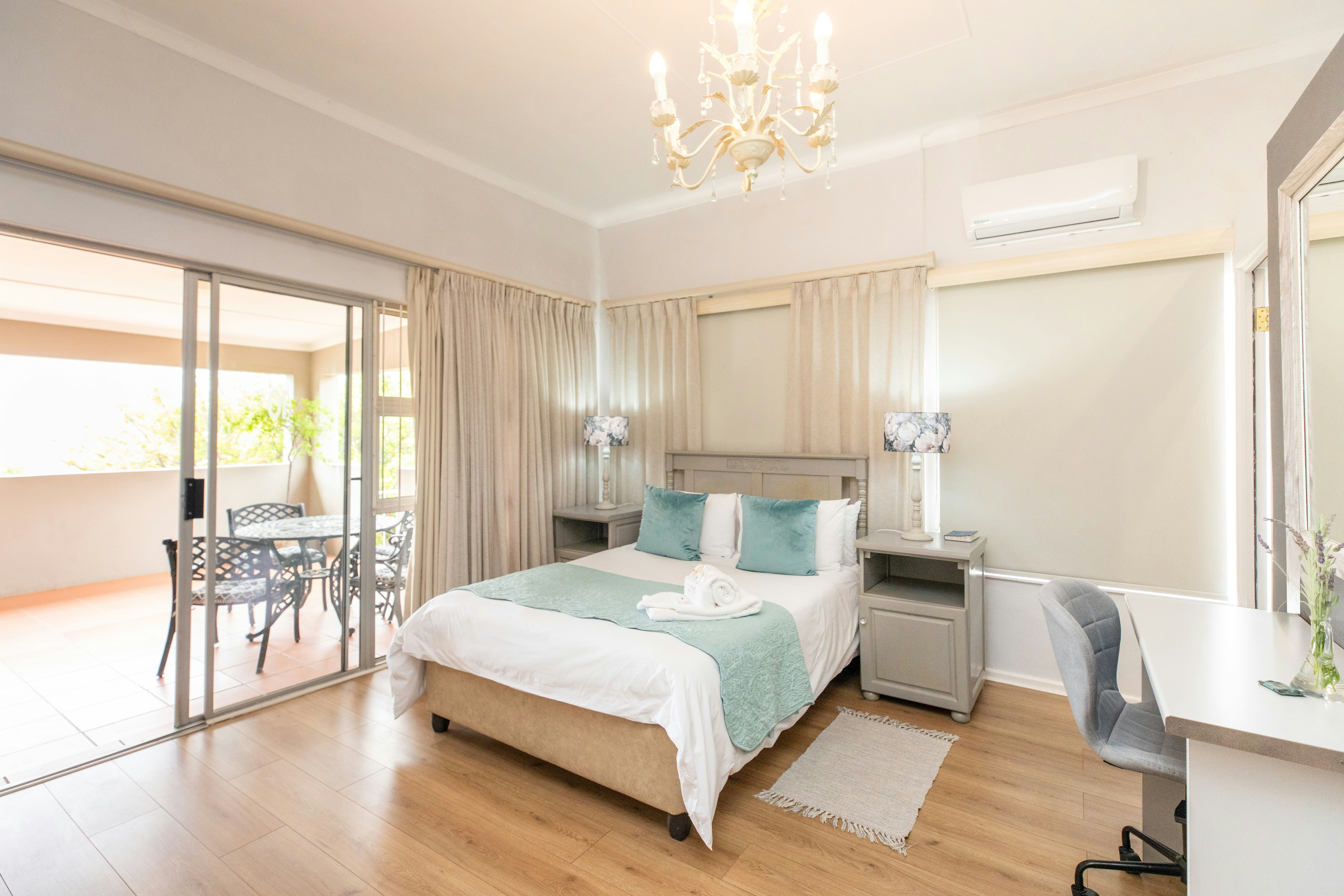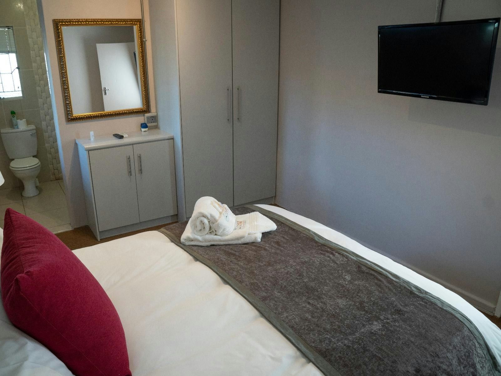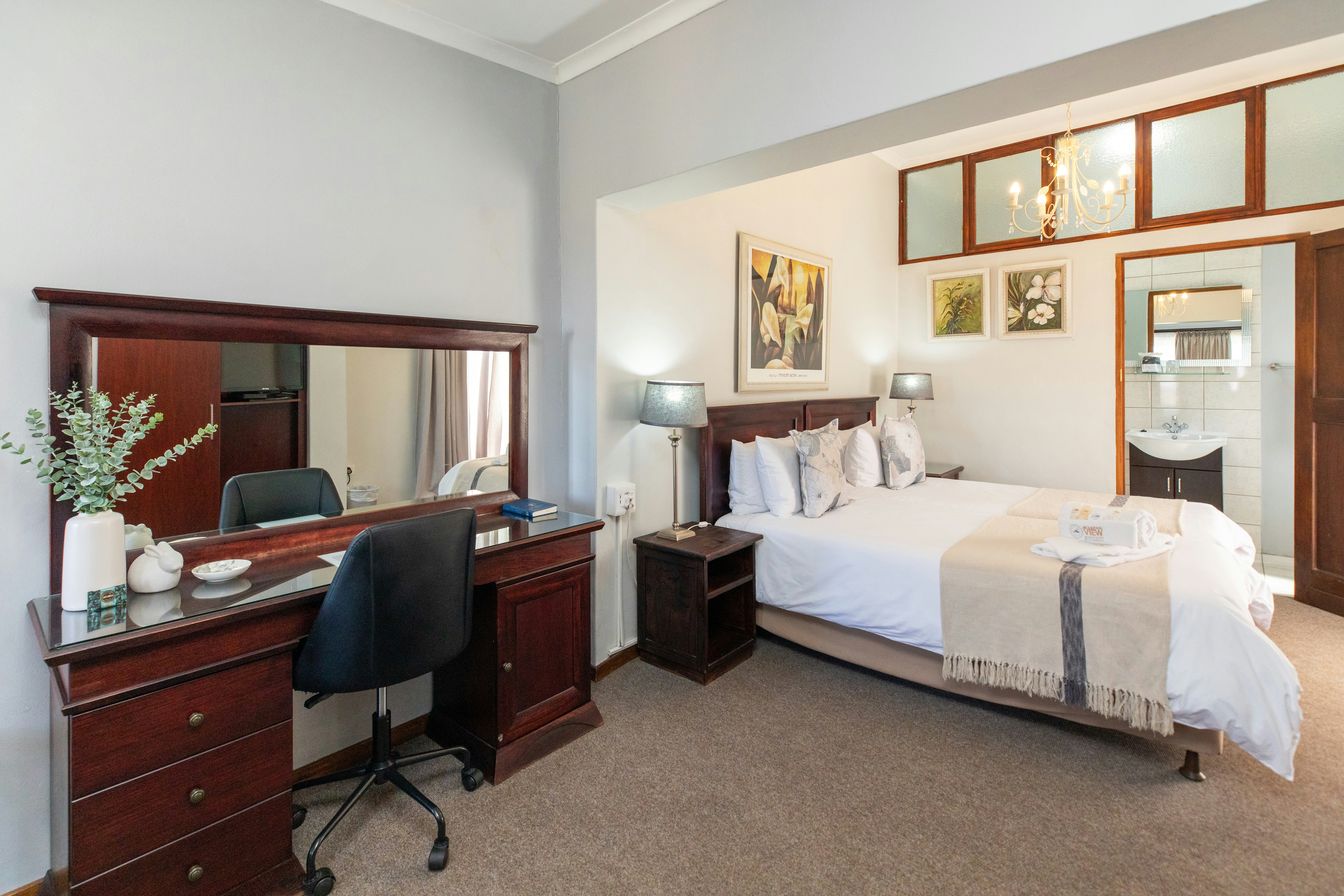 The guest house accommodates up to 26 guests in 12 guest rooms with private entrances and en-suite bathrooms. There are 5 bedrooms furnished with a double bed, 2 bedrooms furnished with a king-size bed and 6 bedrooms fitted with twin single beds which can be converted to king-size beds. The en-suite bathrooms are fitted with either a shower or a bath, basin and toilet. Other facilities include a tea- and coffee-making station, a bar fridge and a TV with selected DStv channels.