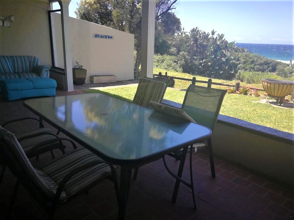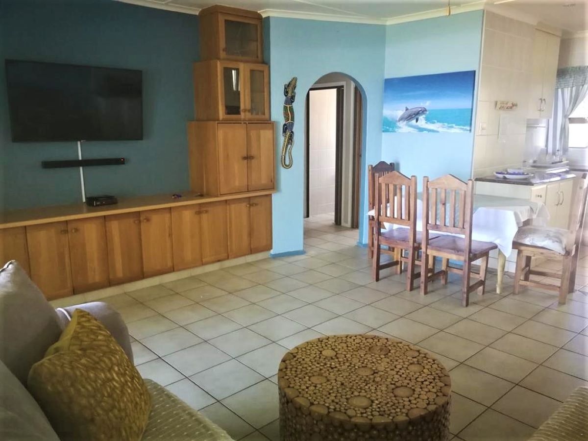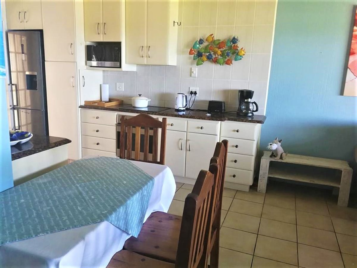 The kitchen is open-plan to the dining and living areas and is well-equipped with a fridge-freezer, microwave, oven, stove, dishwasher, cutlery, crockery, and tea- and coffee-making facilities. The living area features a TV, a dining table, and comfortable seating opening onto the covered patio. On the patio, guests will find outdoor seating and braai facilities with stunning ocean views.