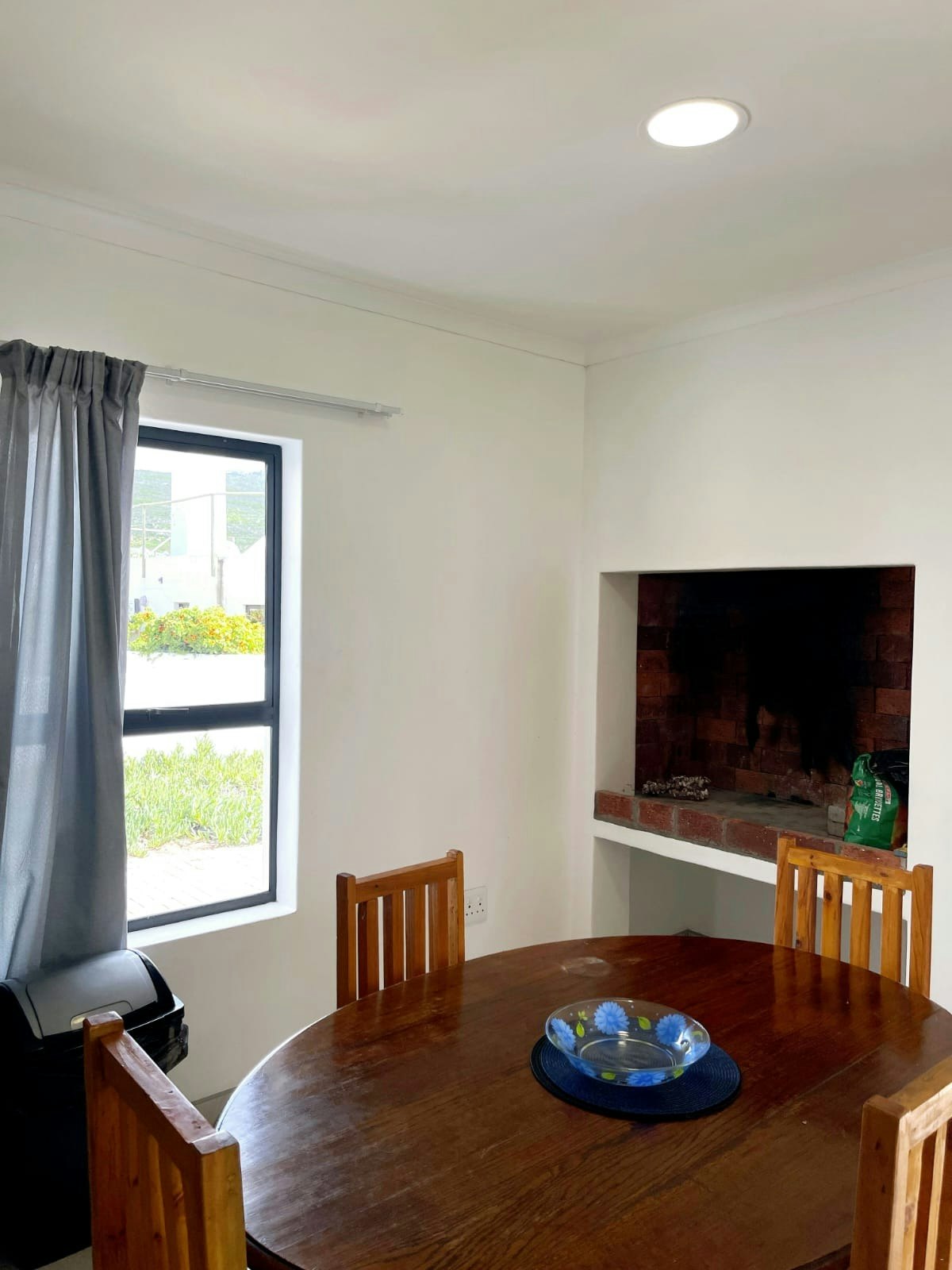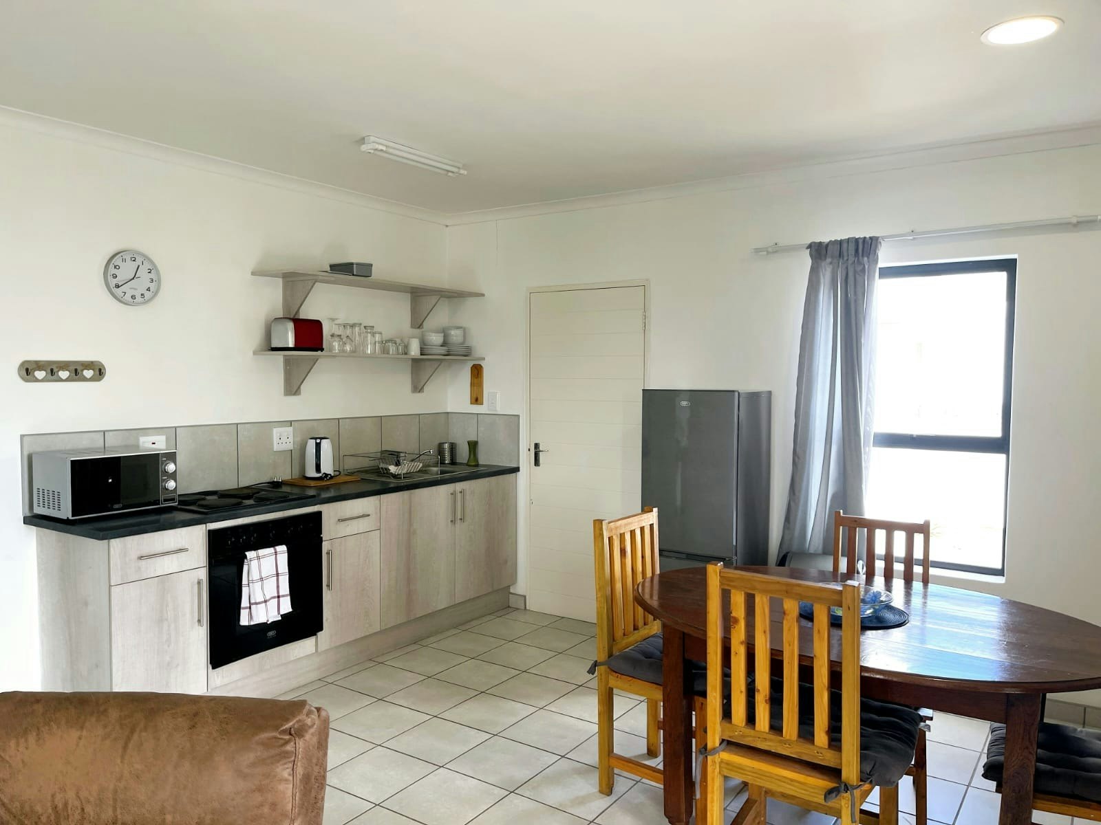 The open-plan living area includes a kitchenette equipped with a stove, oven, microwave, fridge-freezer, kettle, cutlery, and crockery. The spacious lounge and dining area offer comfortable seating for relaxation and dining, featuring an indoor braai. A round table is available in the kitchen, and there’s a TV in the lounge.
