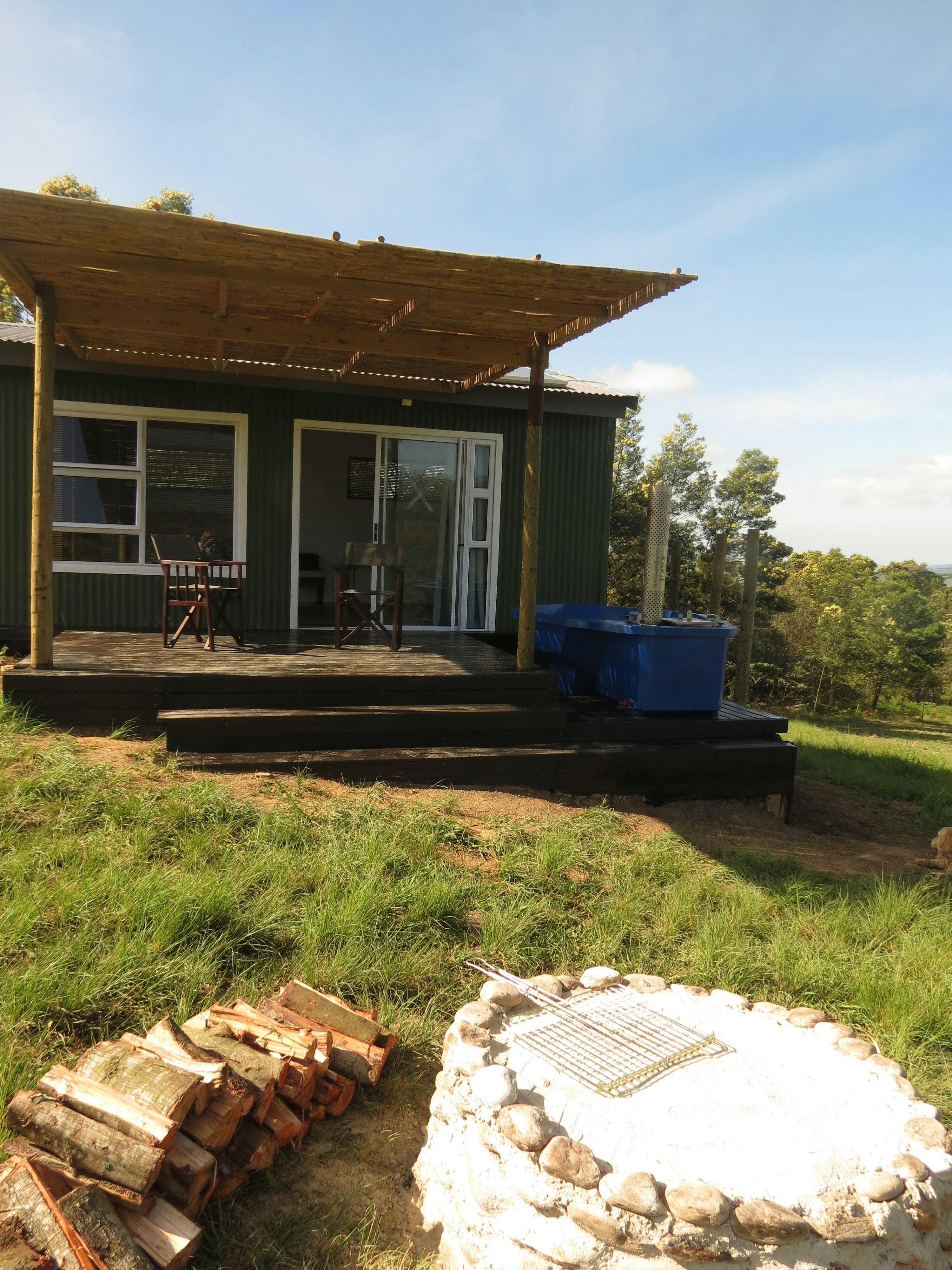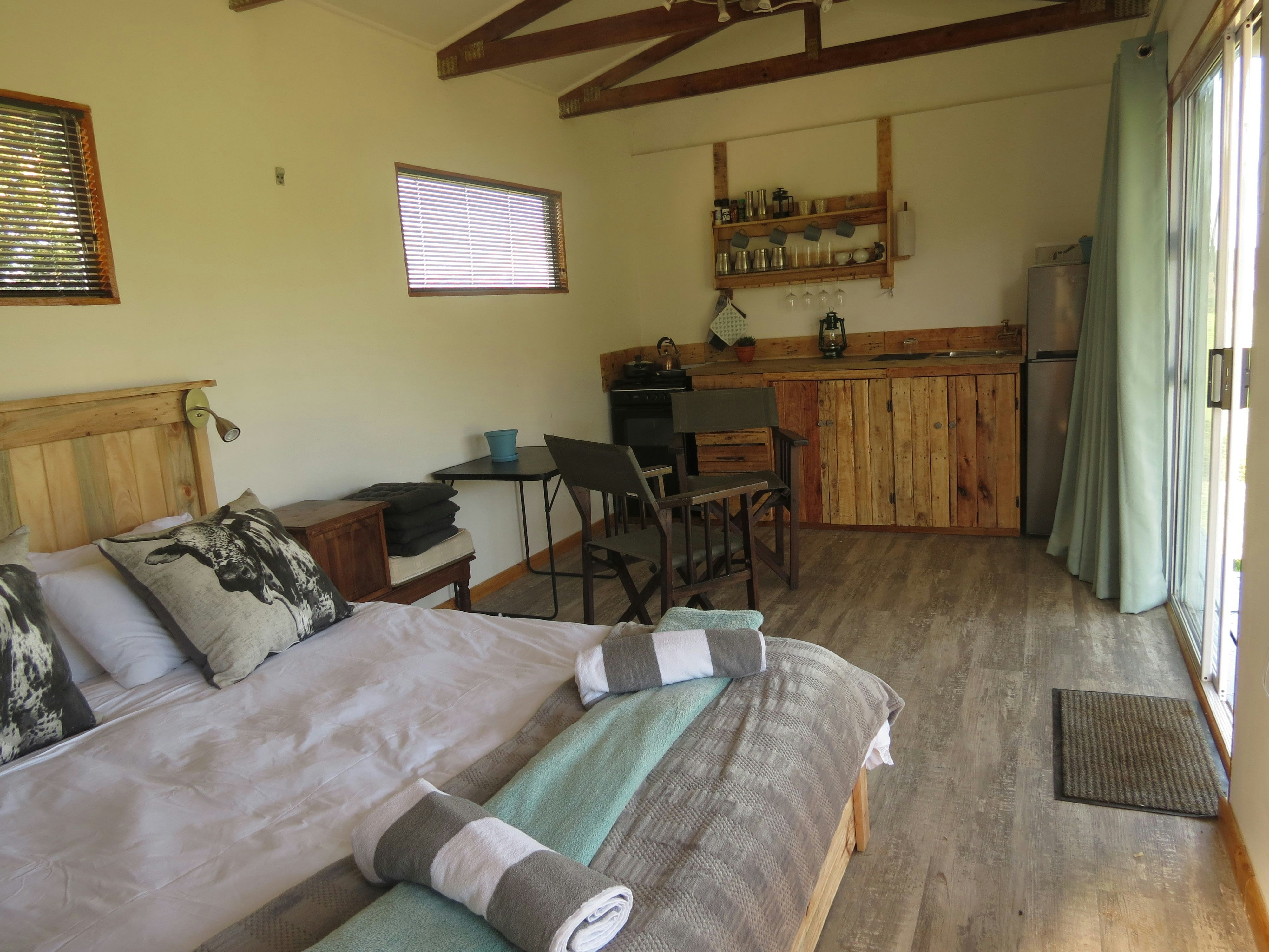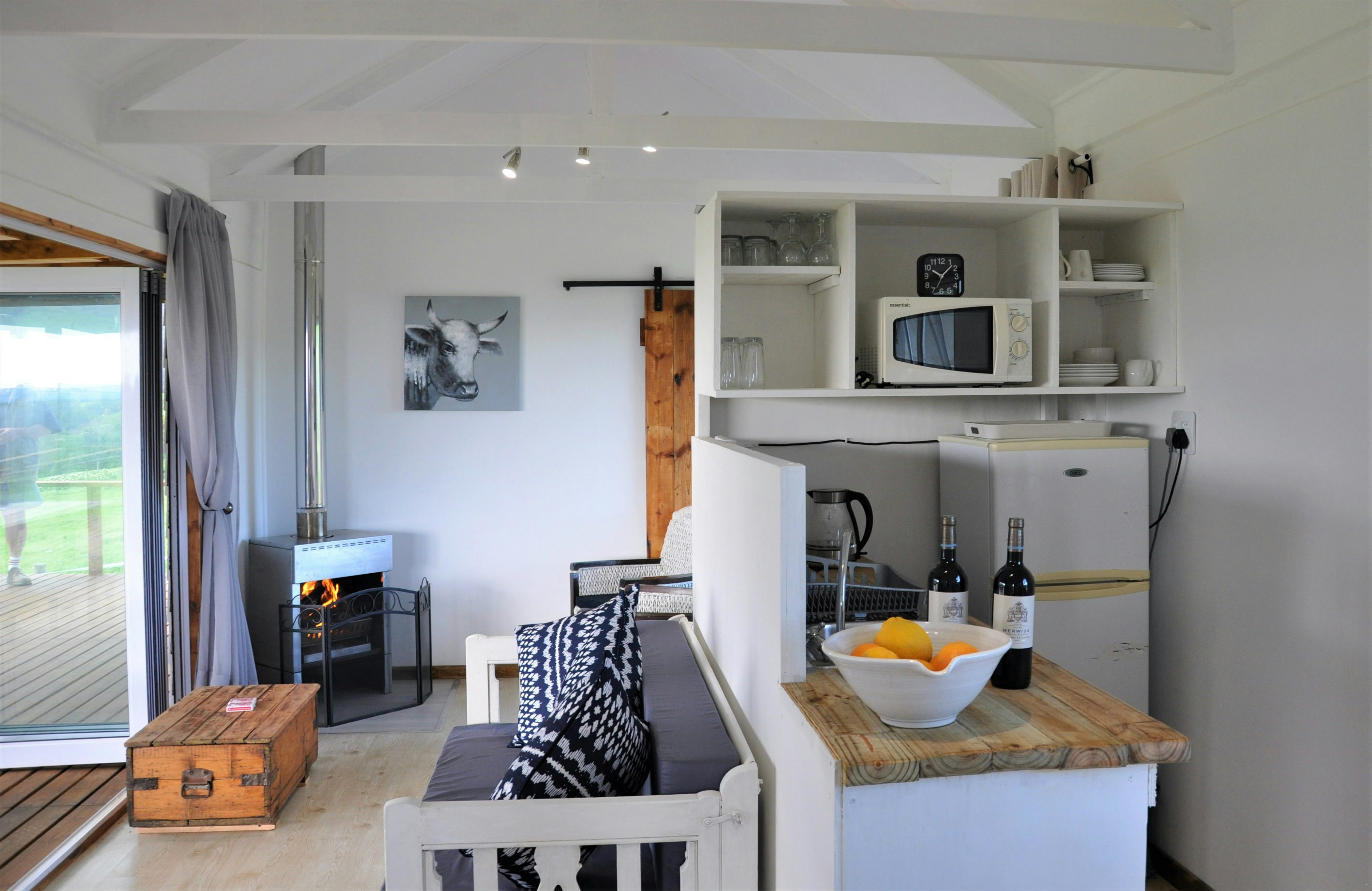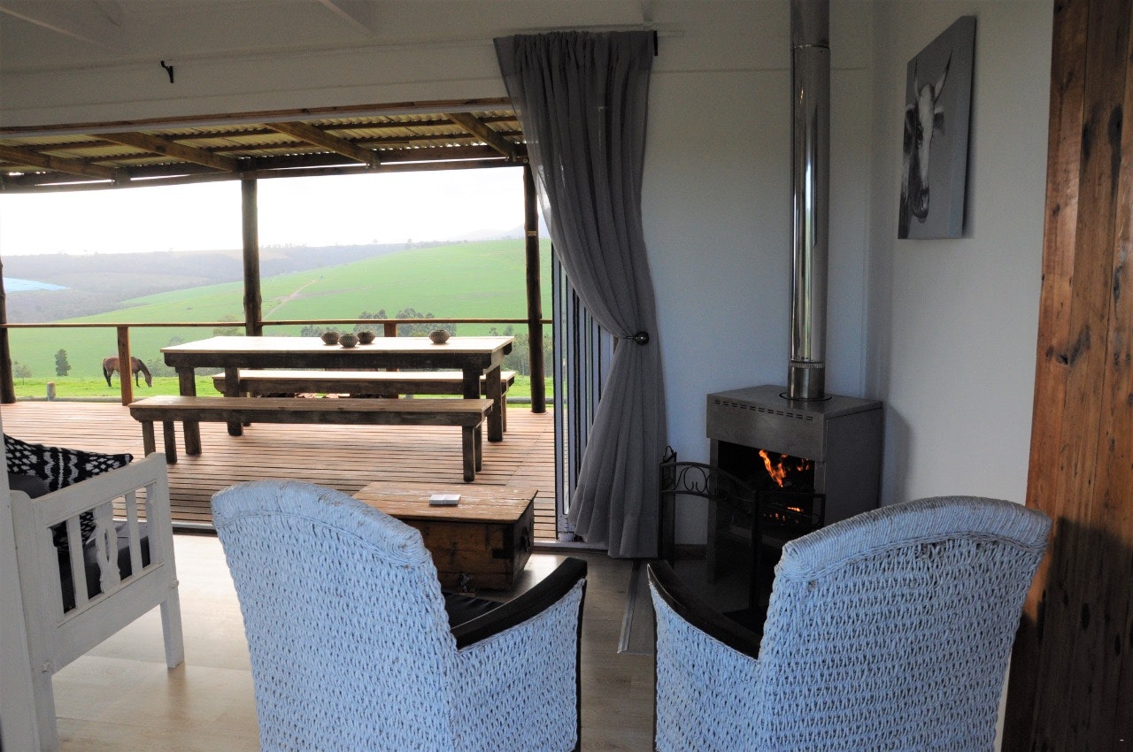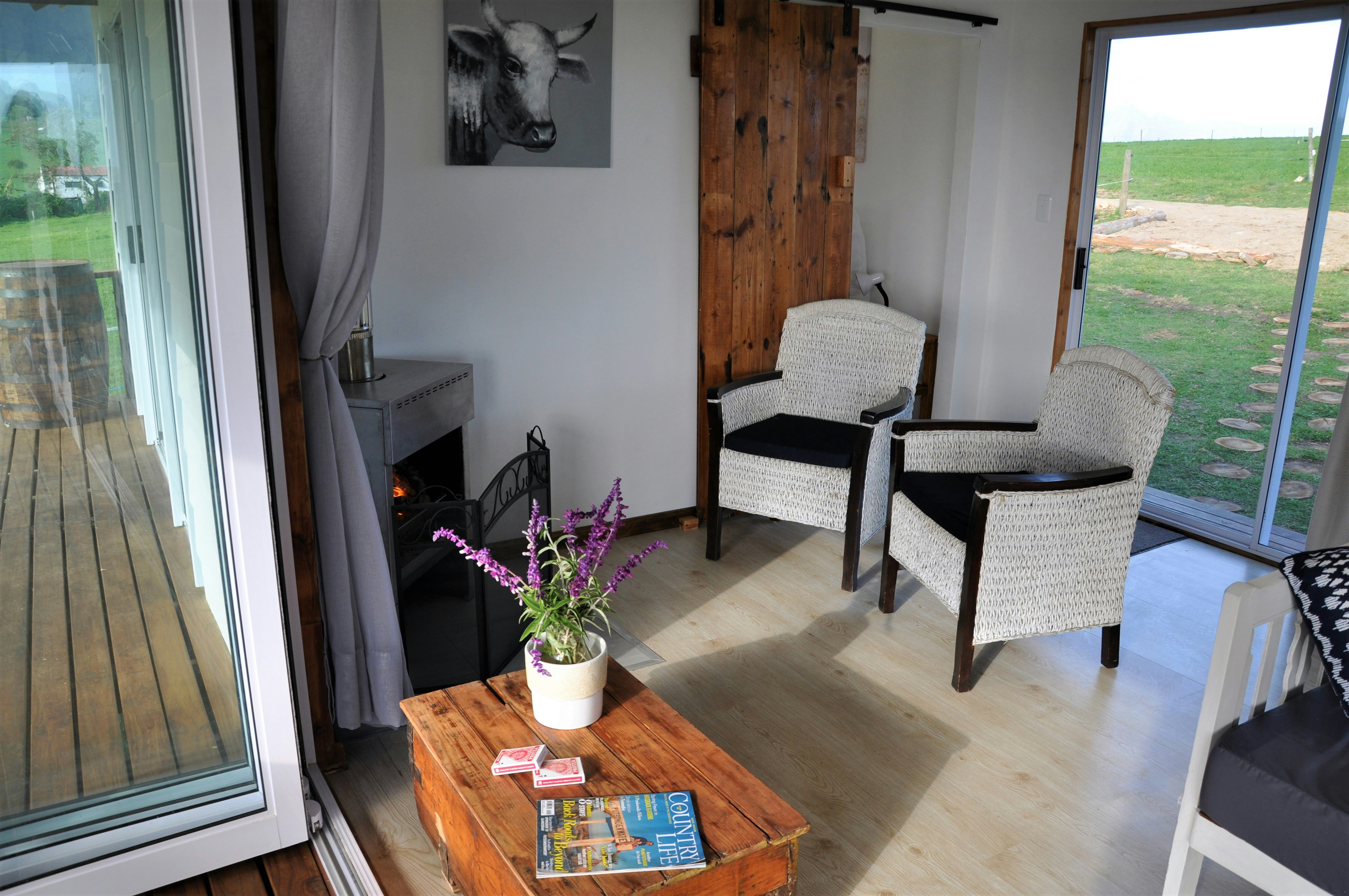 The lounges have a wood-burning fireplace and also features stack doors that open onto the verandah, which boasts an outdoor table with benches, a kettle braai facility, and picturesque views of the farm and valley to admire.