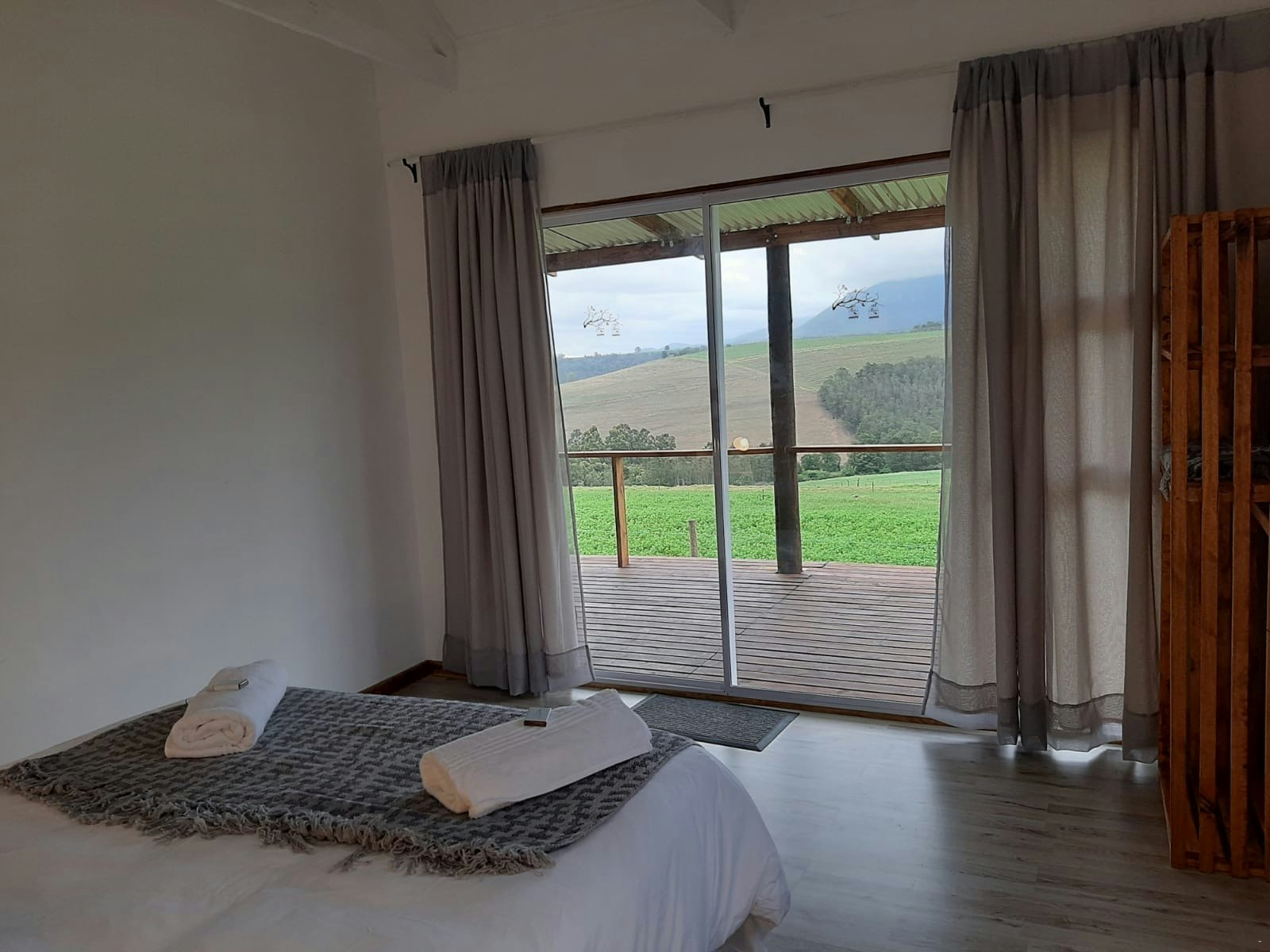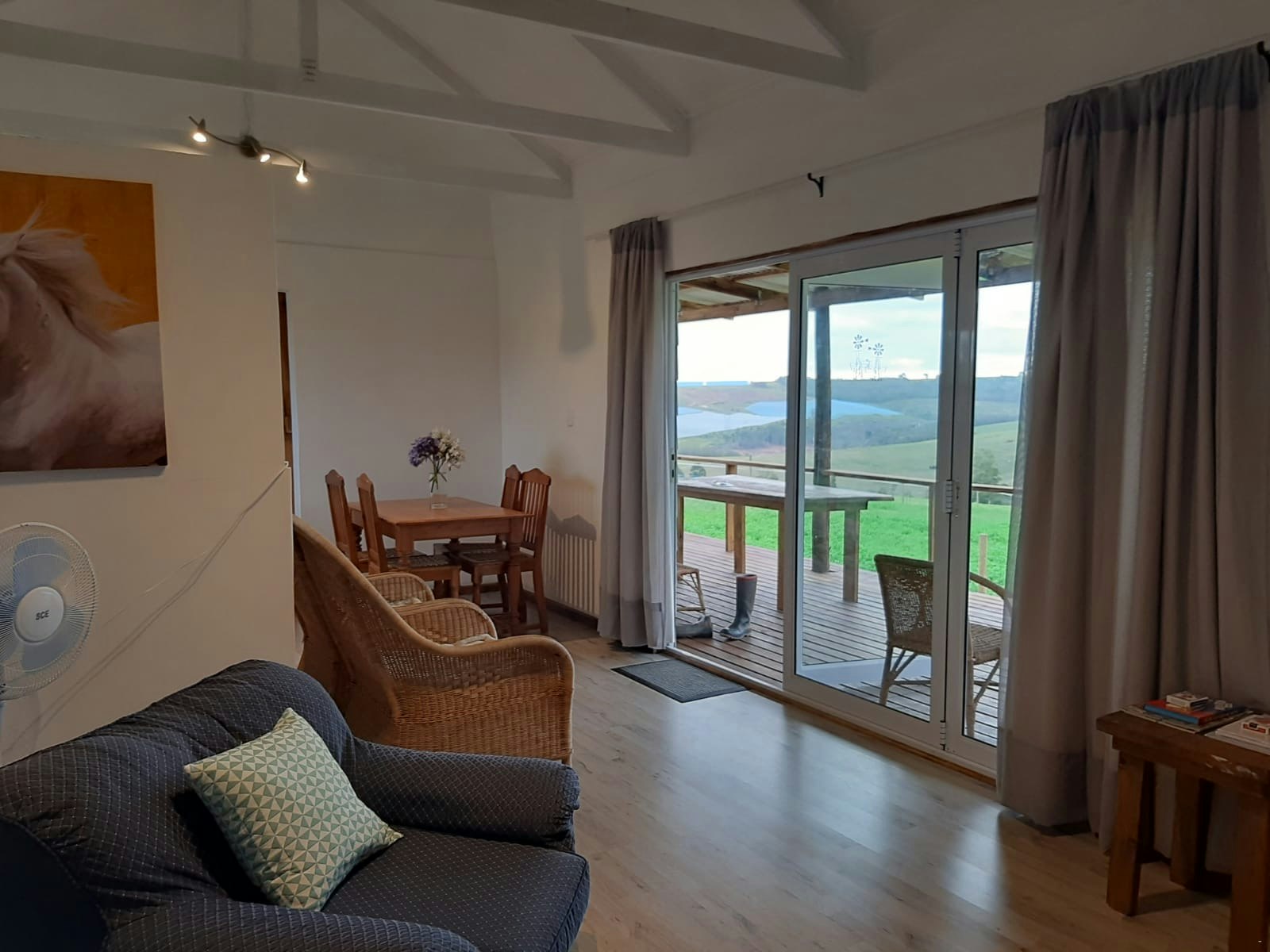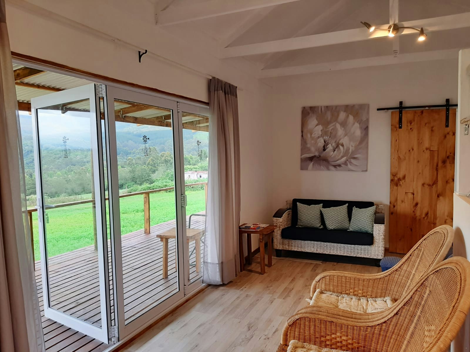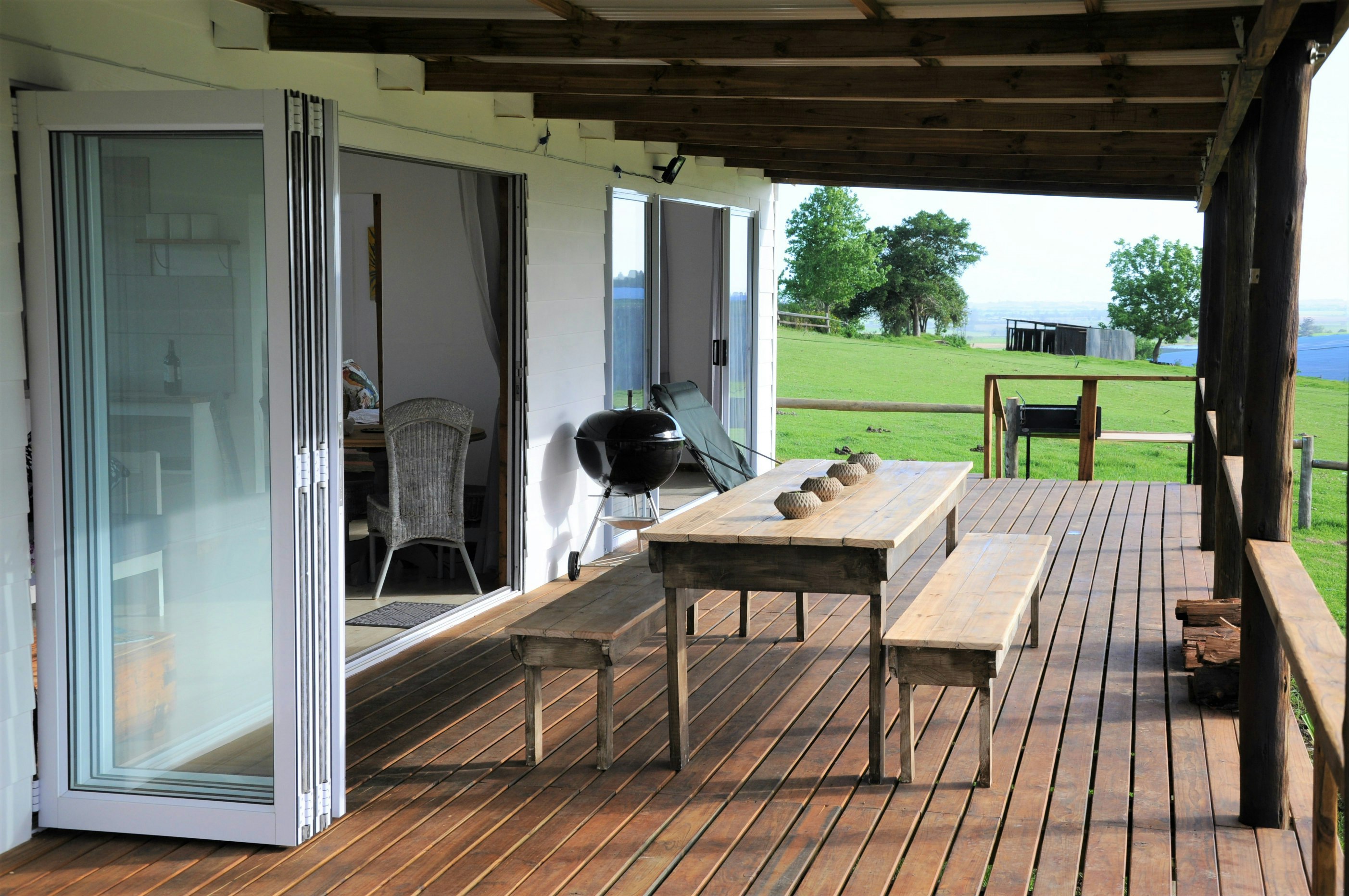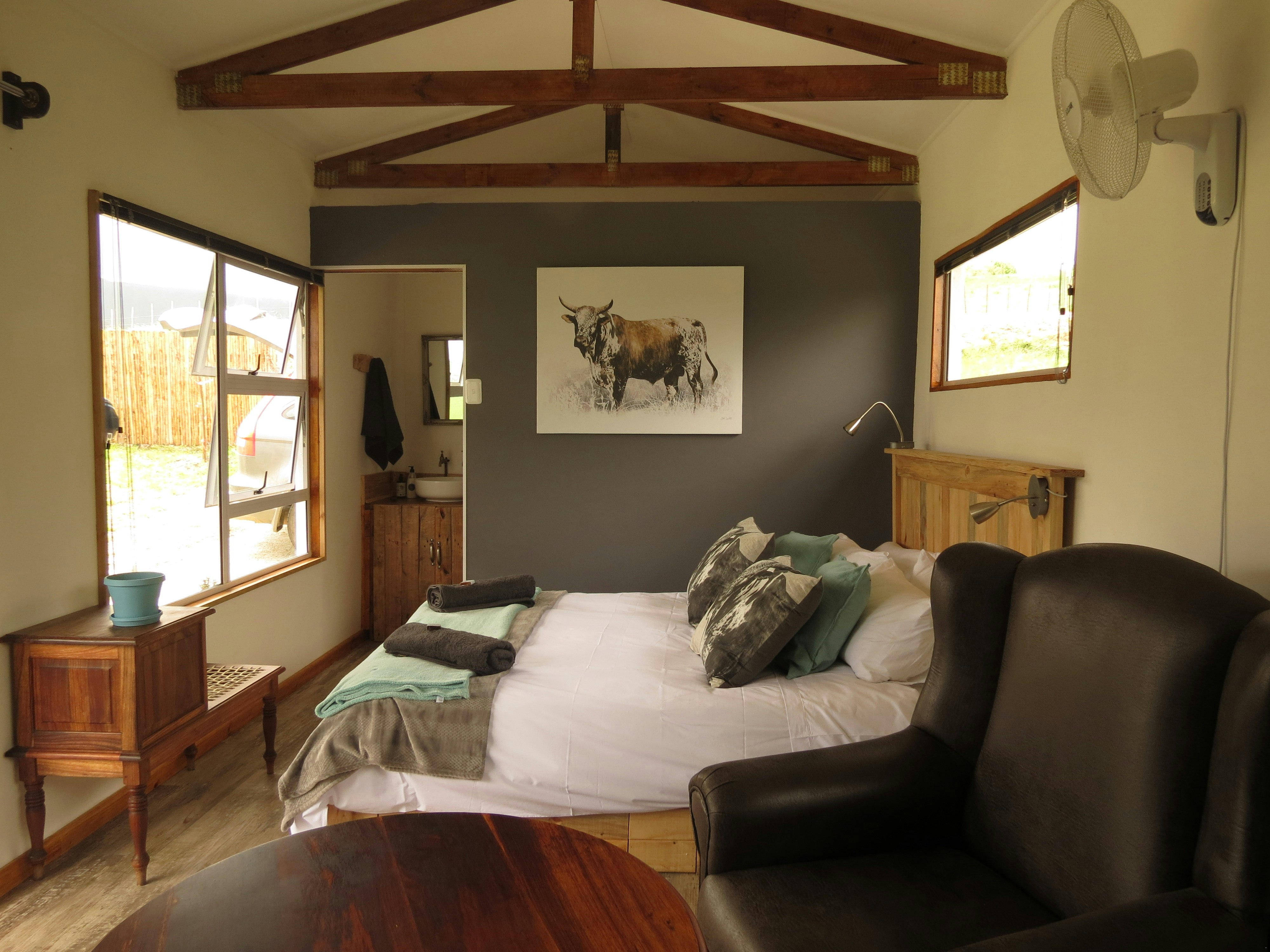 The lounges have a wood-burning fireplace and also features stack doors that open onto the verandah, which boasts an outdoor table with benches, a kettle braai facility, and picturesque views of the farm and valley to admire.