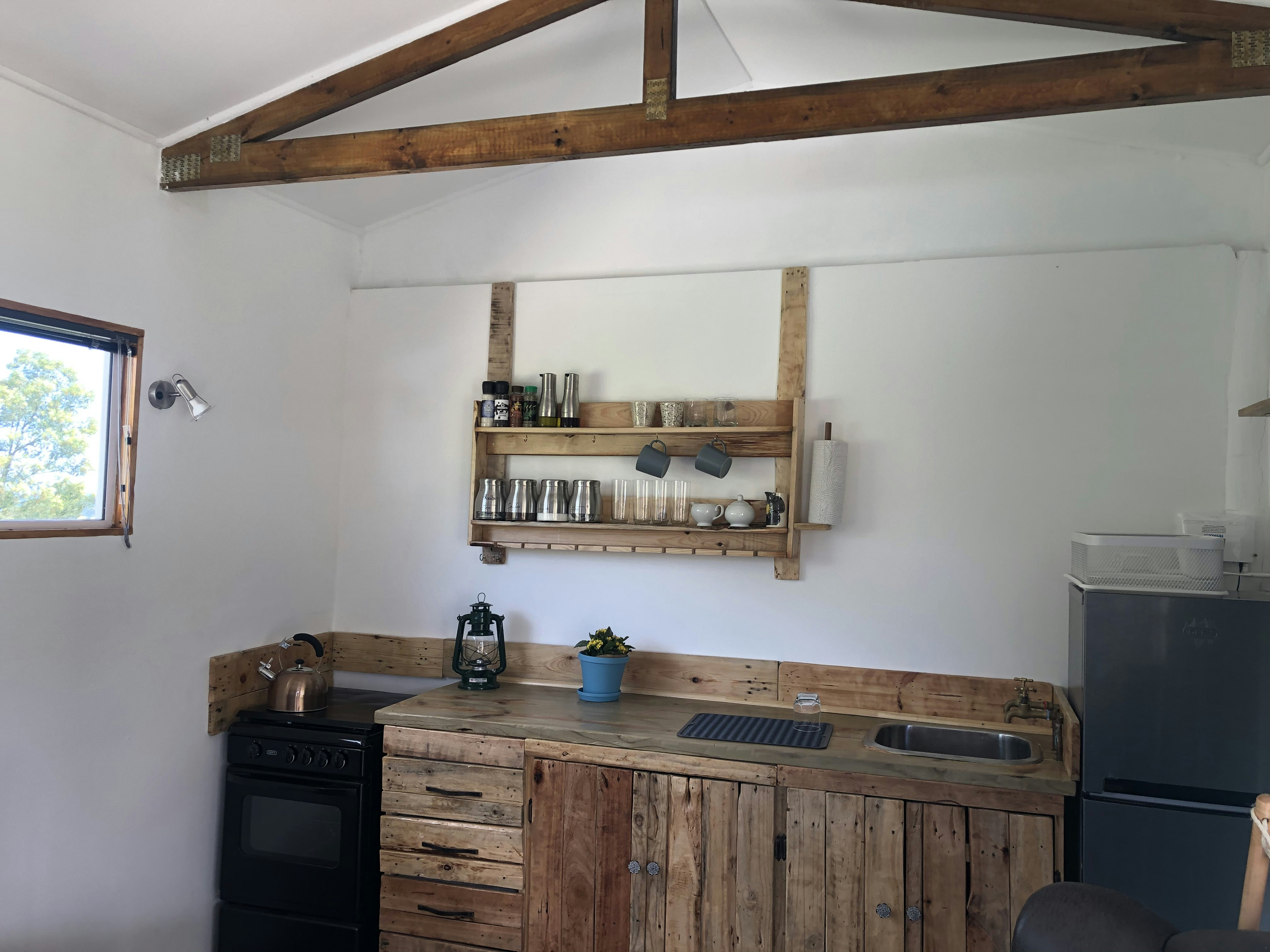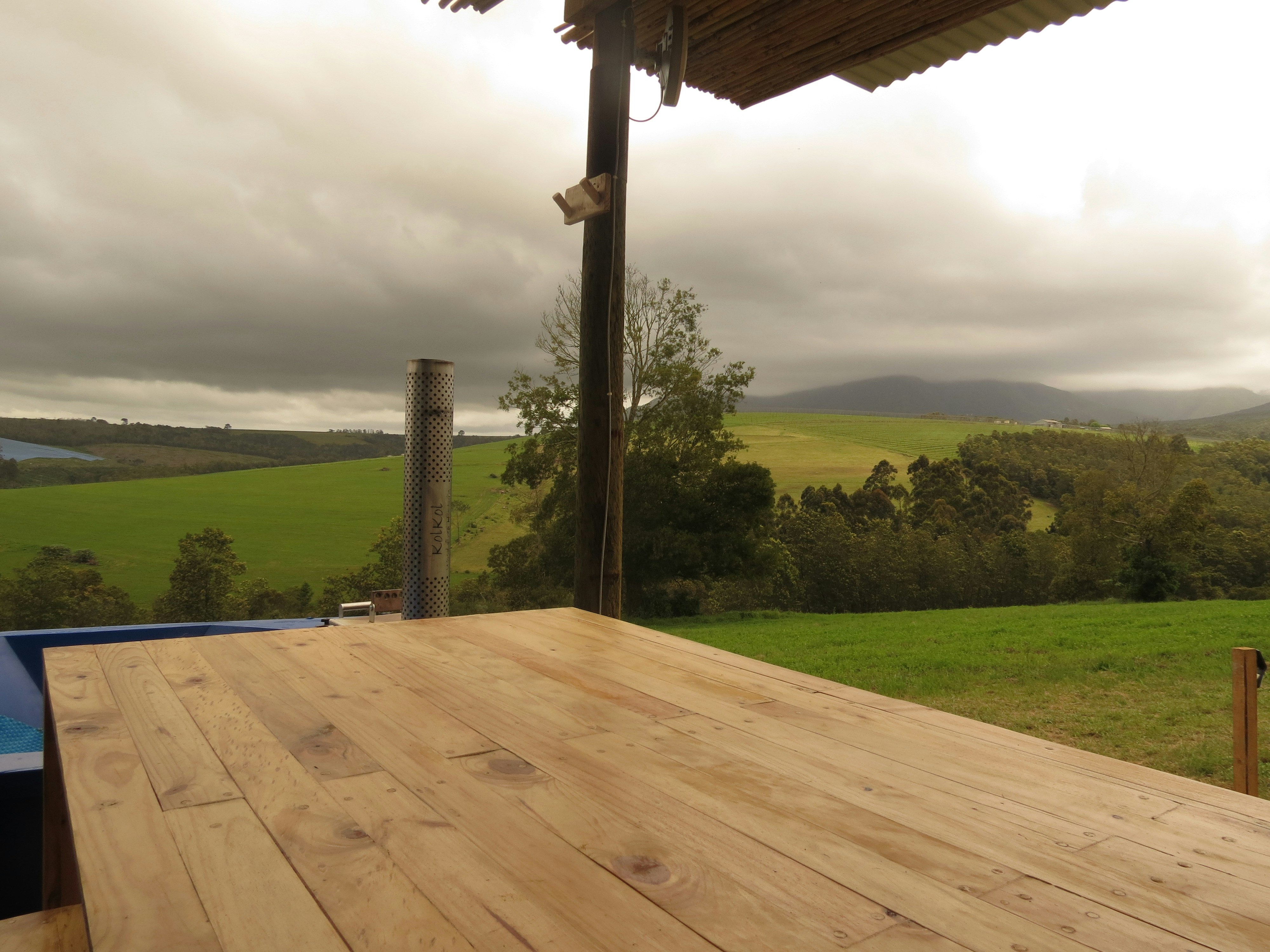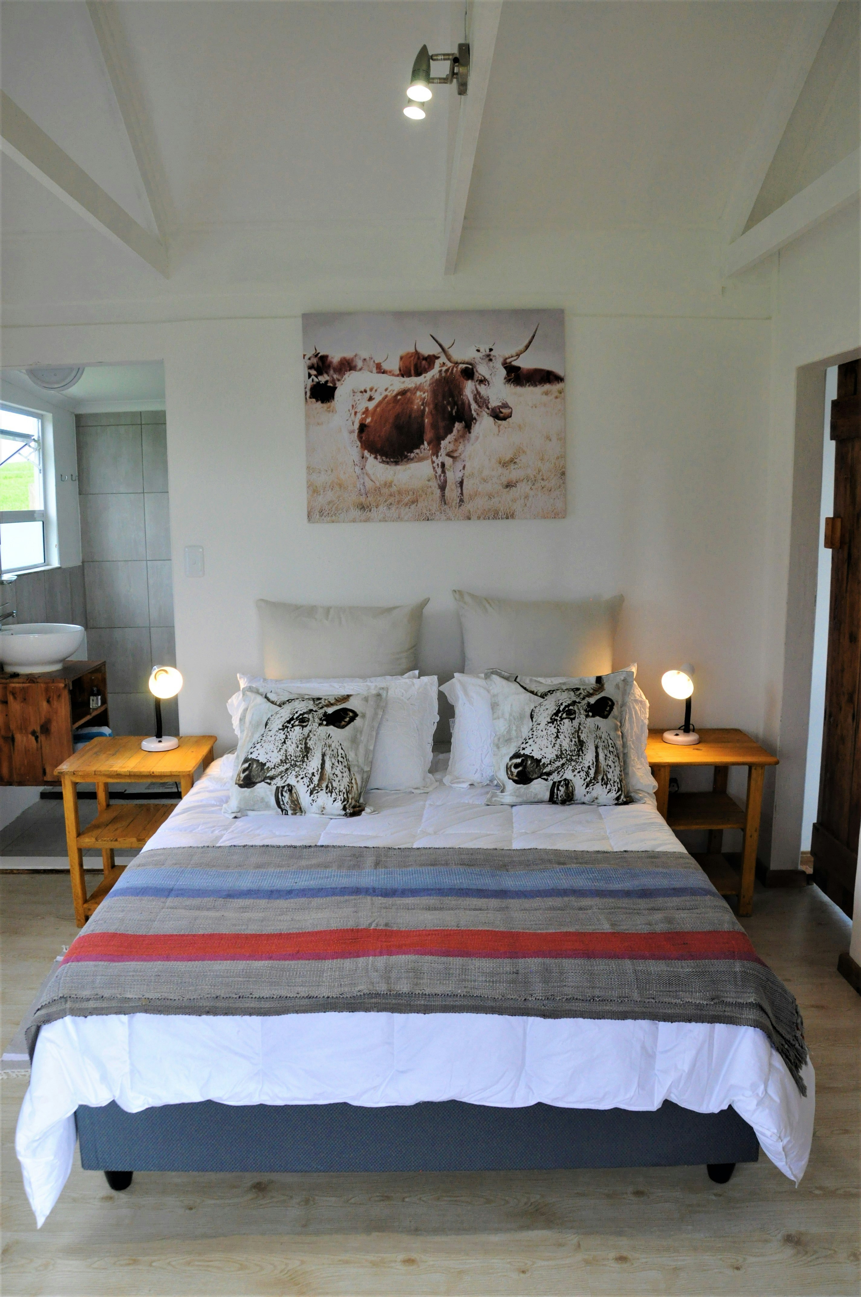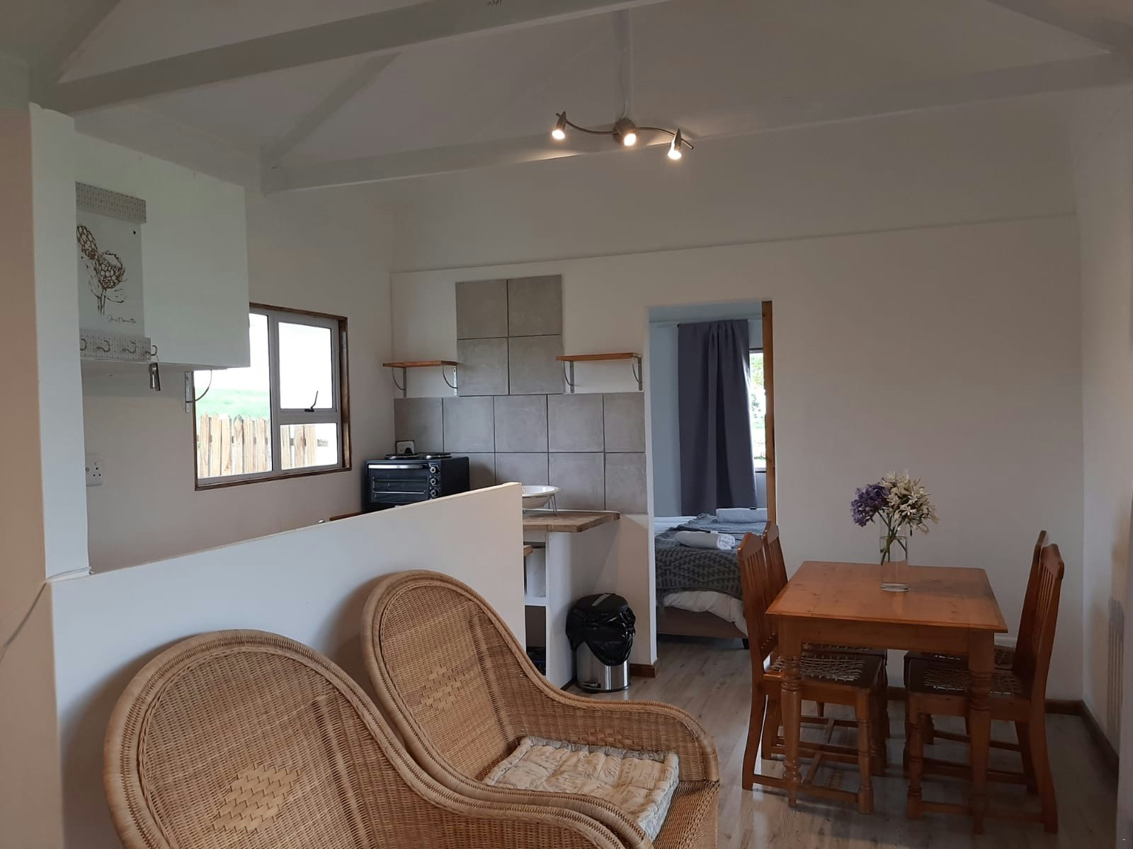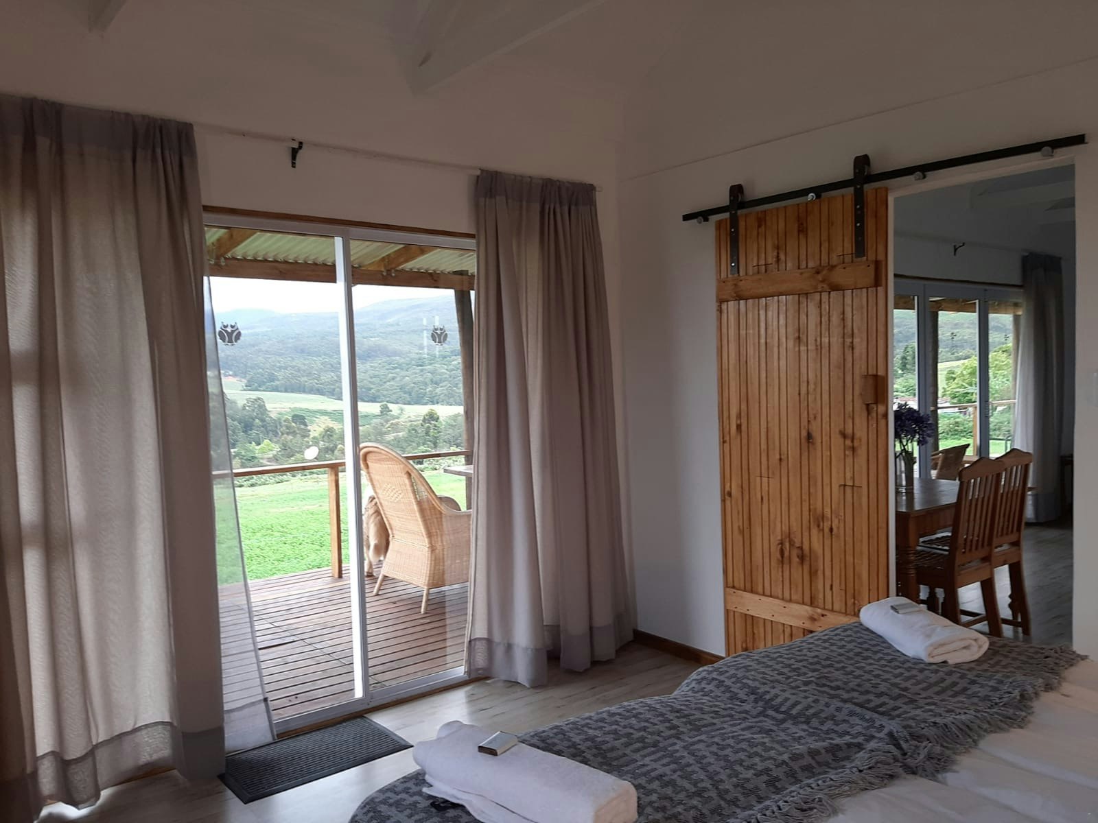 The lounges have a wood-burning fireplace and also features stack doors that open onto the verandah, which boasts an outdoor table with benches, a kettle braai facility, and picturesque views of the farm and valley to admire.