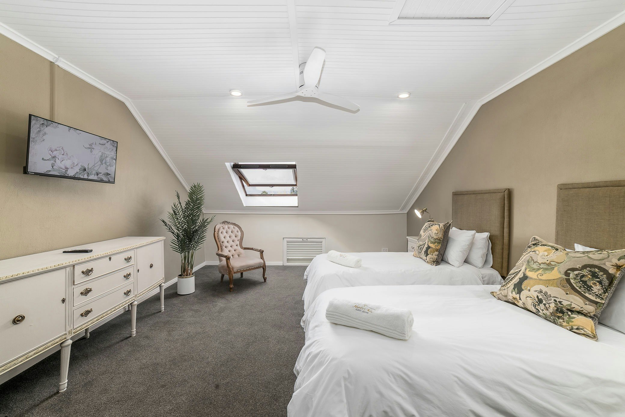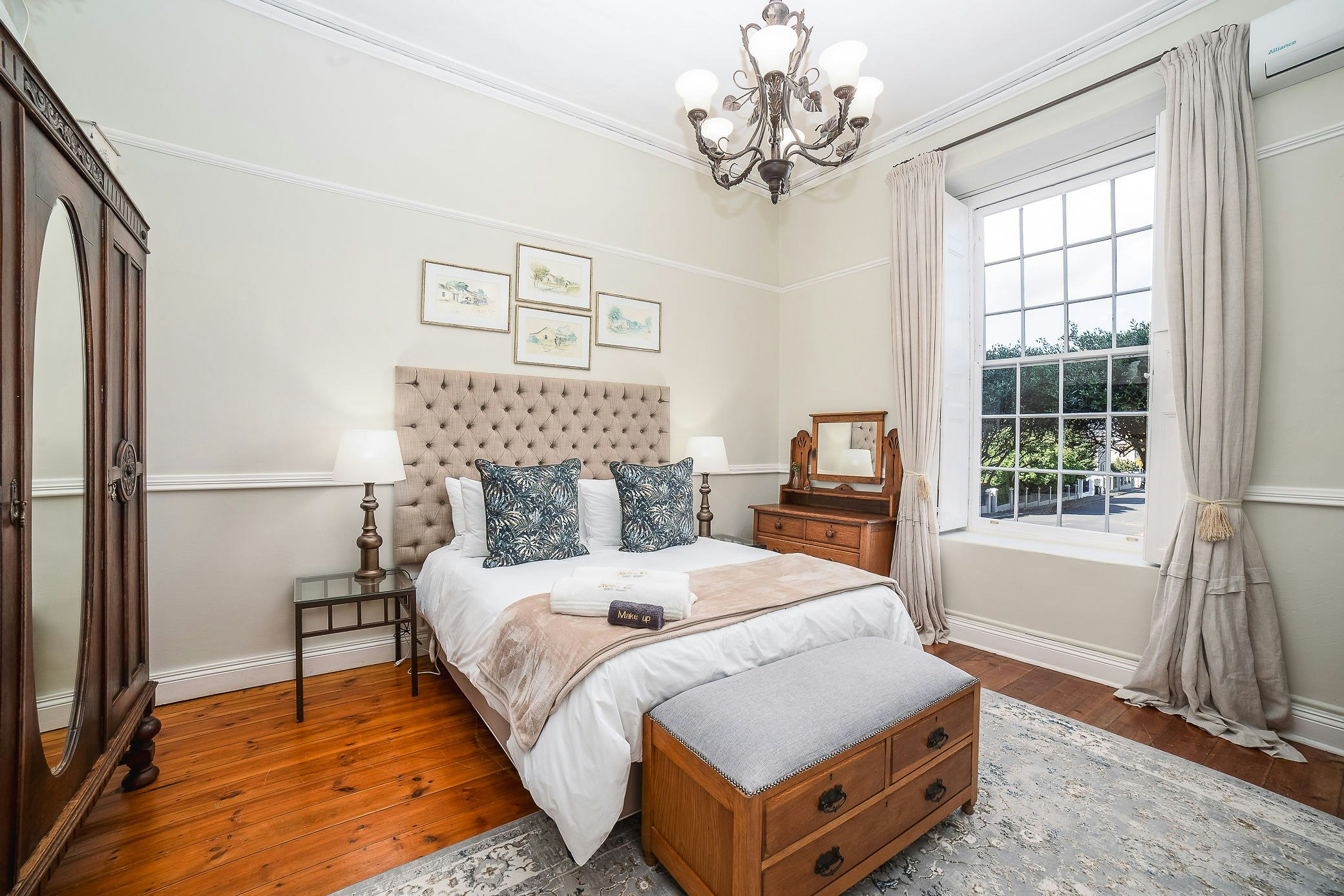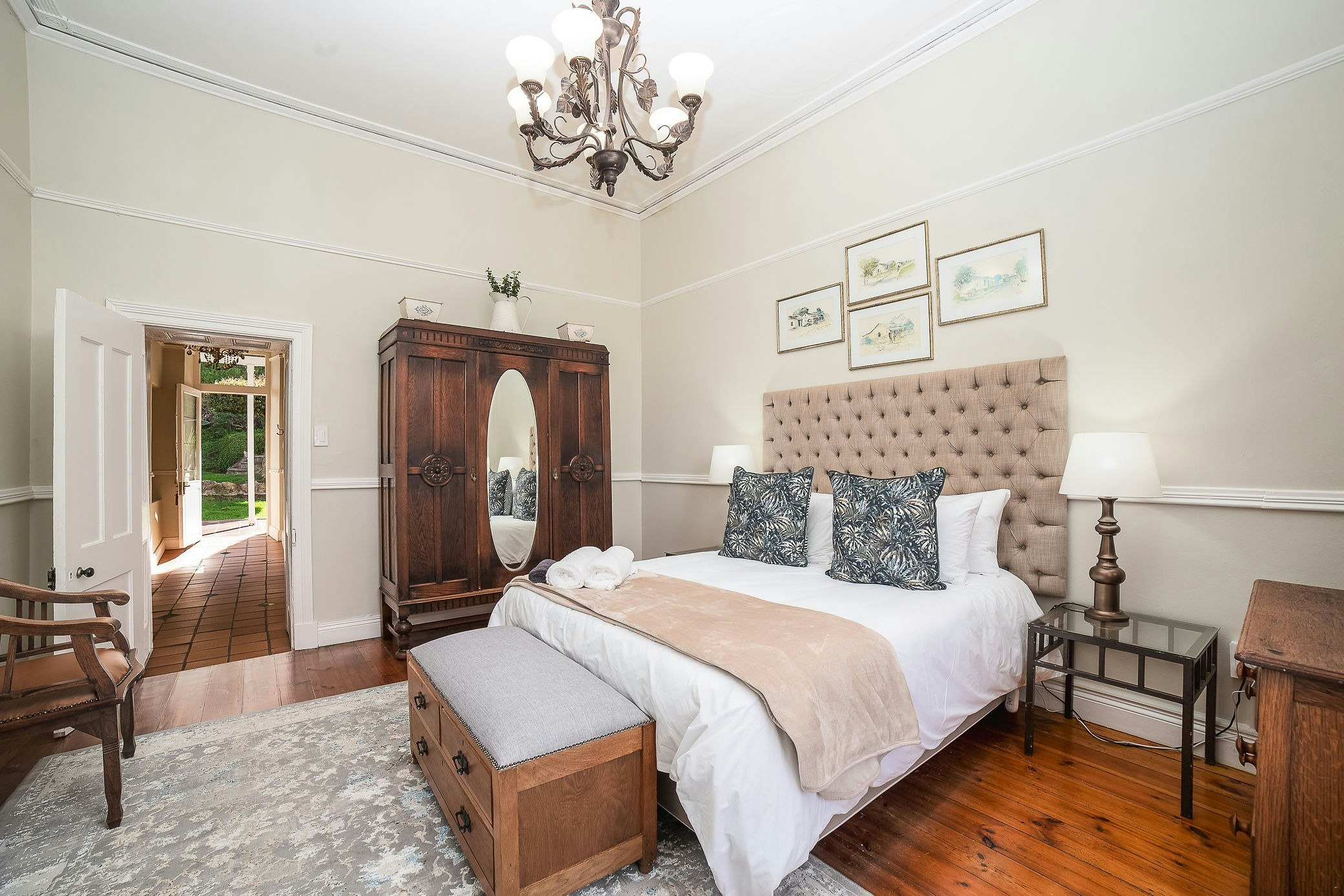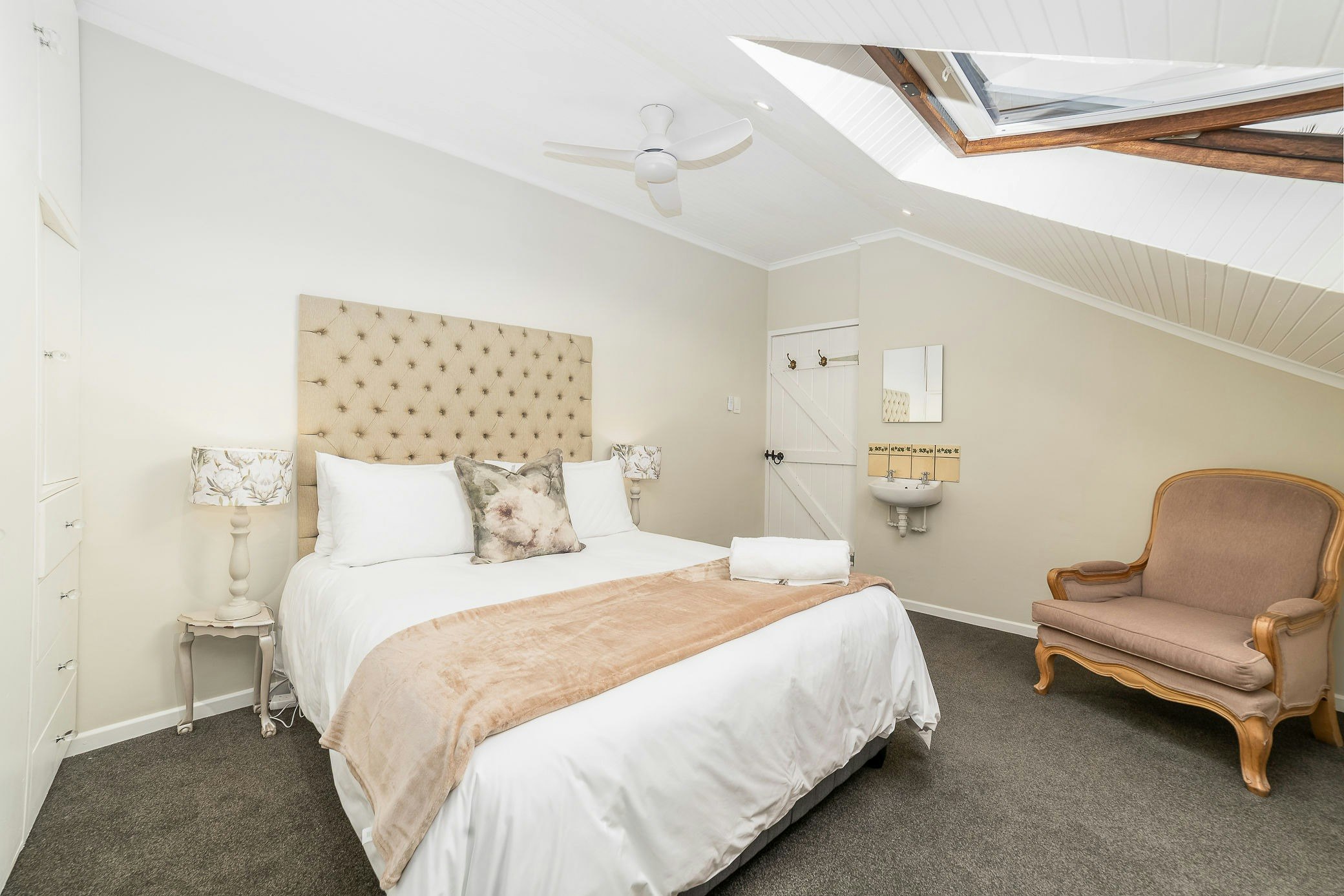 Grondvloer – 4 elegante en suite-koninginkamers, plus 'n bekoorlike selfsorg-tuinkothuis met 'n kombuisie. Gaste geniet ook 'n volledig toegeruste gemeenskaplike kombuis, binnekaggel, buitebraai, welige tuin en plonspoel.