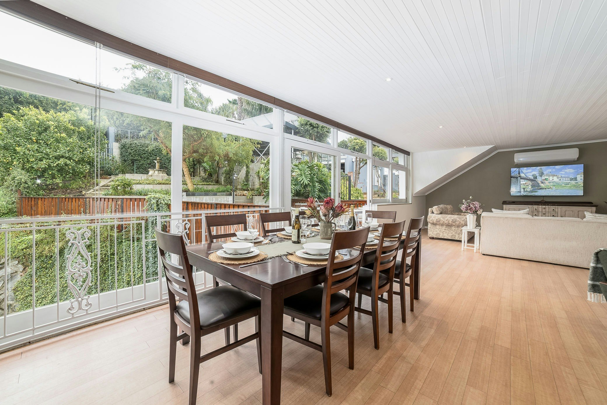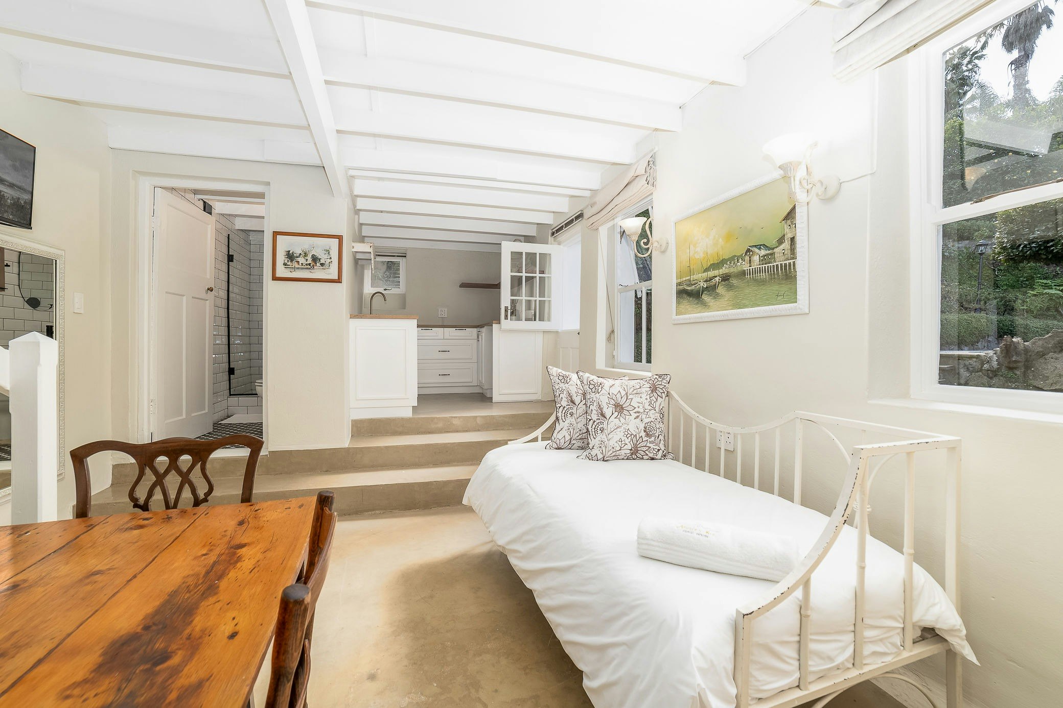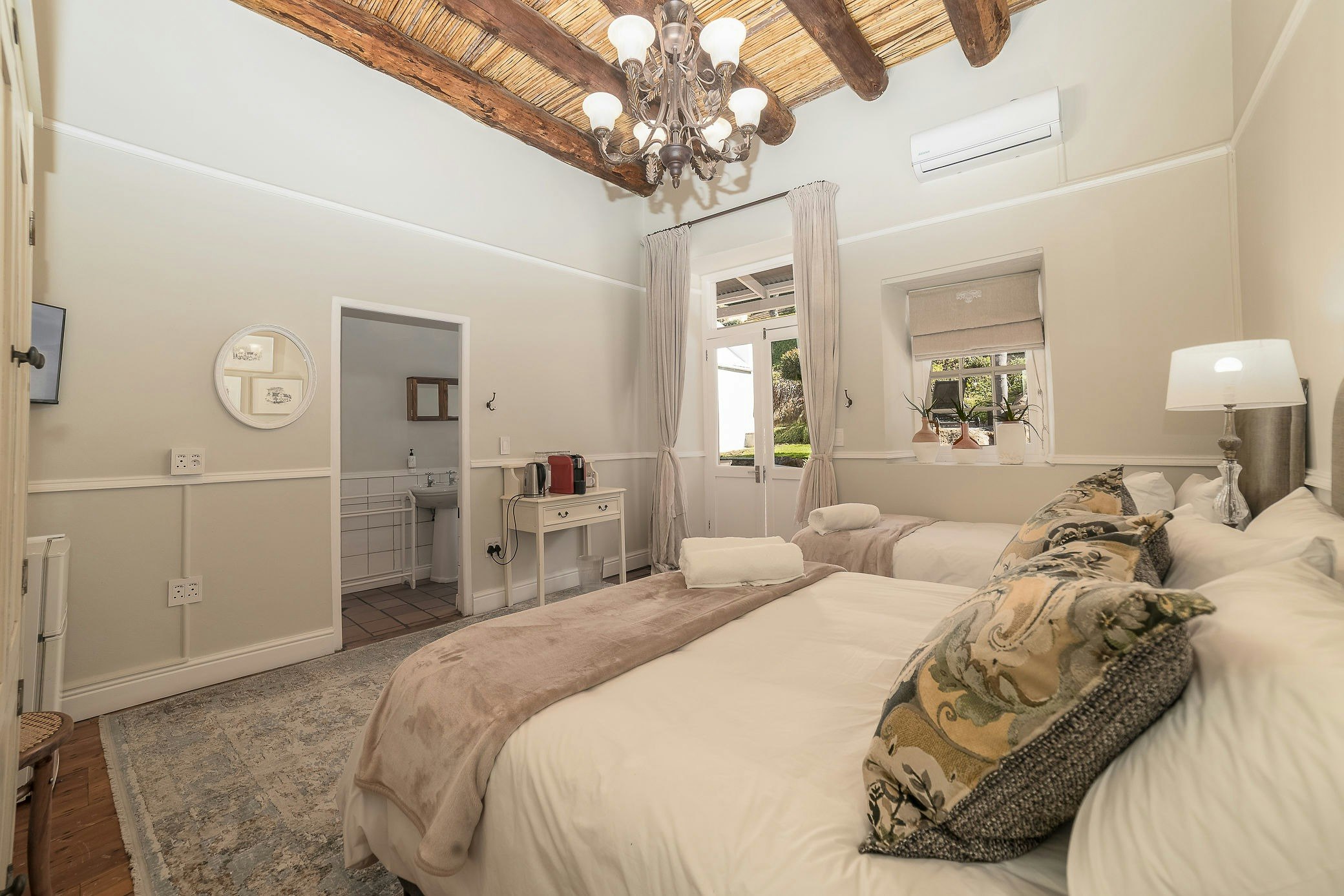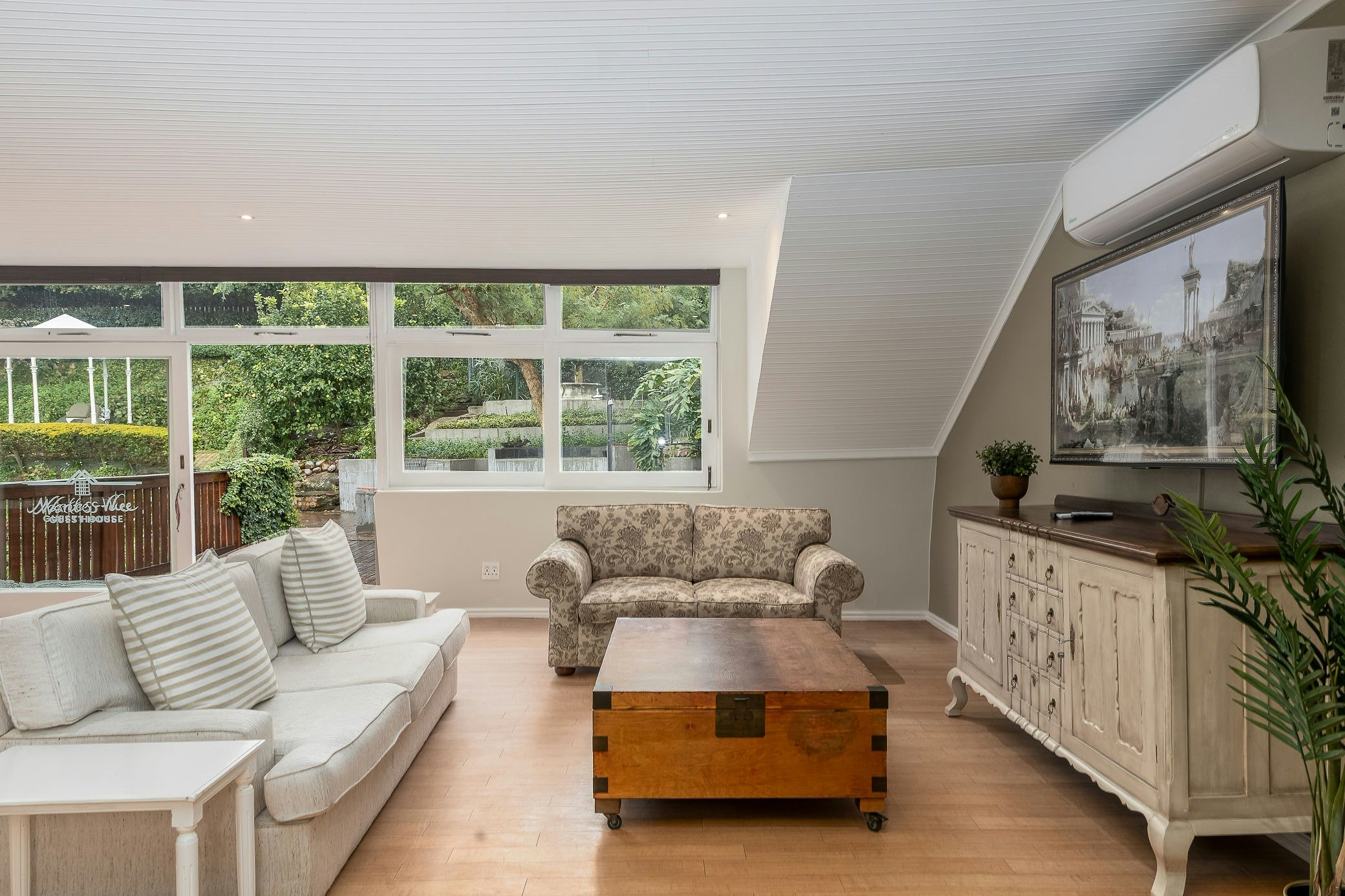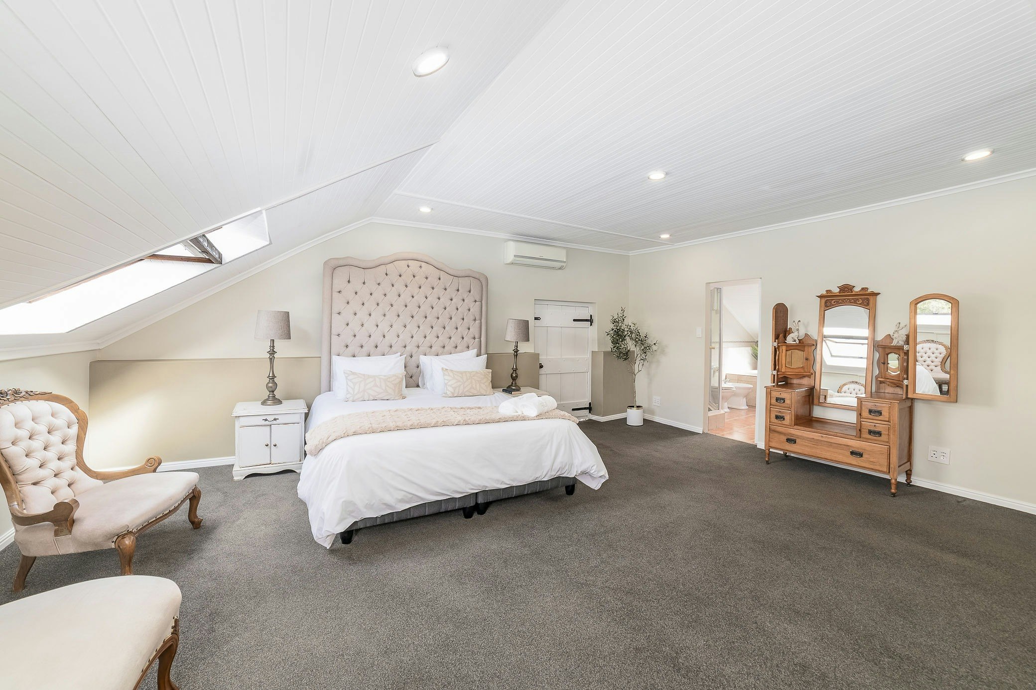Grondvloer – 4 elegante en suite-koninginkamers, plus 'n bekoorlike selfsorg-tuinkothuis met 'n kombuisie. Gaste geniet ook 'n volledig toegeruste gemeenskaplike kombuis, binnekaggel, buitebraai, welige tuin en plonspoel.