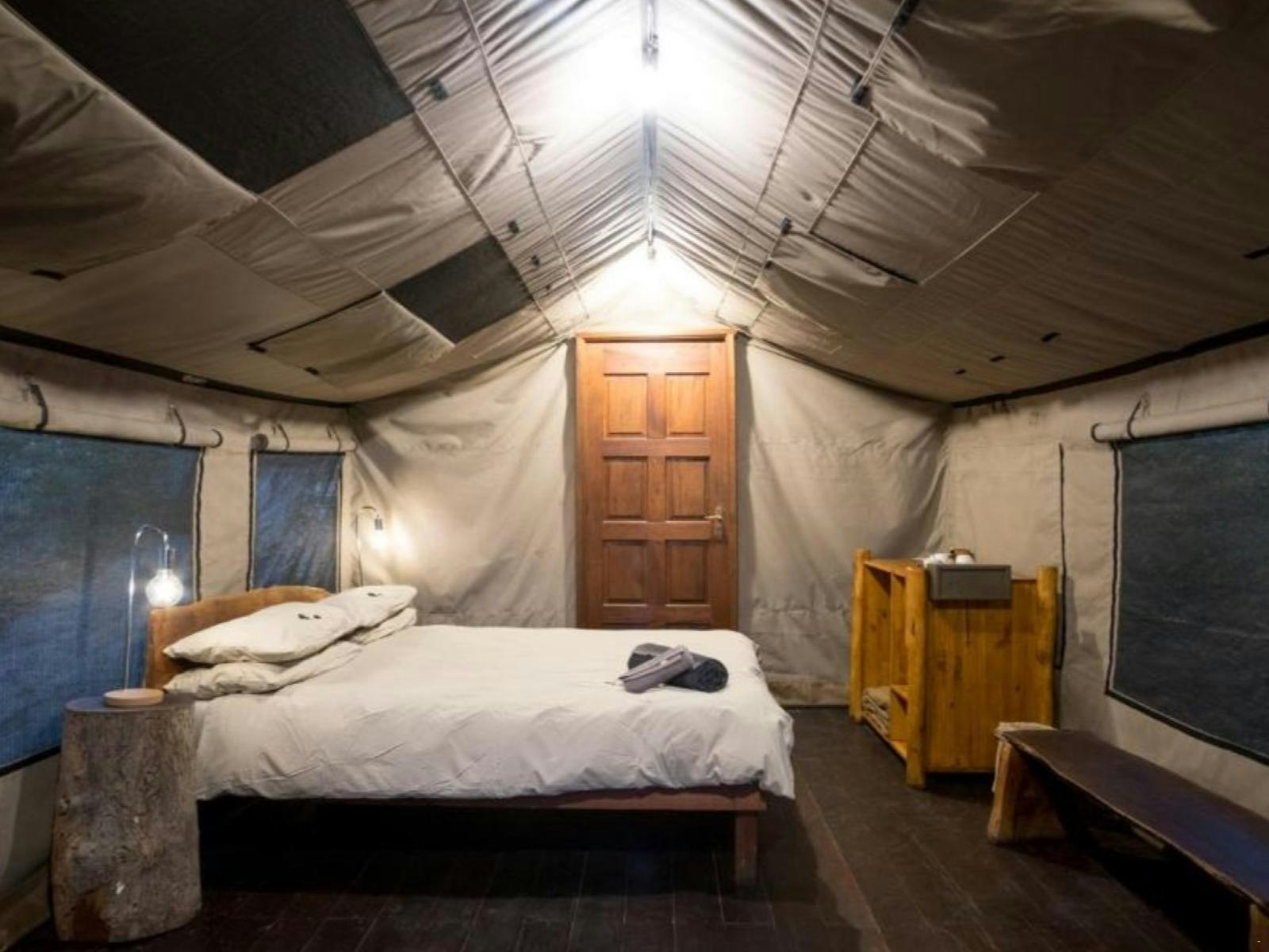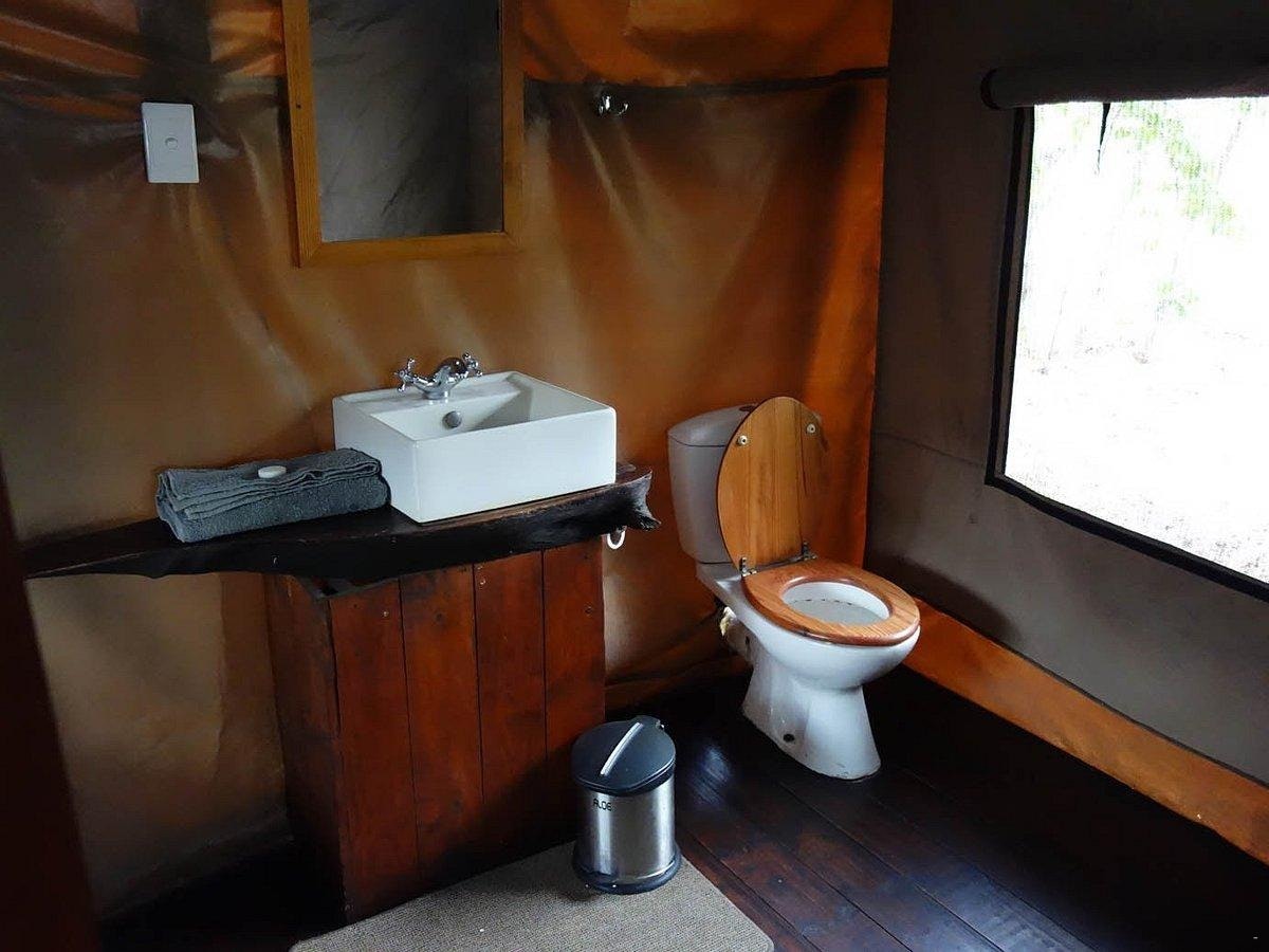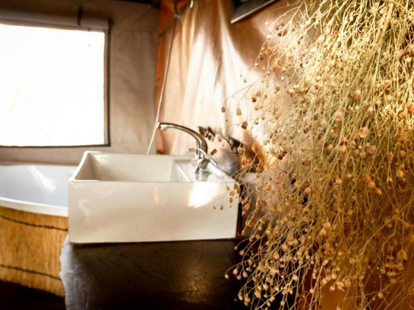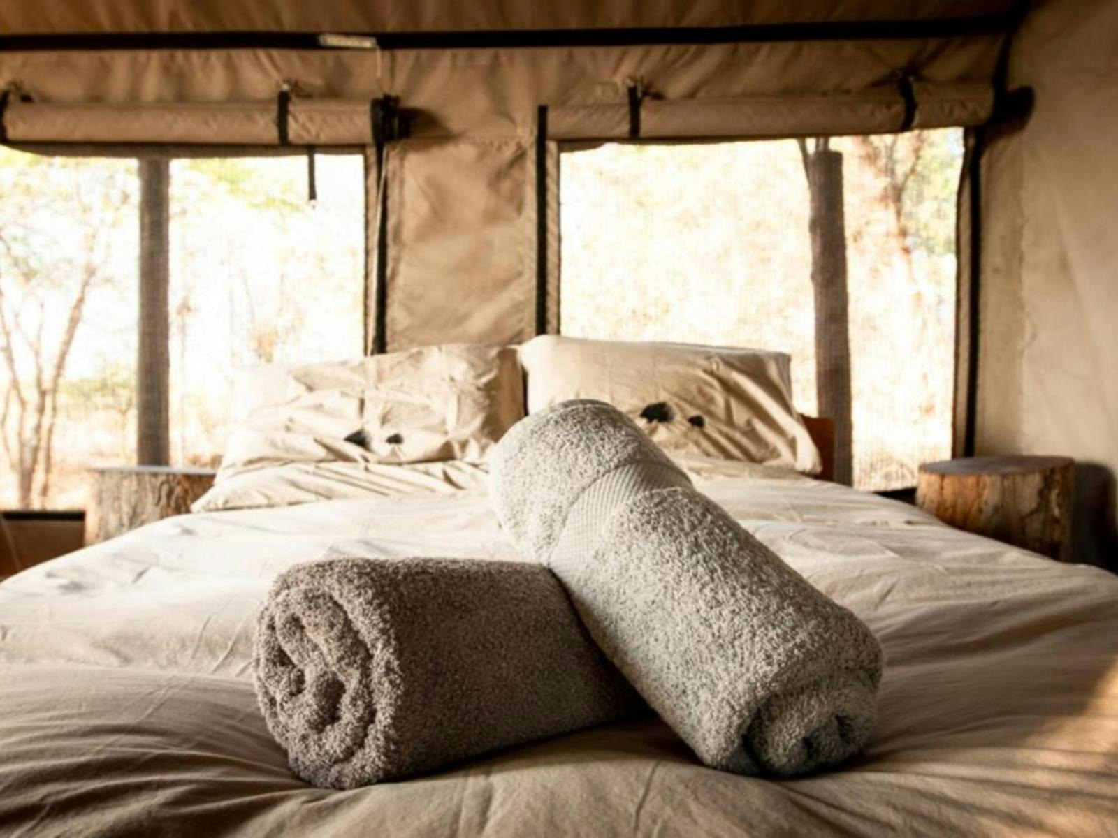Each safari tent accommodates up to 3 guests and is furnished with a double bed and a single bed, along with an en-suite bathroom. Hot water for bathing is provided by traditional wood-fired boilers. There are no electrical outlets in the tents or the camp, enhancing the authentic off-grid experience. Each tent features a private deck, perfect for soaking in views of the lush vegetation and towering trees.