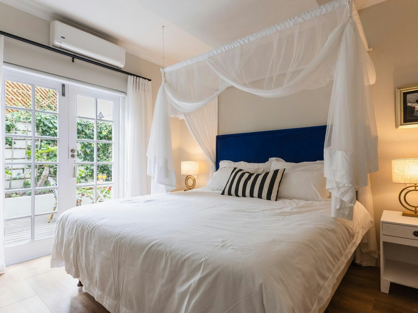 Ons bied 5 uniek ontwerpte kothuise, elk gemeubileer met koninggrootte beddens, lugversorging en 'n en suite-badkamer met 'n stort/bad, toilet en wasbak.