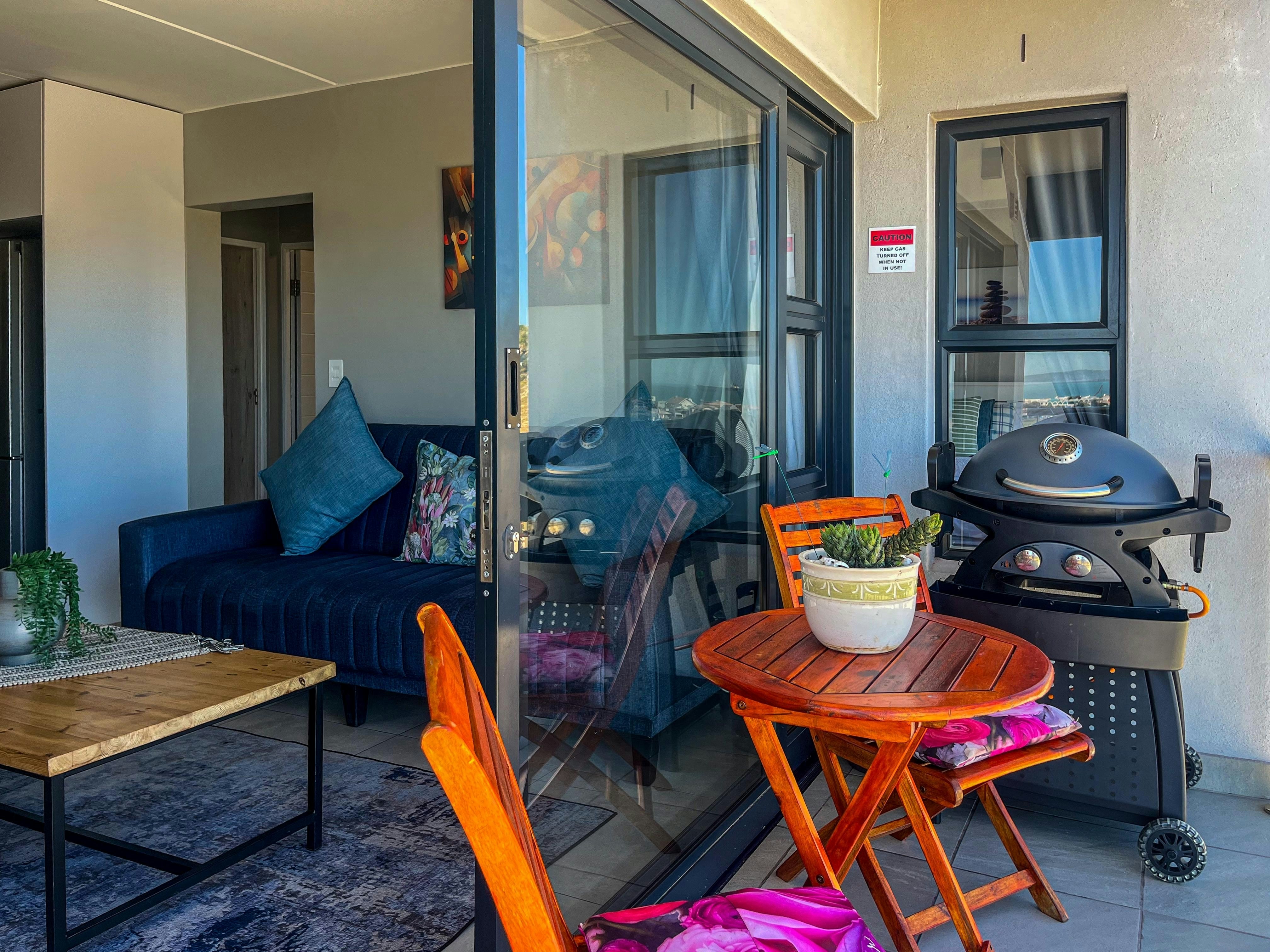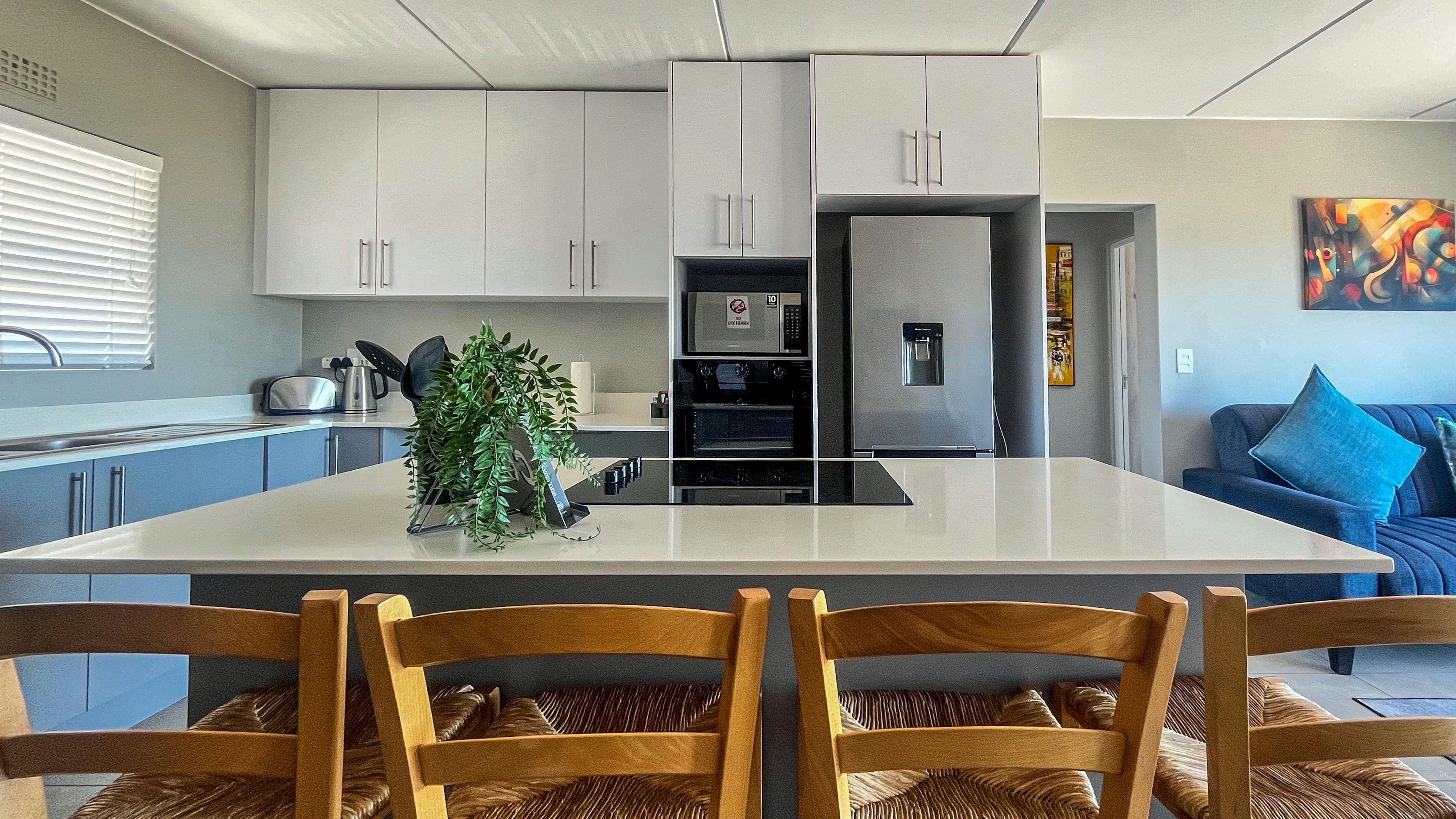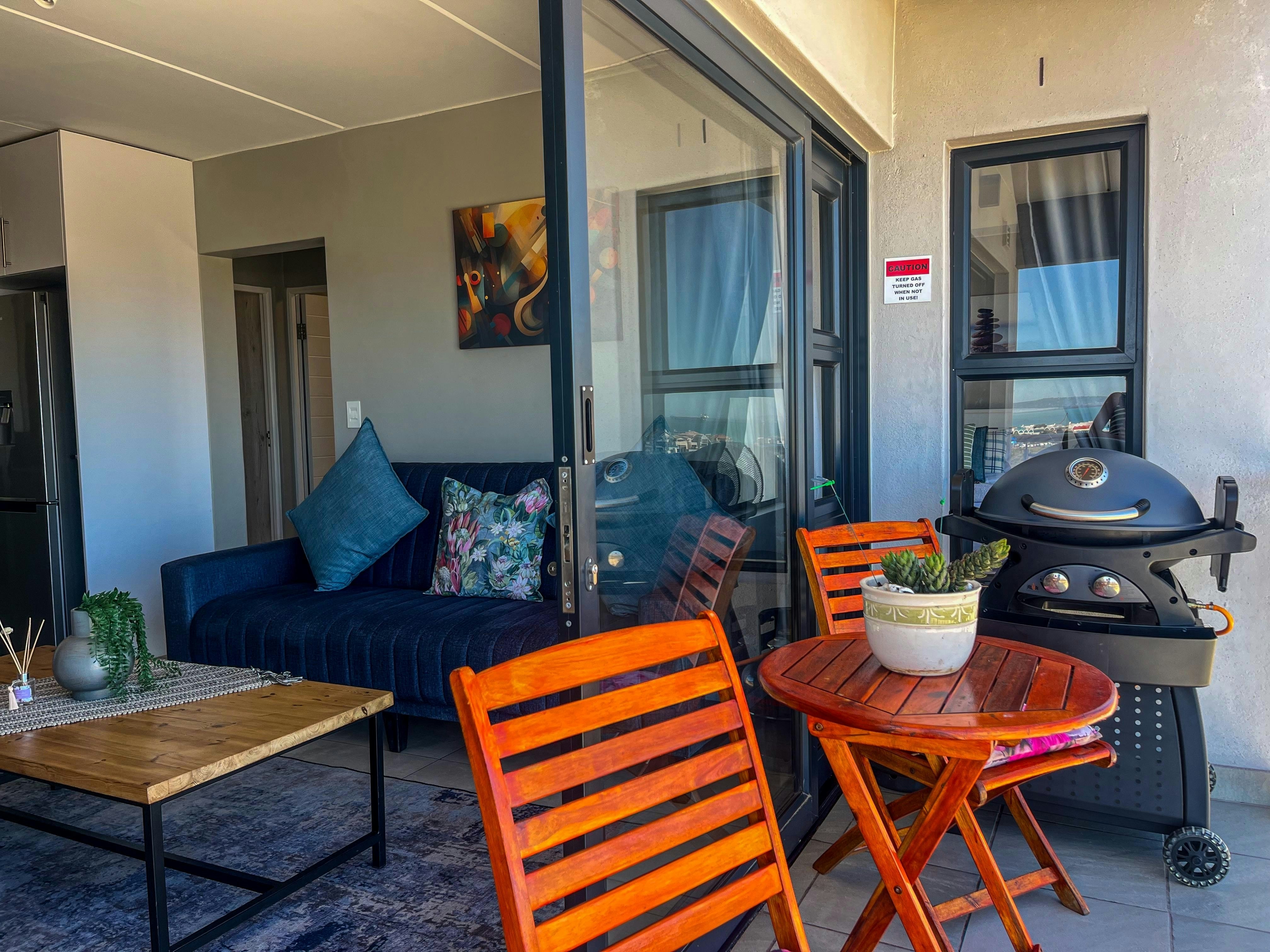 The open-plan kitchen is equipped with a fridge-freezer, stove, oven, microwave, toaster, washing machine, basic cutlery and crockery, as well as tea- and coffee-making facilities. The kitchen island doubles as a dining table with chairs. The living area is furnished with a sleeper couch that can sleep 1 guest and a flat-screen TV. Free Wi-Fi is also available. Enjoy a serene view through our sliding doors leading to the balcony equipped with outdoor furniture and kettle braai. Secure parking is available on the premises.