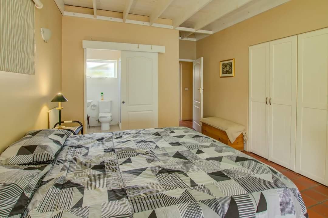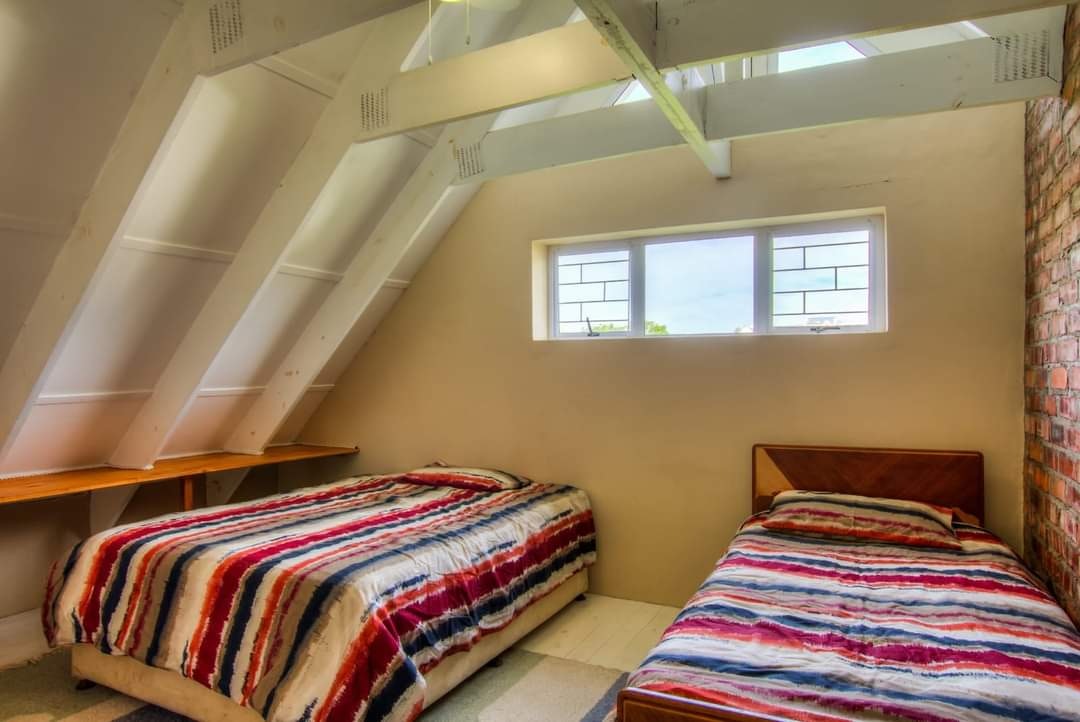 Upstairs, there are 2 bedrooms, 1 bathroom and a living area. The first bedroom contains a double bed and has a door opening to the upstairs balcony deck with outdoor furniture. The second bedroom contains 2 single beds. These 2 rooms share a bathroom with a shower, a toilet and a washbasin. There is an upstairs reading nook area with couches and a table and chairs.