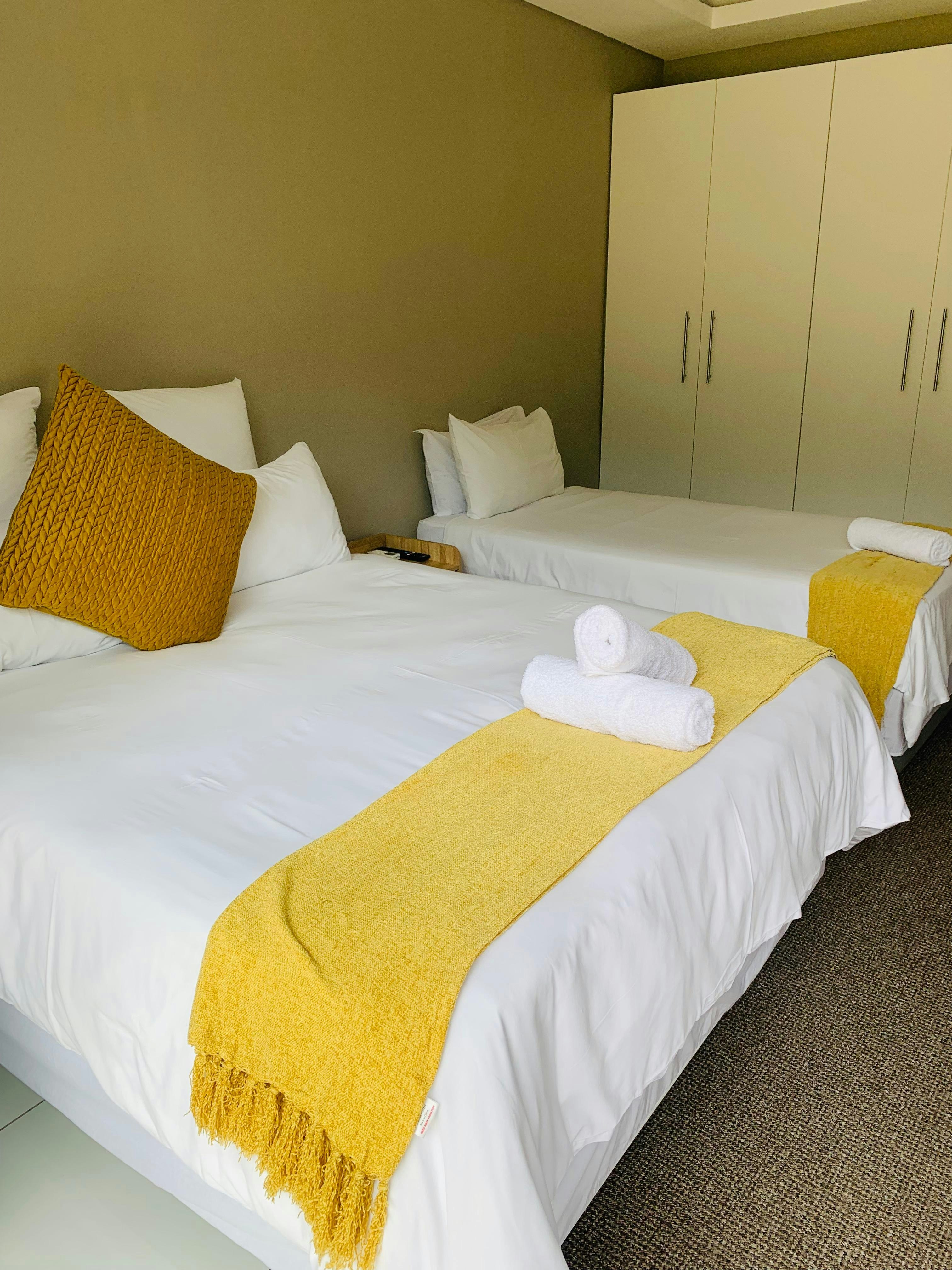 This room can accommodate up to 4 guests and is furnished with a queen-size bed and a double bed. The bathroom is fitted with a toilet, basin, bath, and shower. The kitchenette is equipped with a bar fridge, microwave, and tea- and coffee-making facilities. Other facilities include air-conditioning, a desk, a dining table, a TV with DStv, Wi-Fi, a hair dryer, a heater, and an iron and ironing board.