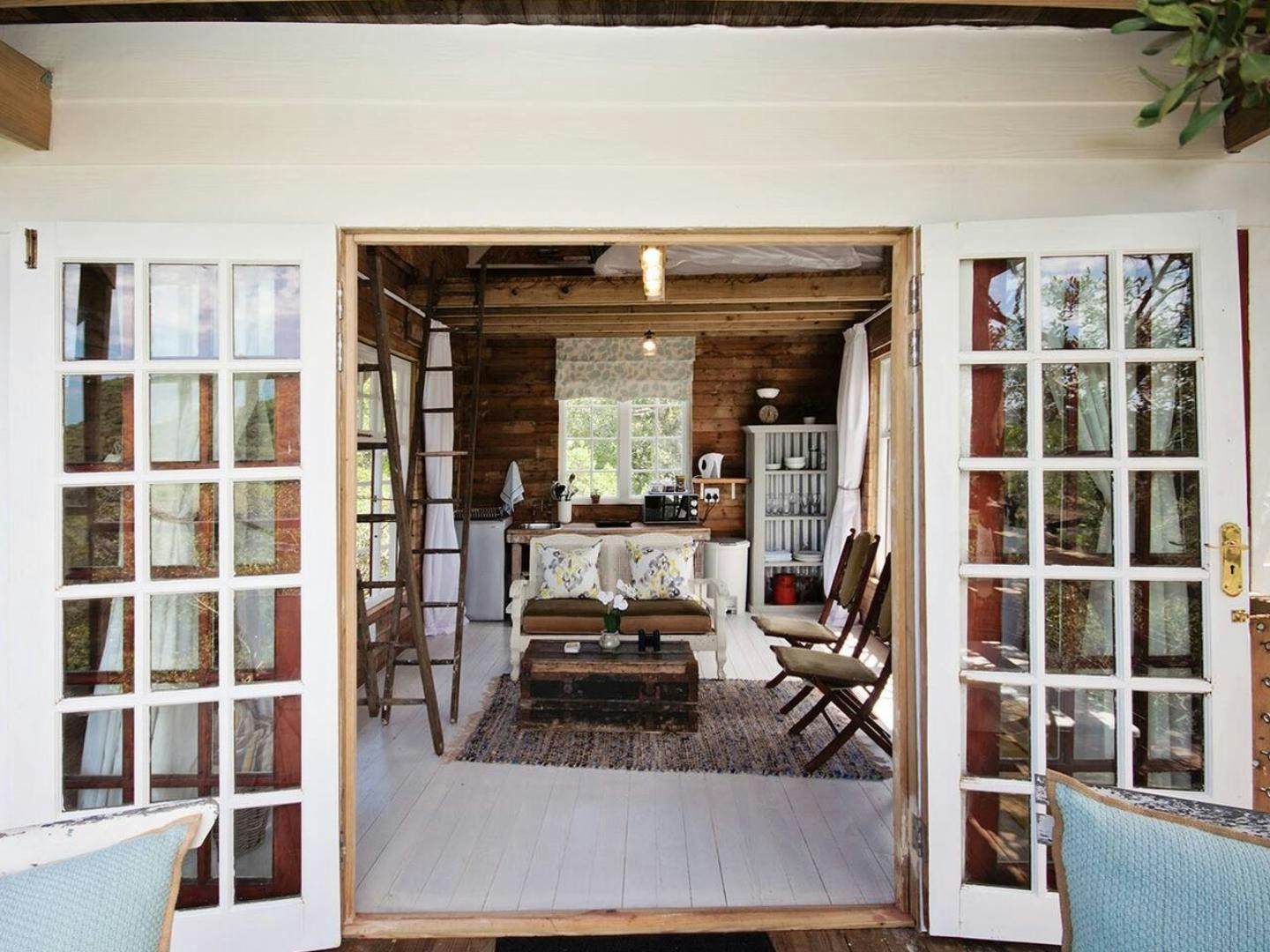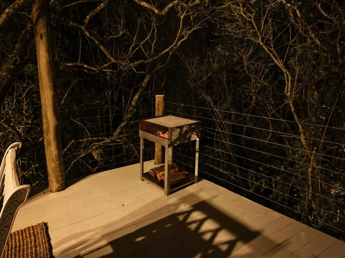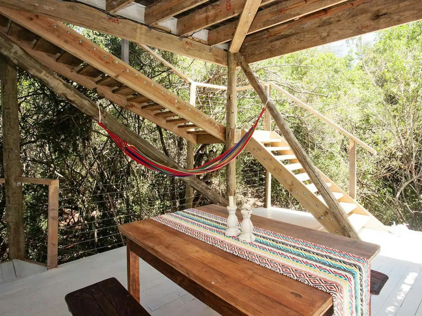 This living area opens onto a balcony with seating where guests can enjoy a morning coffee. Below the treehouse is a patio with an outdoor dining table, a lounging space, a hammock, and a portable braai. Guests have full access to the communal swimming pool to cool off on those hot summer days.