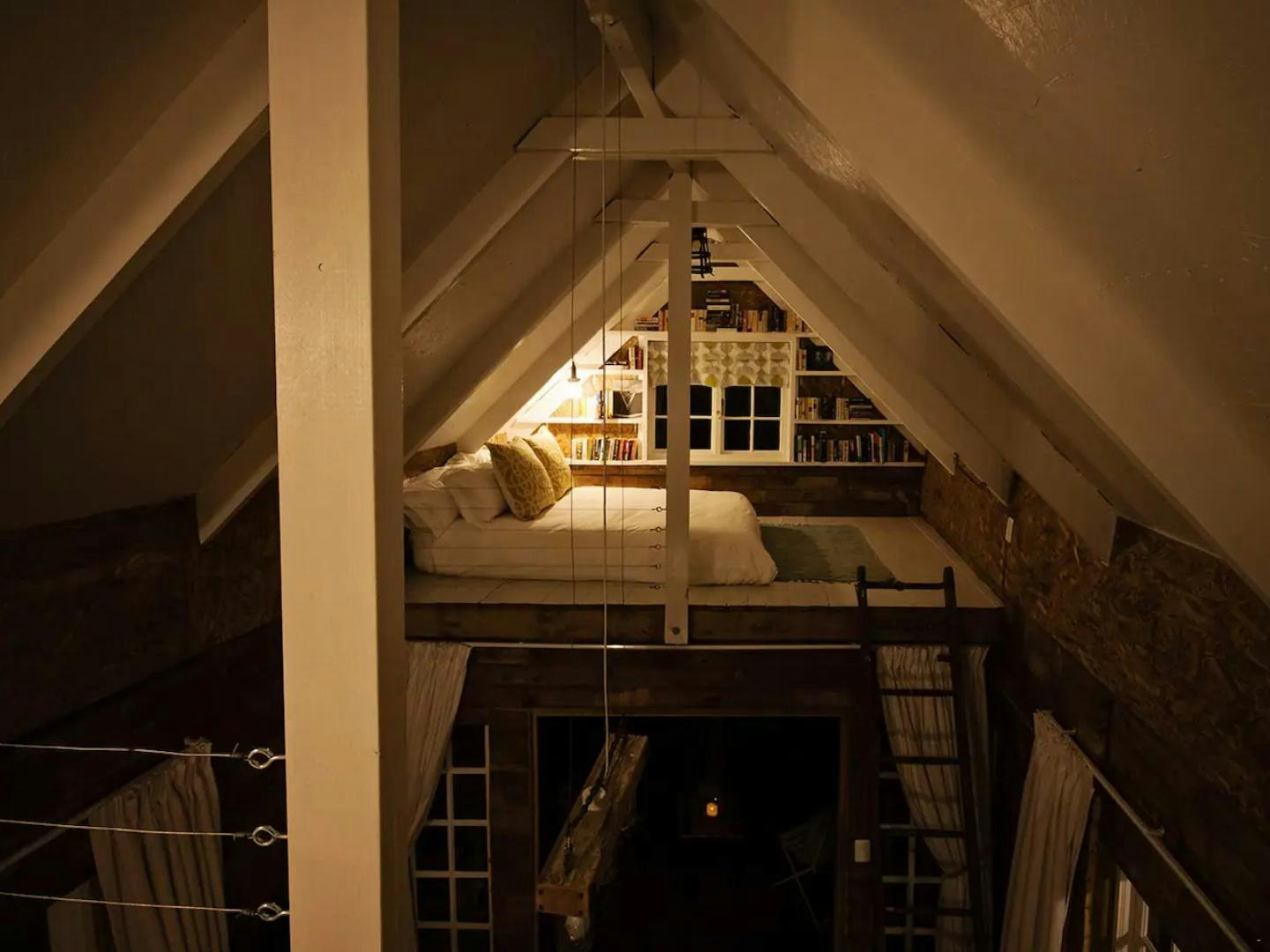 This treehouse can comfortably accommodate 4 guests as it comprises a loft space and a bathroom. The loft is furnished with a queen-size bed on one side and a double bed on the other side. A bath, shower, washbasin and toilet are available in the bathroom.