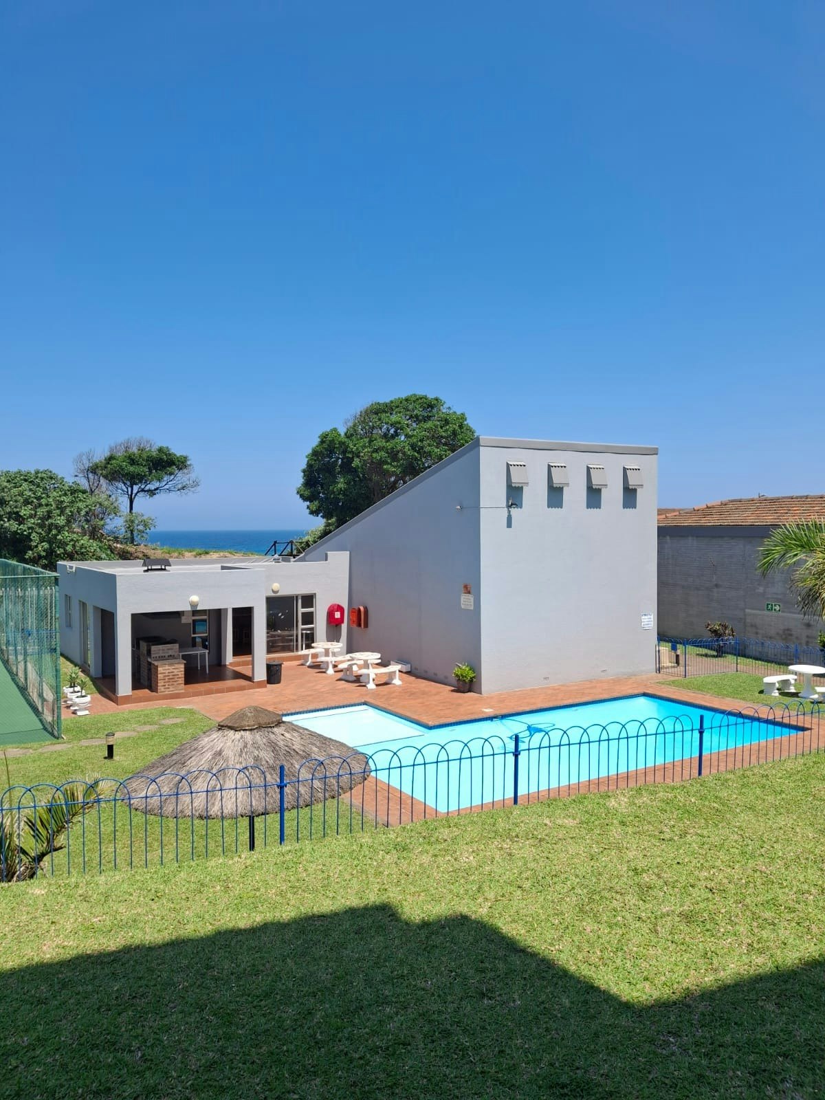 Additional comforts include a ceiling fan, electric blankets for cooler nights, and a hair dryer for your convenience. A picnic basket and garden chairs are provided for leisurely beach outings. On-site facilities include a swimming pool, tennis court, squash court, and a braai area for added enjoyment.