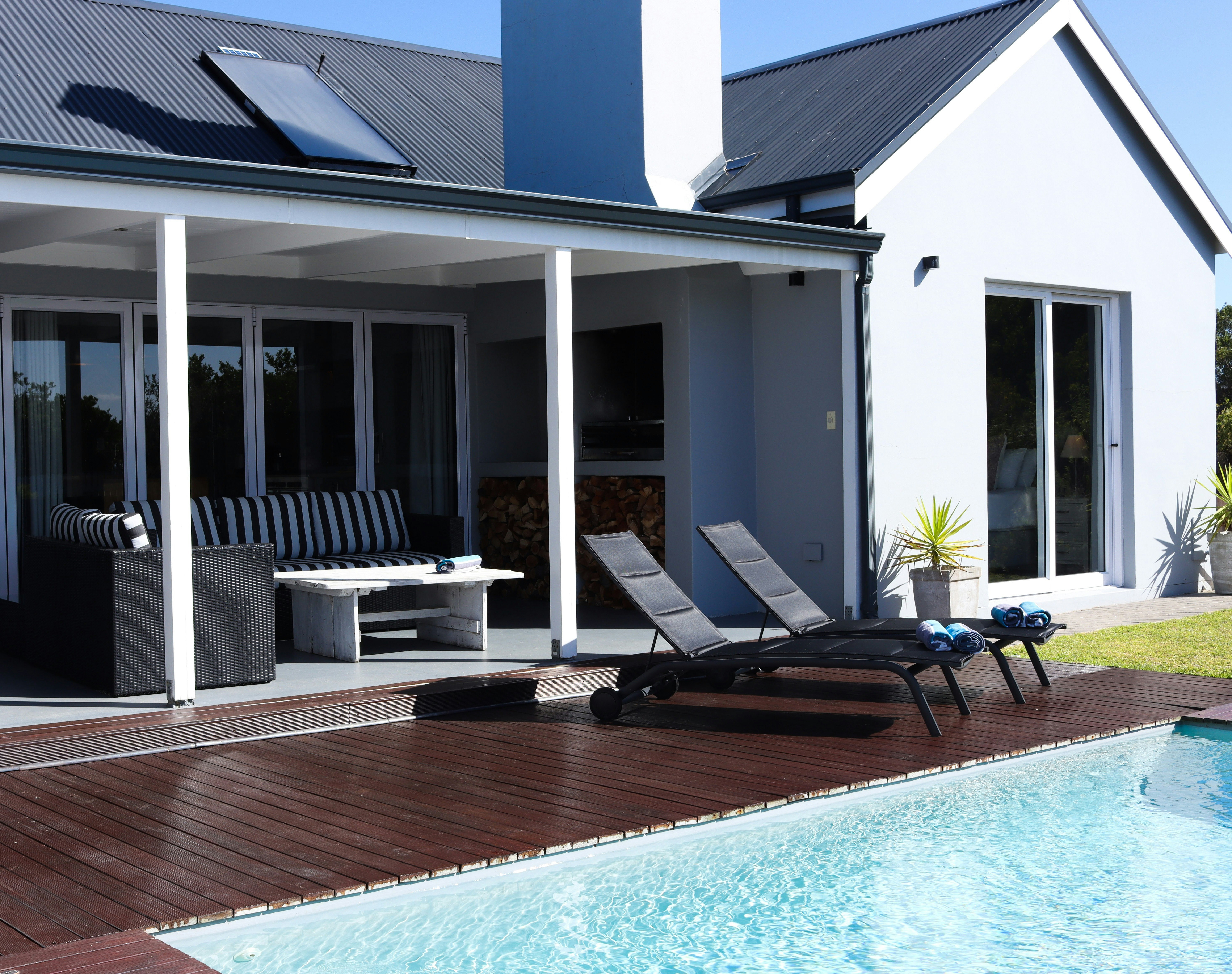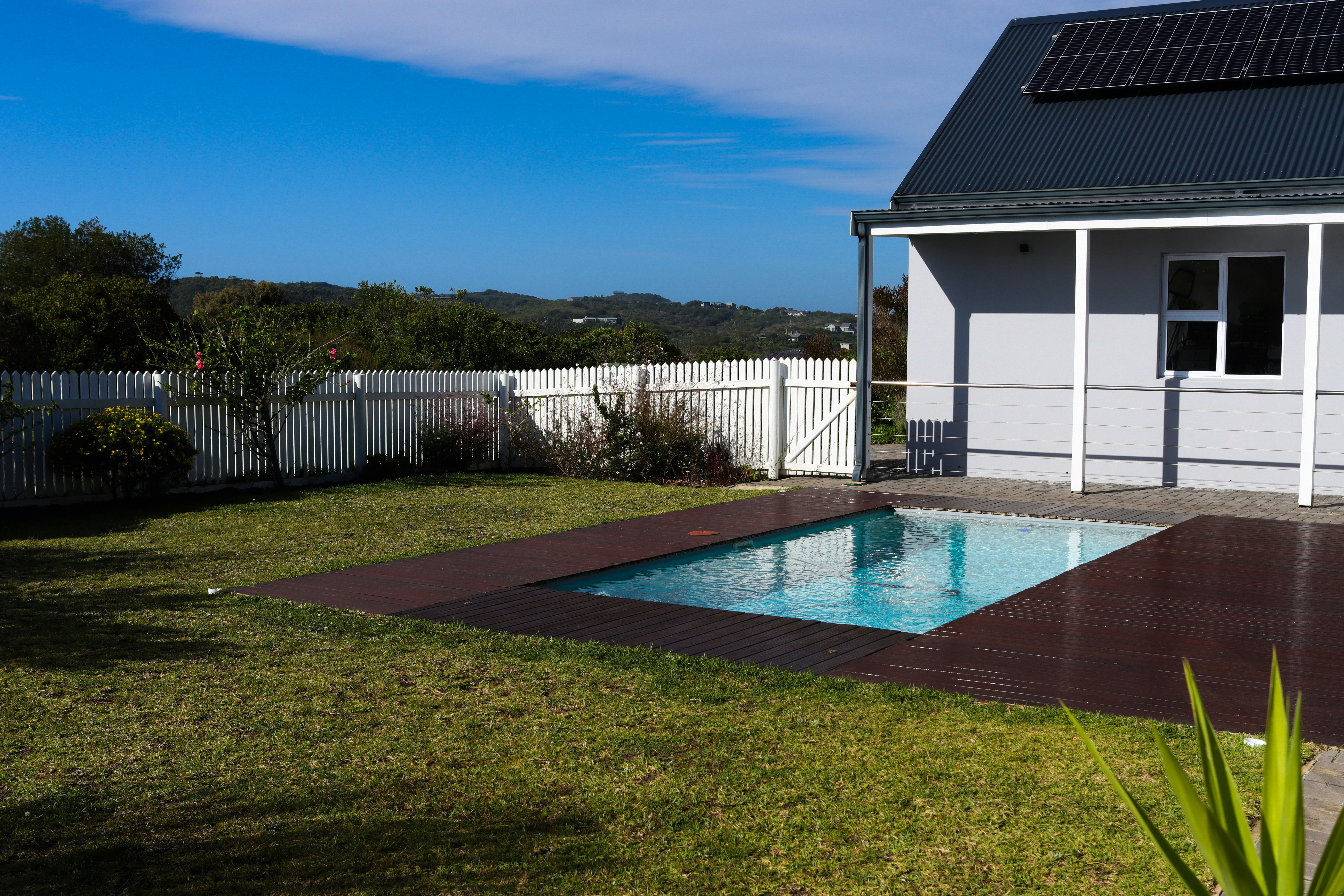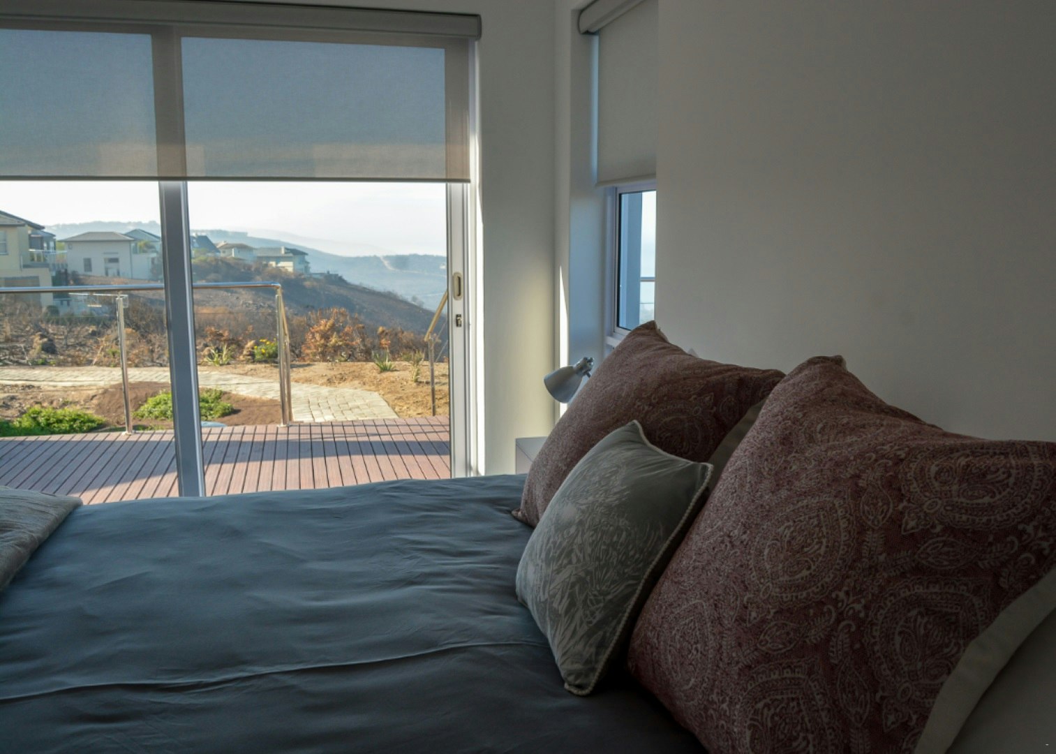 Accommodation is offered in a 3-bedroomed house or a 2-bedroomed unit with solar power for essential appliances, each of which has a private entrance. The house and the unit are adjoined so they can be booked together. The house can accommodate up to 6 guests and comprises 3 bedrooms, 3 en-suite bathrooms and an open-plan fully-equipped kitchen, dining and living area. The living area opens to a deck with outdoor furniture, braai facilities, and a swimming pool. The deck has views towards the Pezula clubhouse and the Outeniqua mountains.