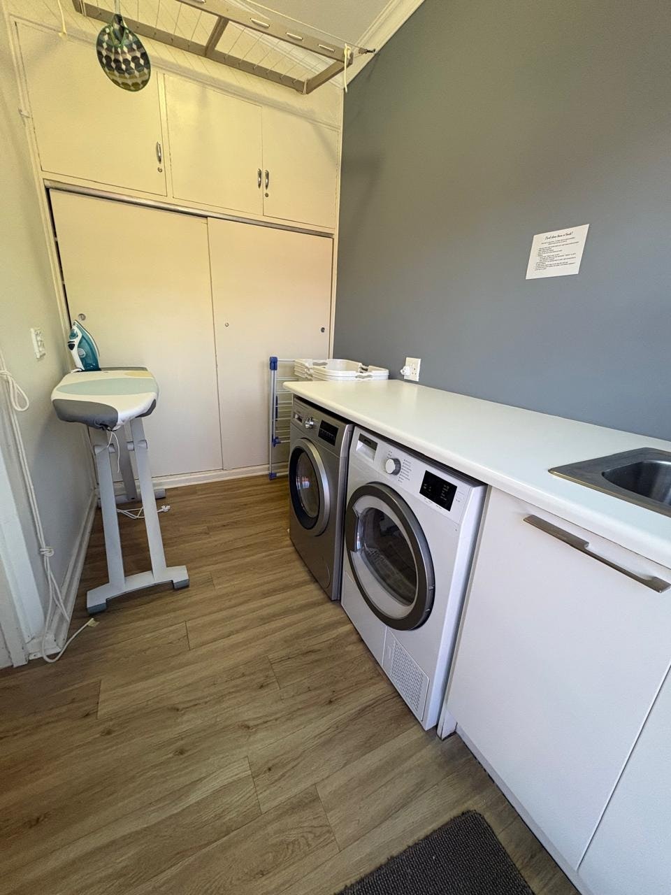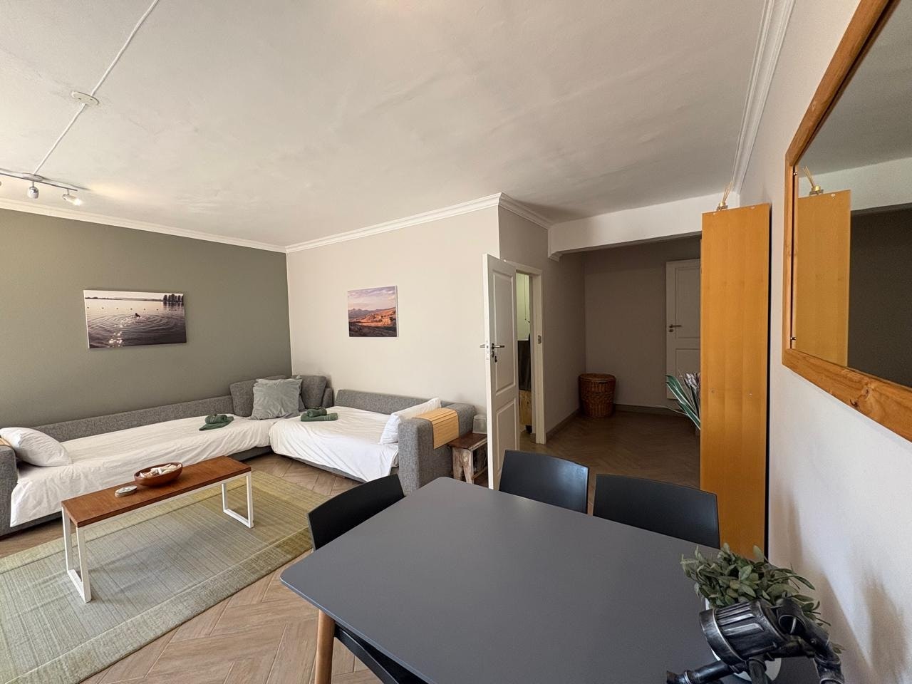 The open-plan living area downstairs offers a kitchenette equipped with a bar fridge, microwave, cutlery, and crockery. The dining table can accommodate 4 guests and flows to the lounge, furnished with comfortable seating.