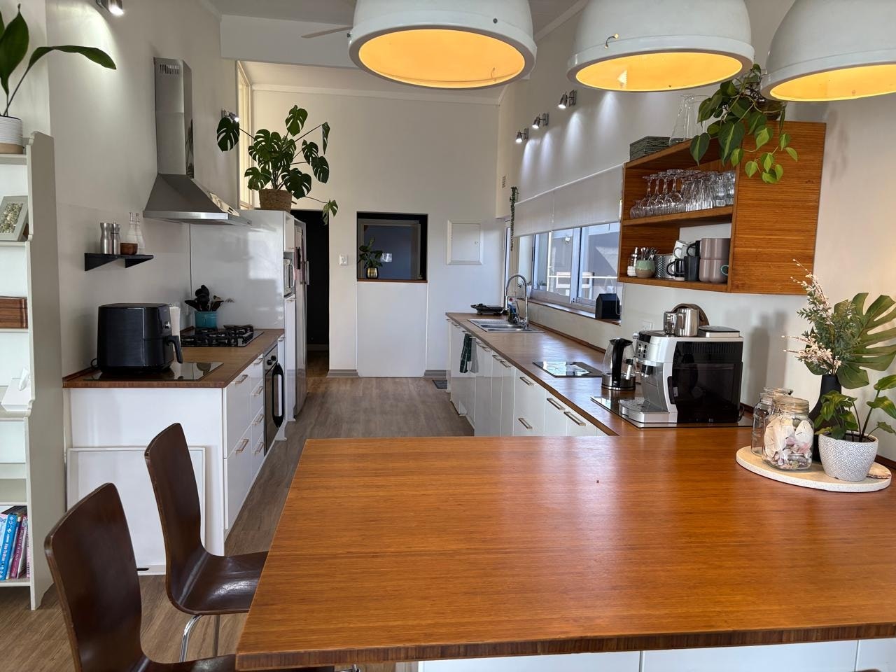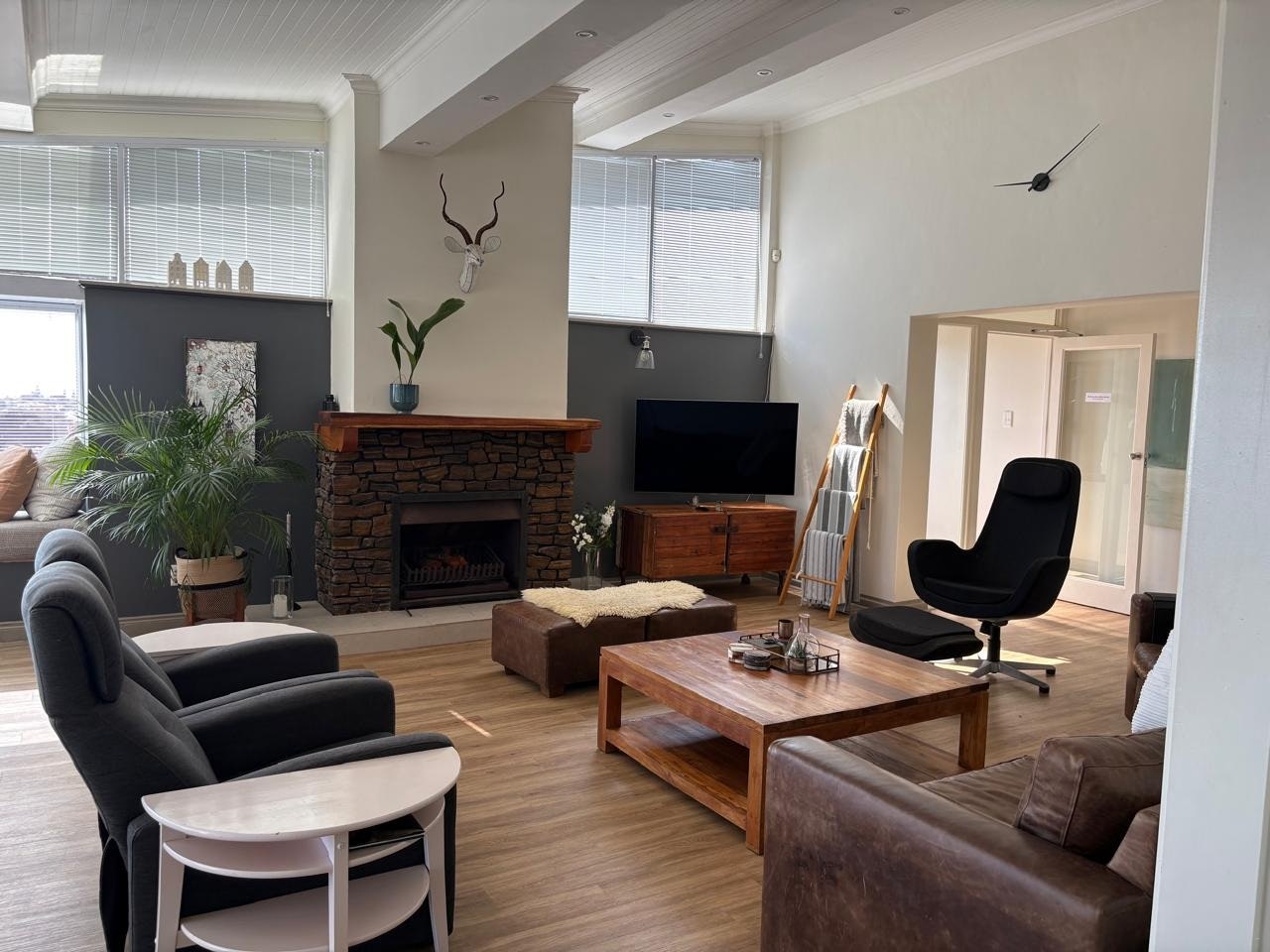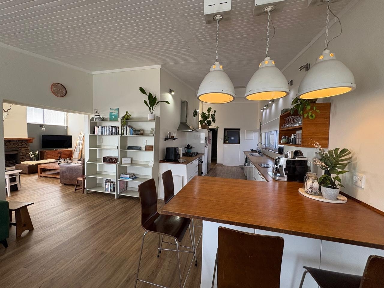 The open-plan living area upstairs offers a fully equipped kitchen with a stove, oven, cutlery, crockery, utensils, air fryer, double-door fridge-freezer, microwave, kettle, coffee machine, toaster, and a breakfast counter that flows to the dining area, furnished with a dining table for 8 and a fireplace that flows to the lounge that is furnished with comfortable seating, fireplace, TV, with streaming options and Wi-Fi for your entertainment. The lounge walks out onto the deck that offers outdoor furniture and braai facilities.