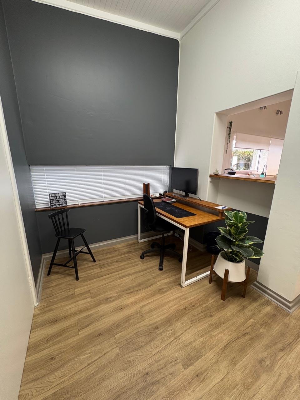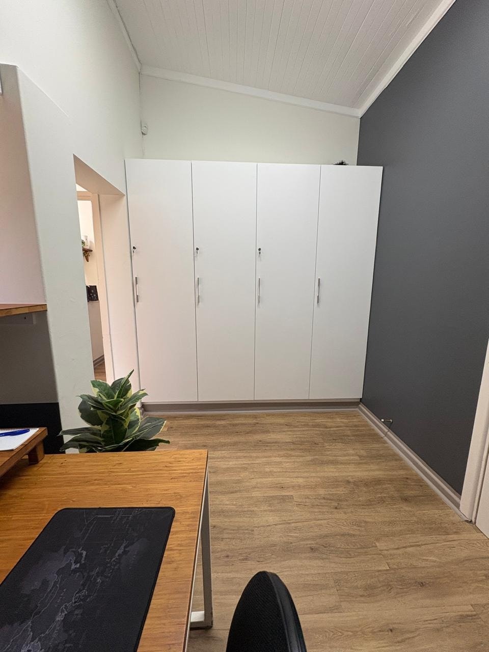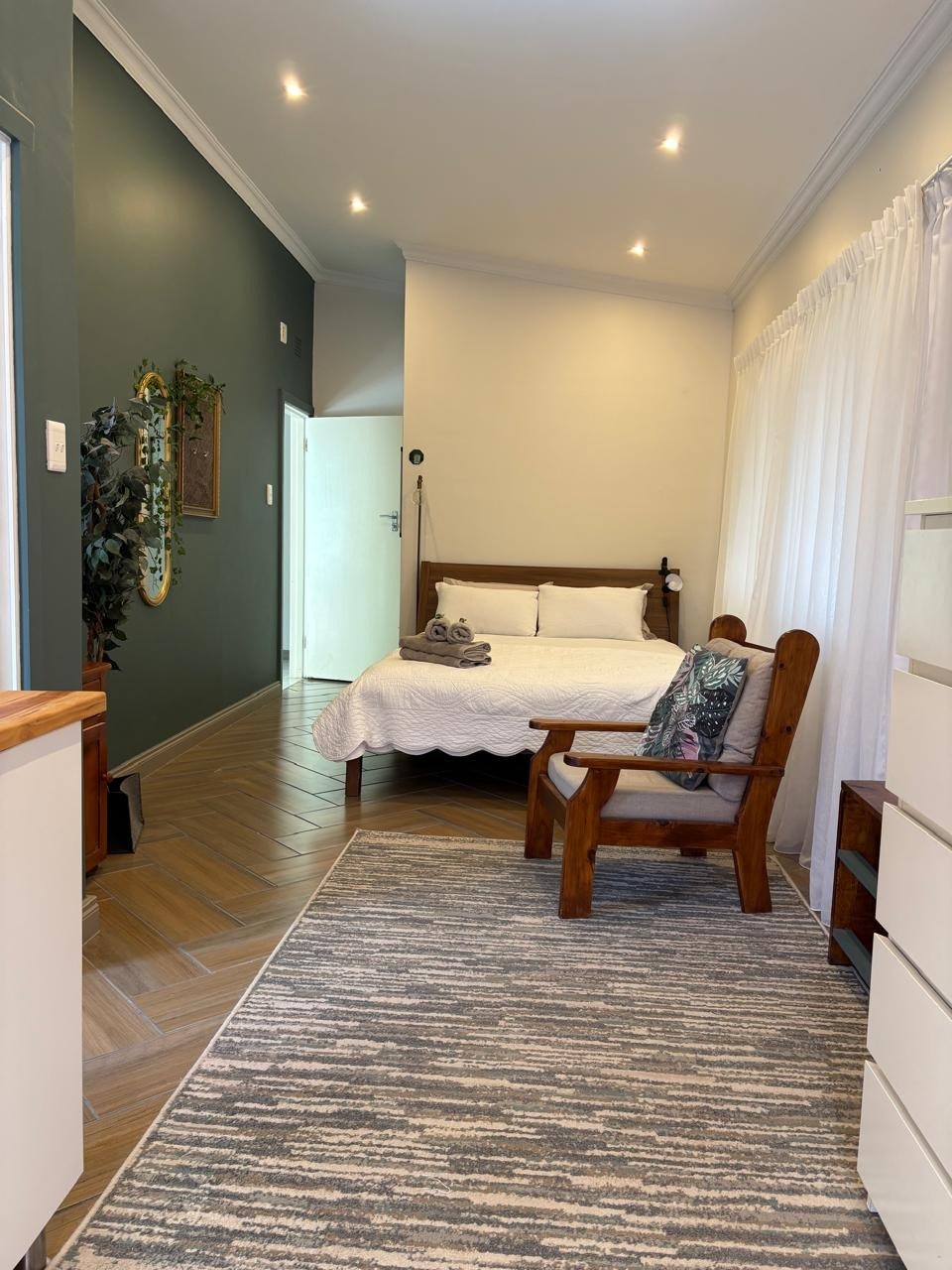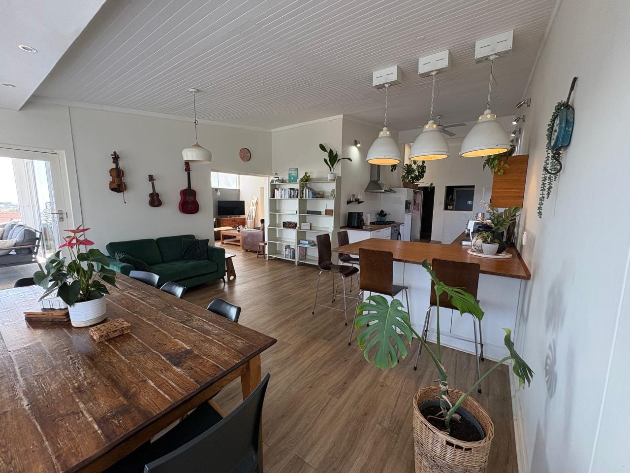 The open-plan living area upstairs offers a fully equipped kitchen with a stove, oven, cutlery, crockery, utensils, air fryer, double-door fridge-freezer, microwave, kettle, coffee machine, toaster, and a breakfast counter that flows to the dining area, furnished with a dining table for 8 and a fireplace that flows to the lounge that is furnished with comfortable seating, fireplace, TV, with streaming options and Wi-Fi for your entertainment. The lounge walks out onto the deck that offers outdoor furniture and braai facilities.