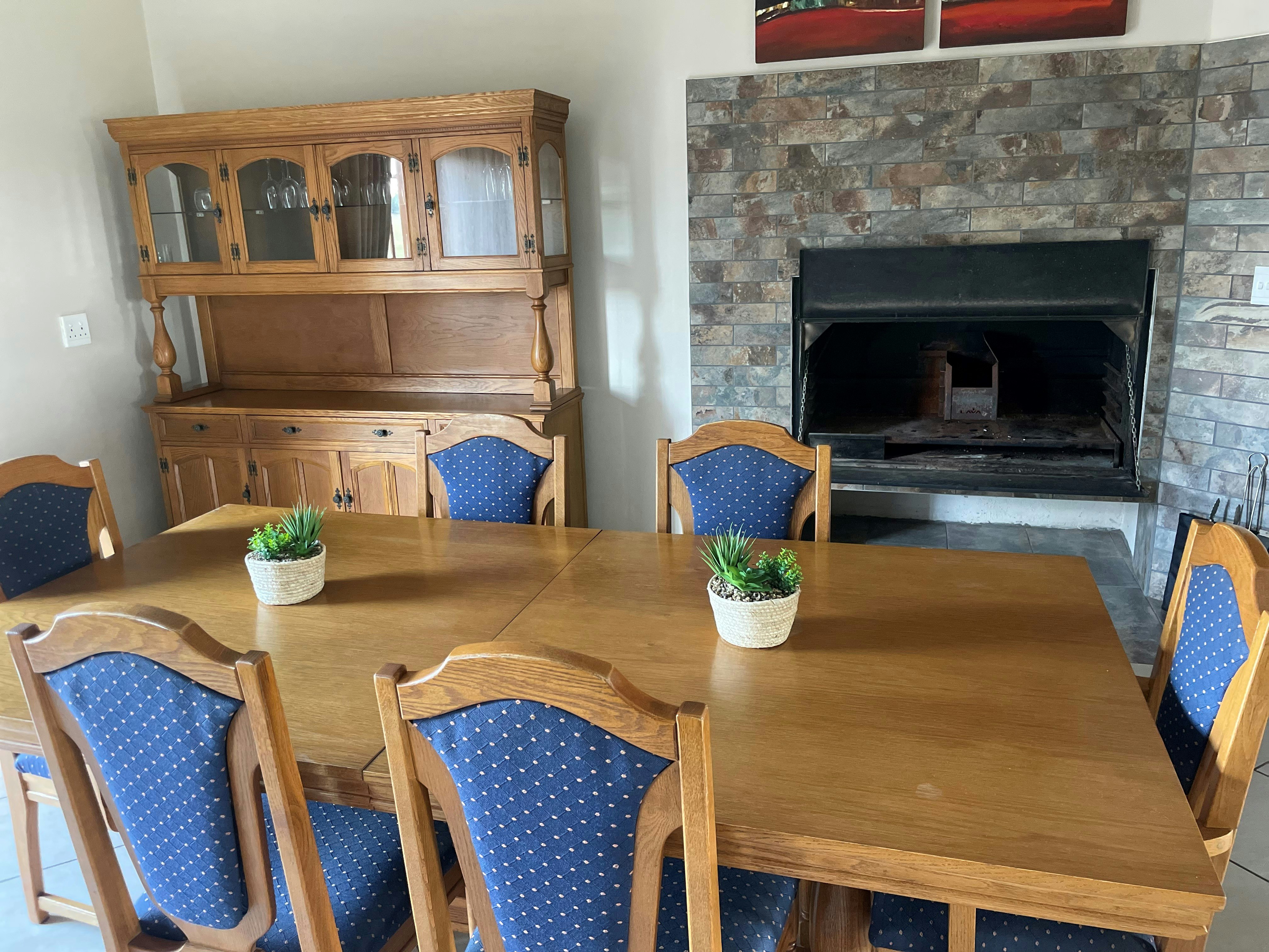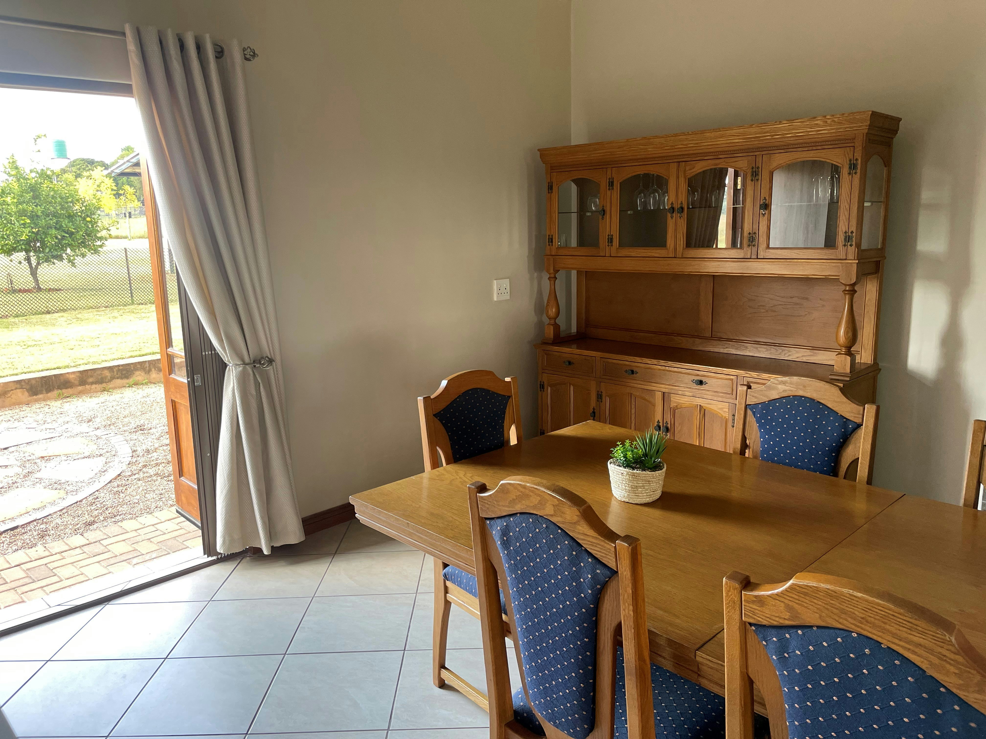 The living area features a lounge, a dining area and a kitchen. The kitchen is equipped with a gas stove, oven, microwave, fridge-freezer, tea- and coffee-making facilities and cutlery and crockery. The kitchen also has a breakfast bar with 4 stools. The dining area is furnished with a dining table suitable for 6 guests and a built-in braai. The lounge is furnished with 2 comfortable single sleeper couches, a coffee table and a TV. Free Wi-Fi ensures that staying connected is a breeze. This property uses solar power and does not experience loadshedding.