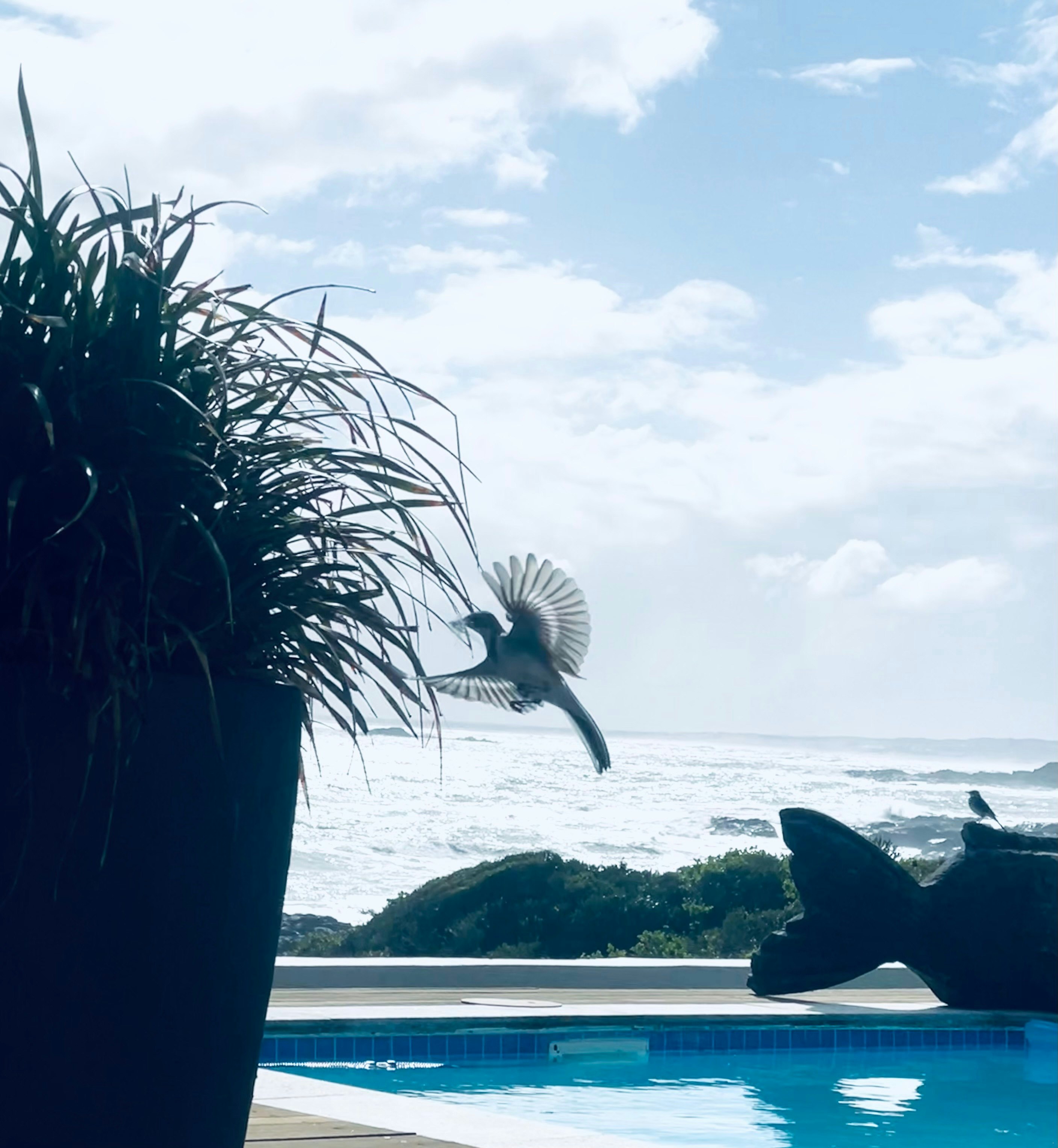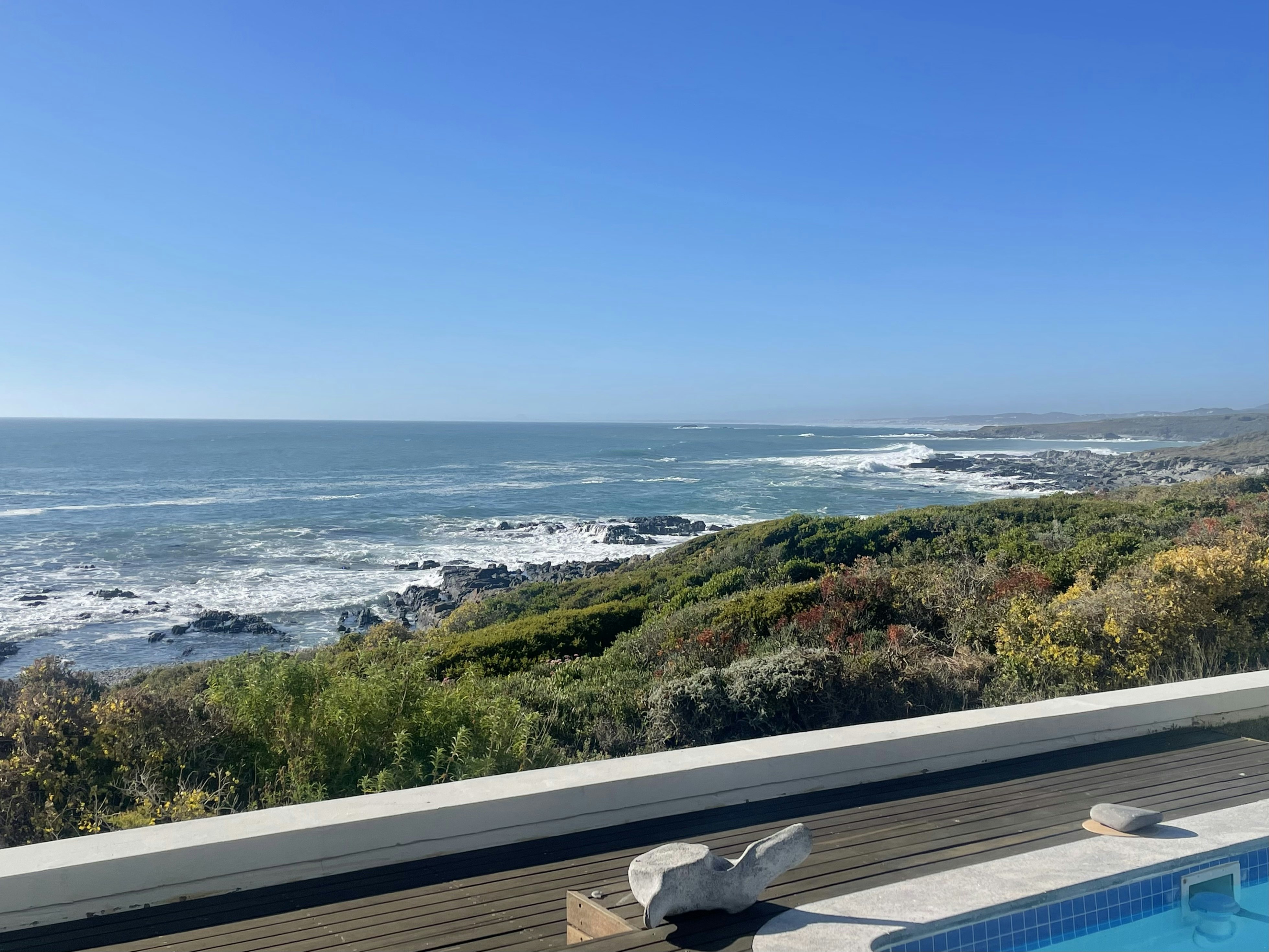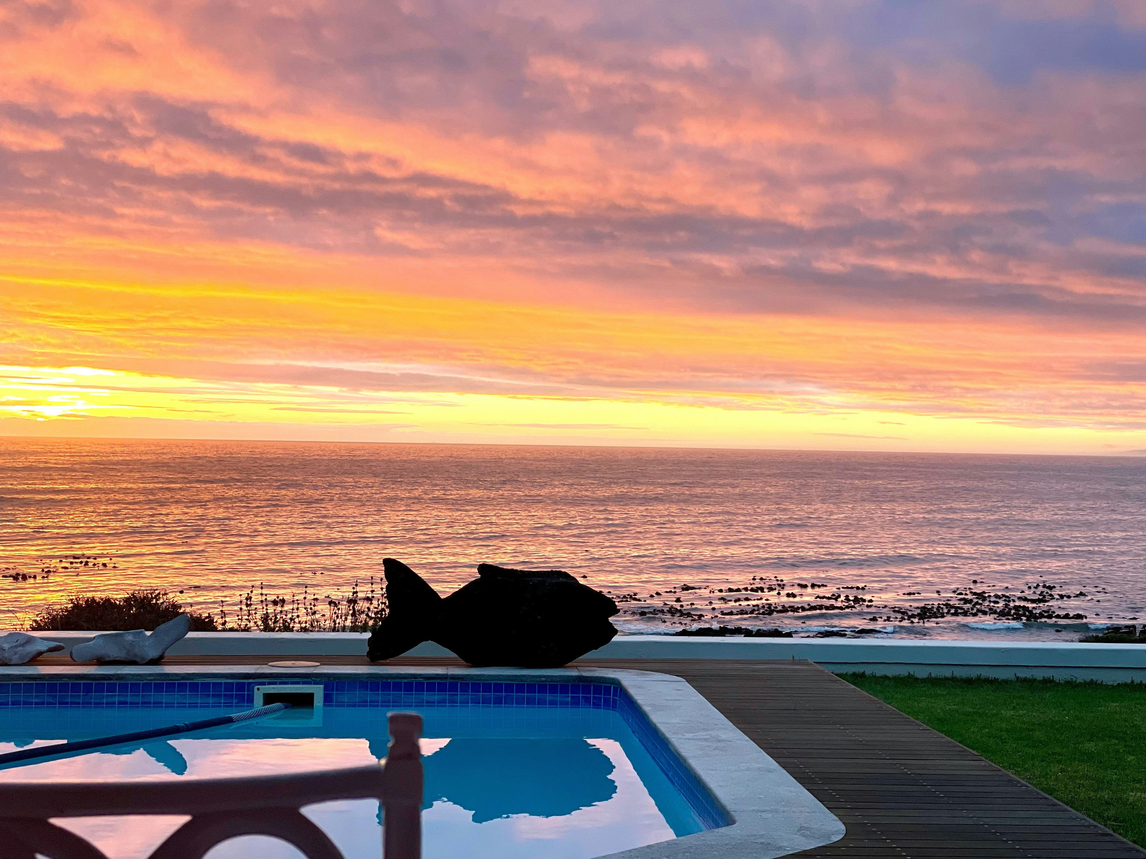 Guests can enjoy their meals at the dining table or relax in the lounge which has a cosy fireplace. Guests have access to DStv and Netflix. The house also has an office and a small library with a TV. The living area opens onto the patio overlooking the swimming pool and the ocean. The pool is not fenced, and children must be under parental supervision. The deck has a table with chairs as well as sun loungers.