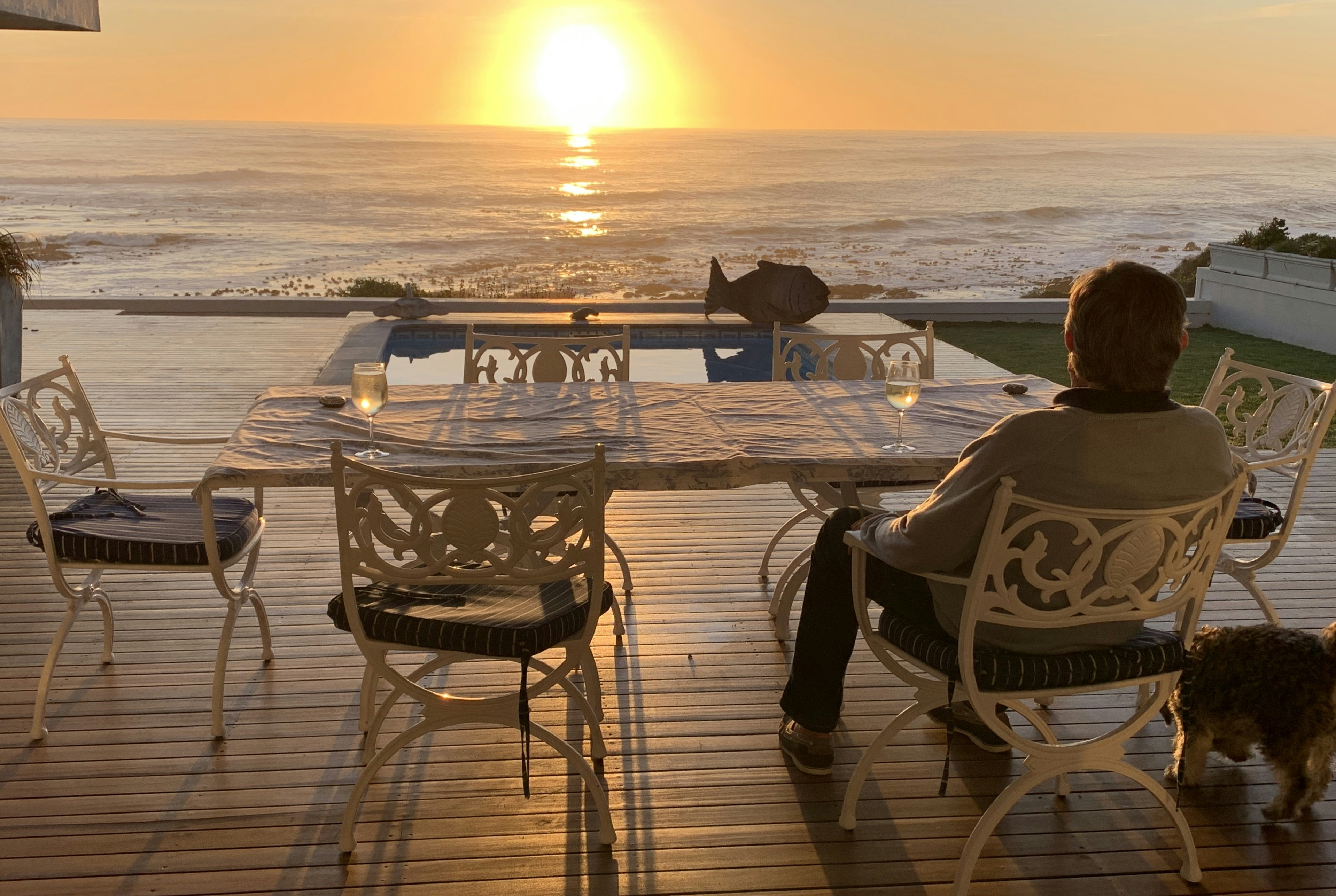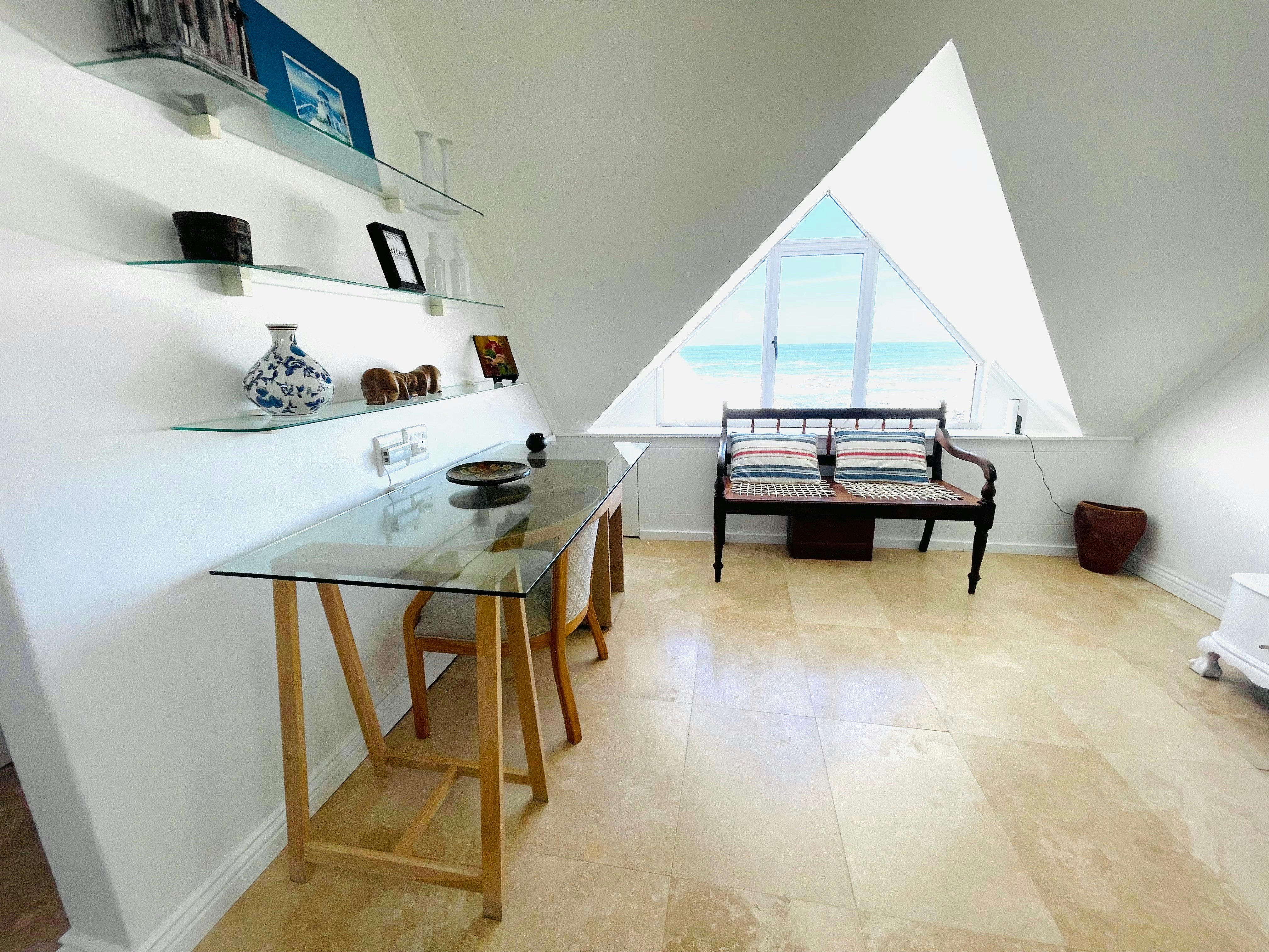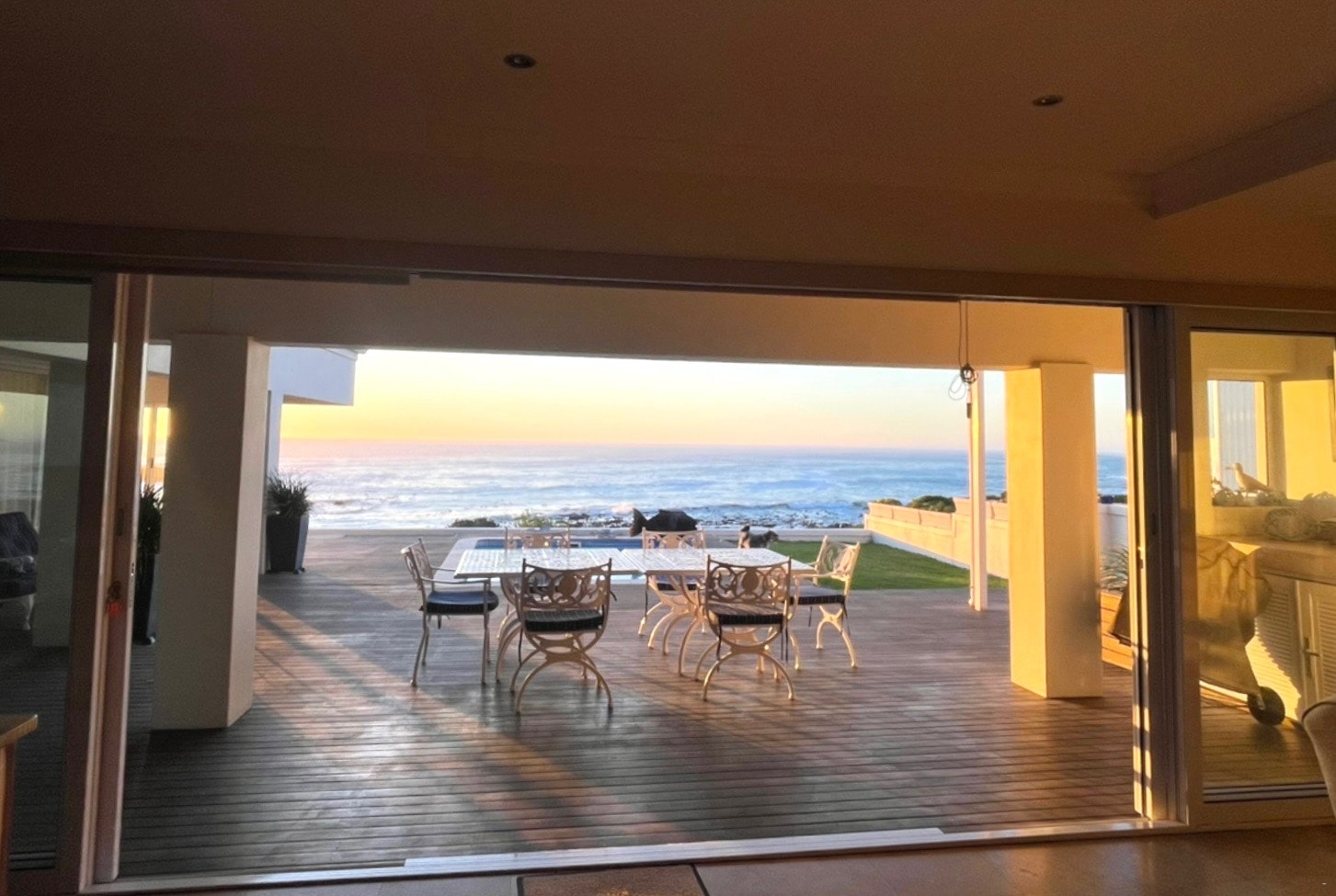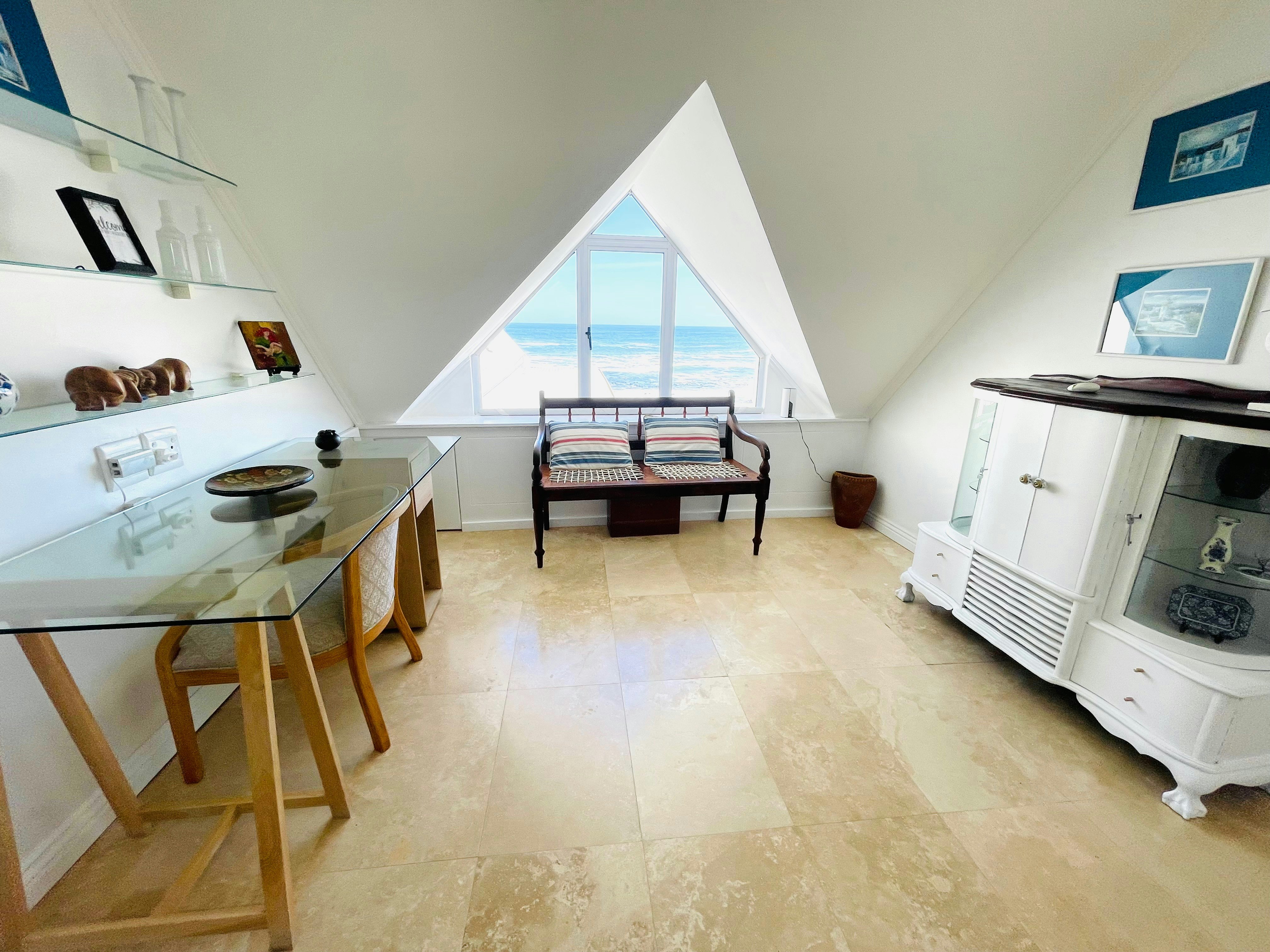 Guests can enjoy their meals at the dining table or relax in the lounge which has a cosy fireplace. Guests have access to DStv and Netflix. The house also has an office and a small library with a TV. The living area opens onto the patio overlooking the swimming pool and the ocean. The pool is not fenced, and children must be under parental supervision. The deck has a table with chairs as well as sun loungers.