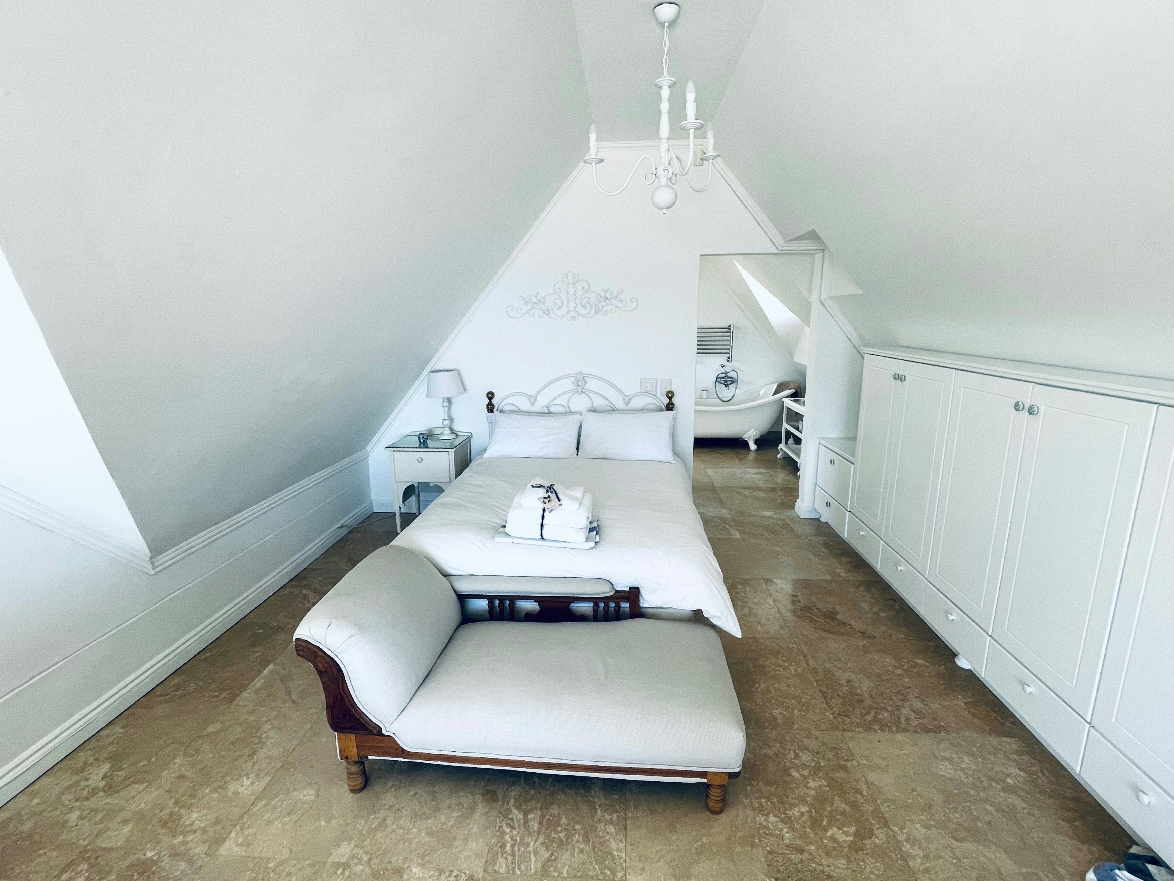 The multi-story house comprises 4 bedrooms and 4 en-suite bathrooms. Two of the bedrooms are each furnished with a double bed and an en-suite bathroom fitted with a toilet, basin, shower, and bath. These rooms are on the ground floor. The third and fourth bedrooms are furnished with double beds and have an en-suite bathroom fitted with a toilet, basin, and shower. One of these bedrooms has a sea-facing balcony and the other a seating area at the sea-facing windows. All bedrooms have sea views.