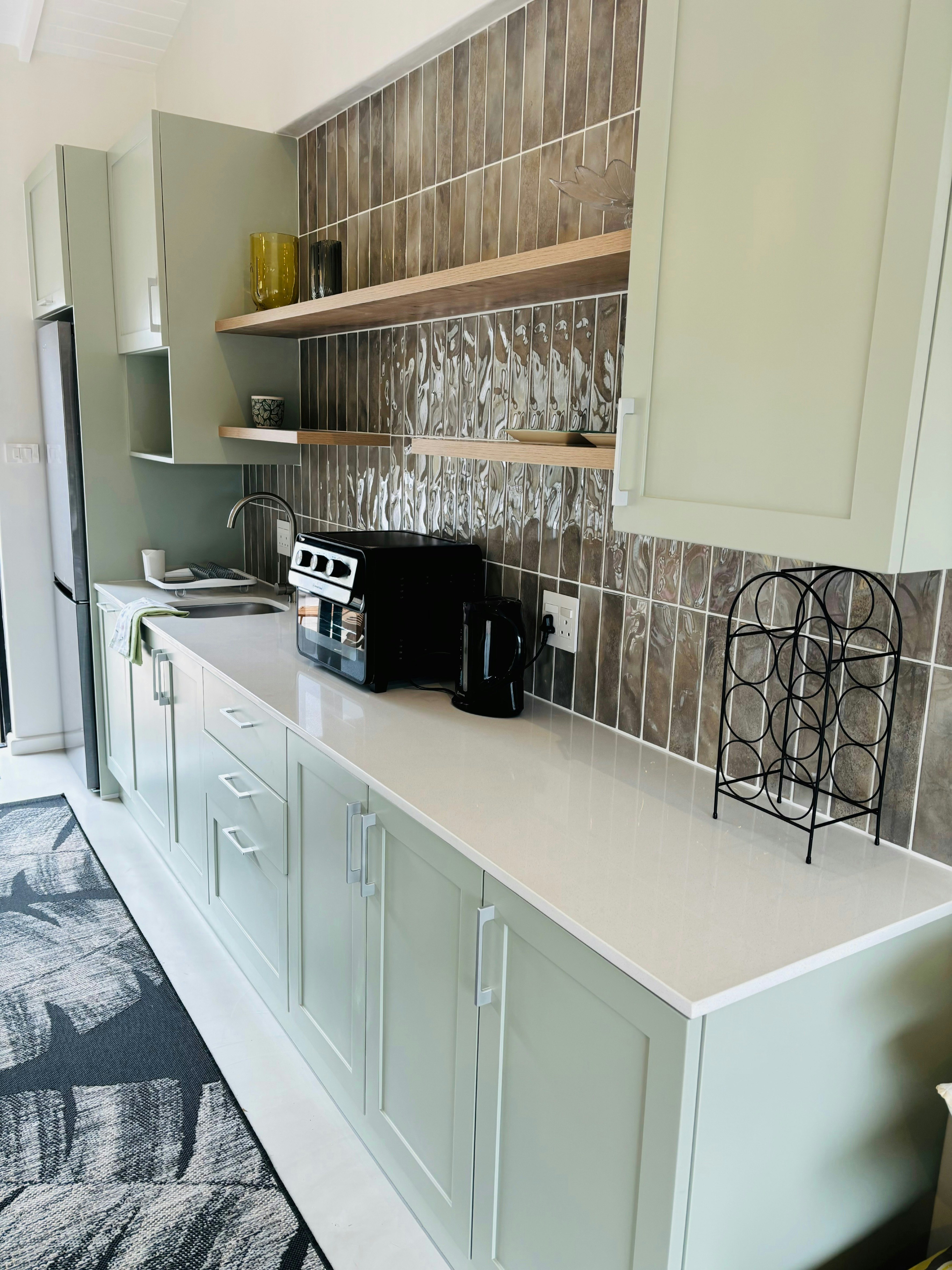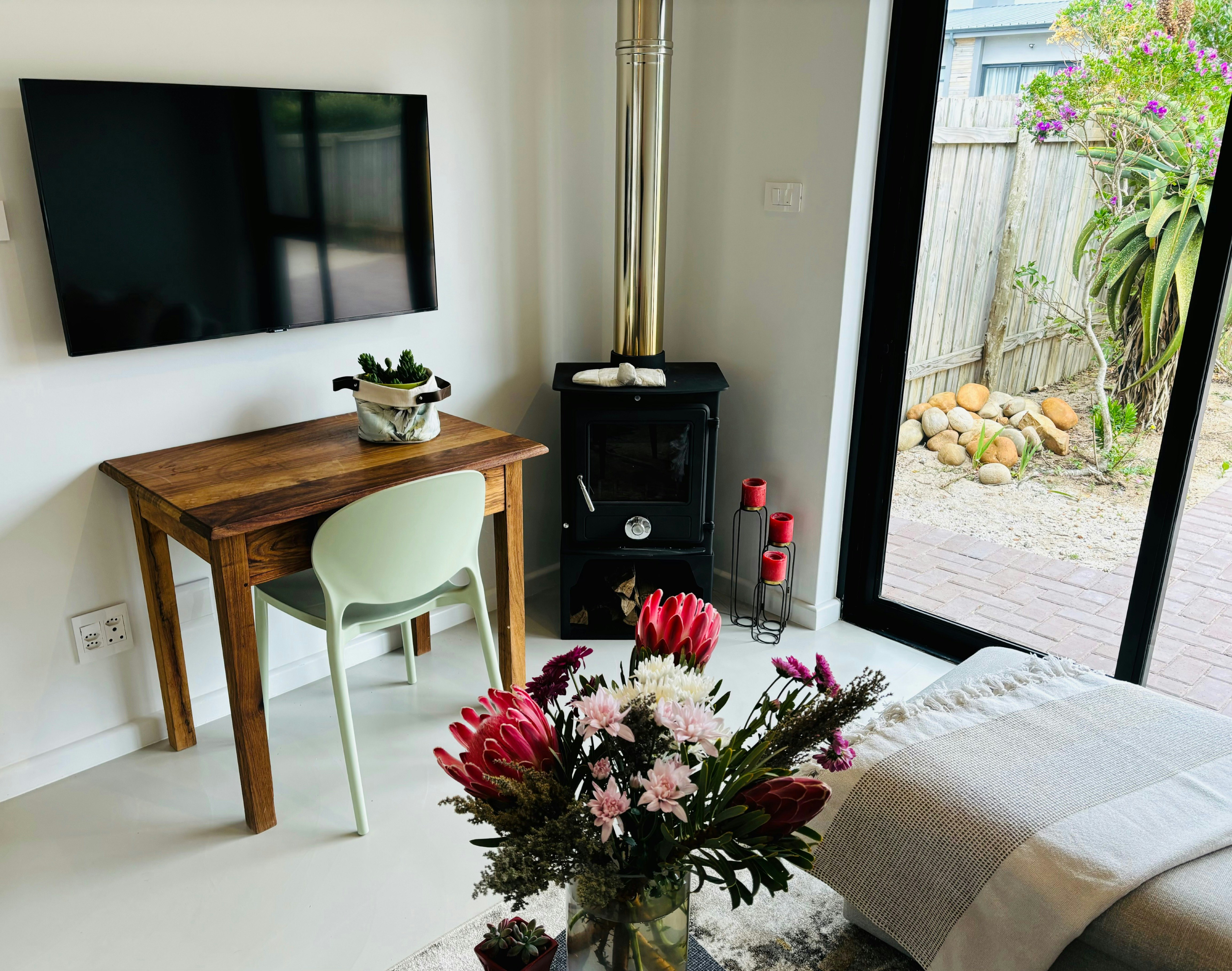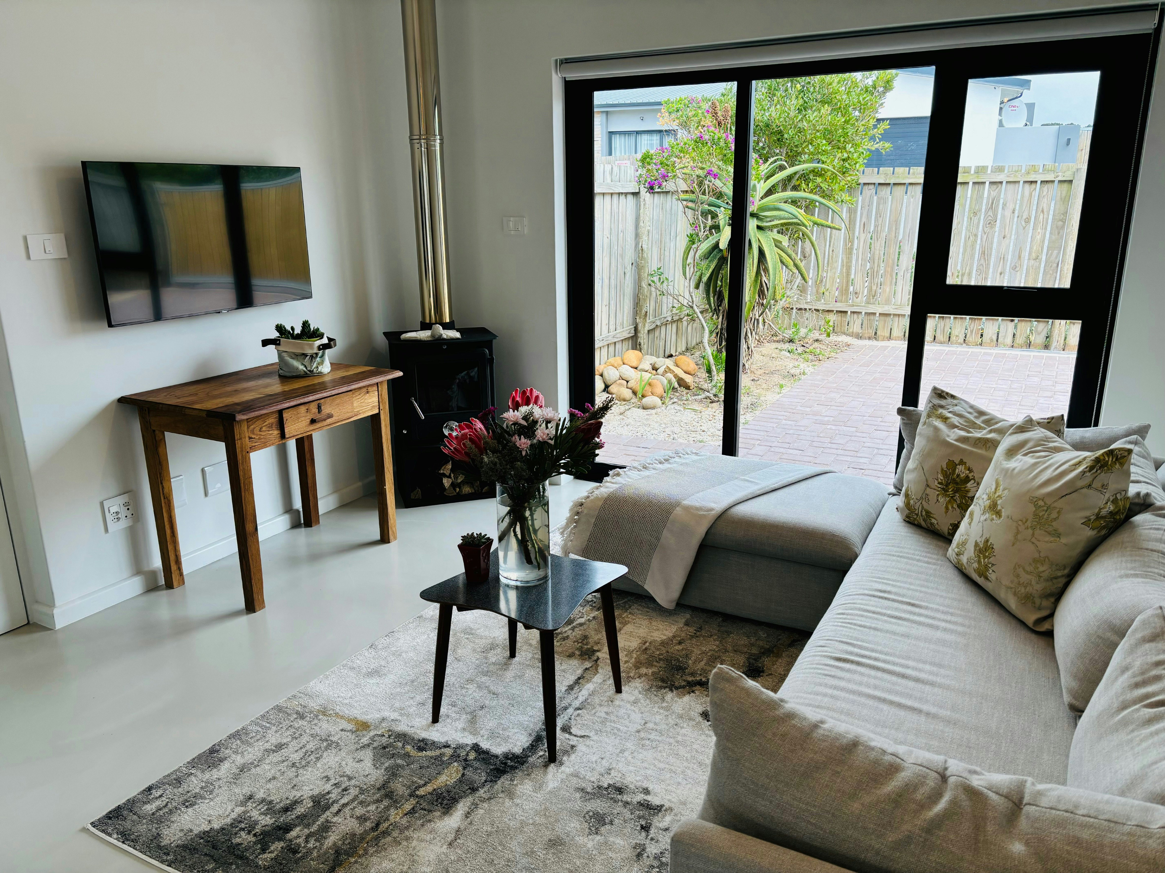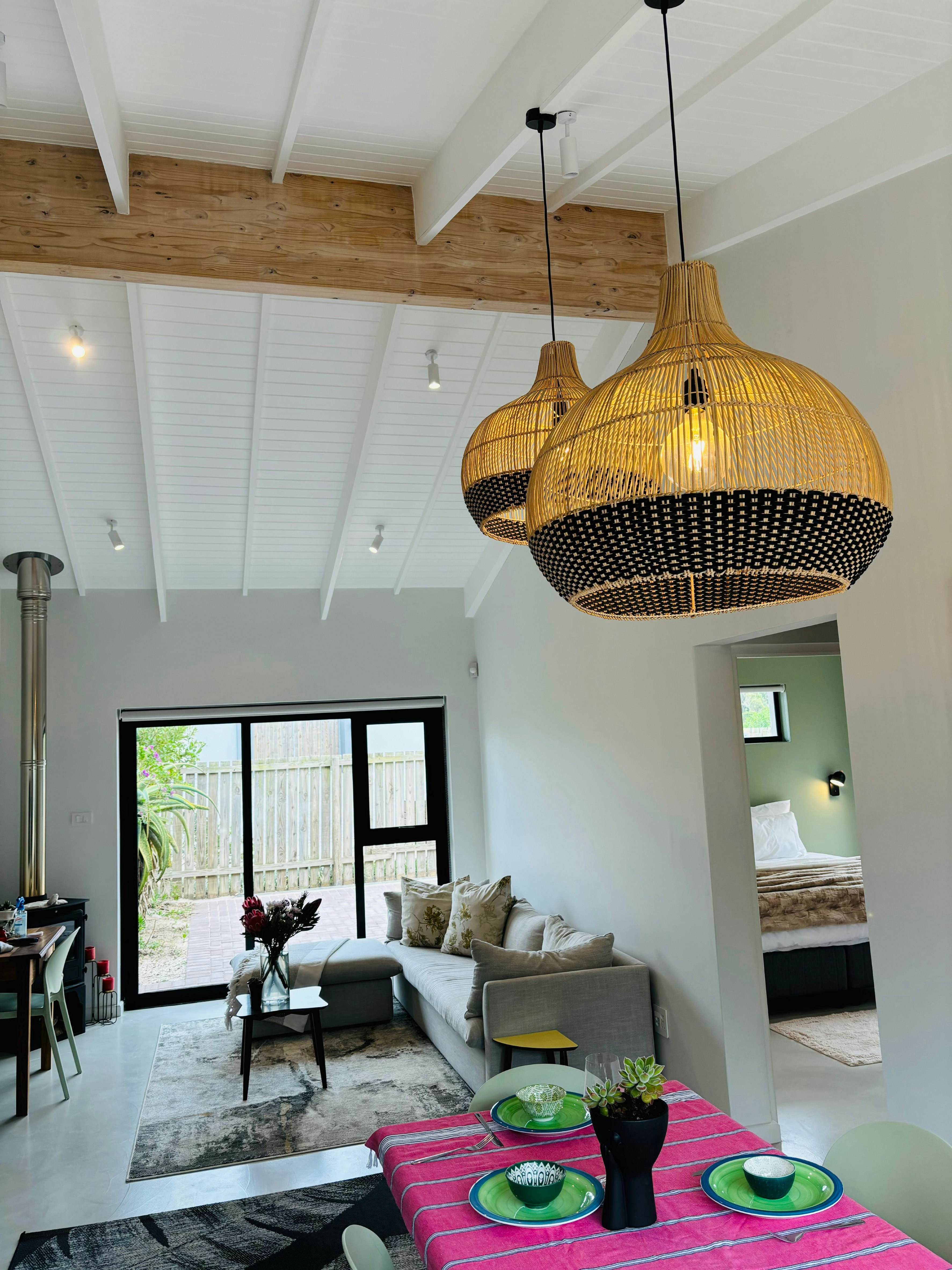 Die oopplan-leefarea sluit 'n eetarea en 'n sitkamer in wat gemeubileer is met 'n gemaklike rusbank, TV en kaggel. Die kombuis is toegerus met 'n yskas-vrieskas, stoof, oond, mikrogolf en lugbraaier asook tee- en koffiemaakgeriewe.