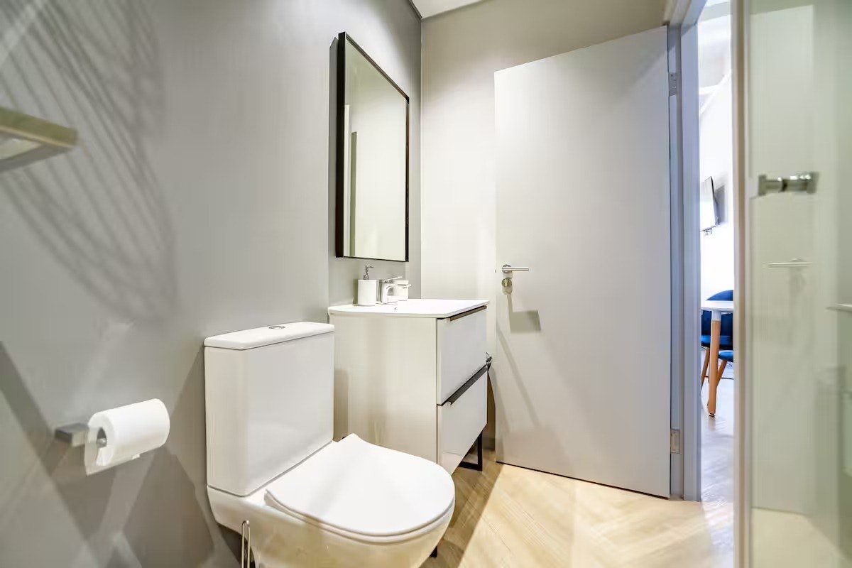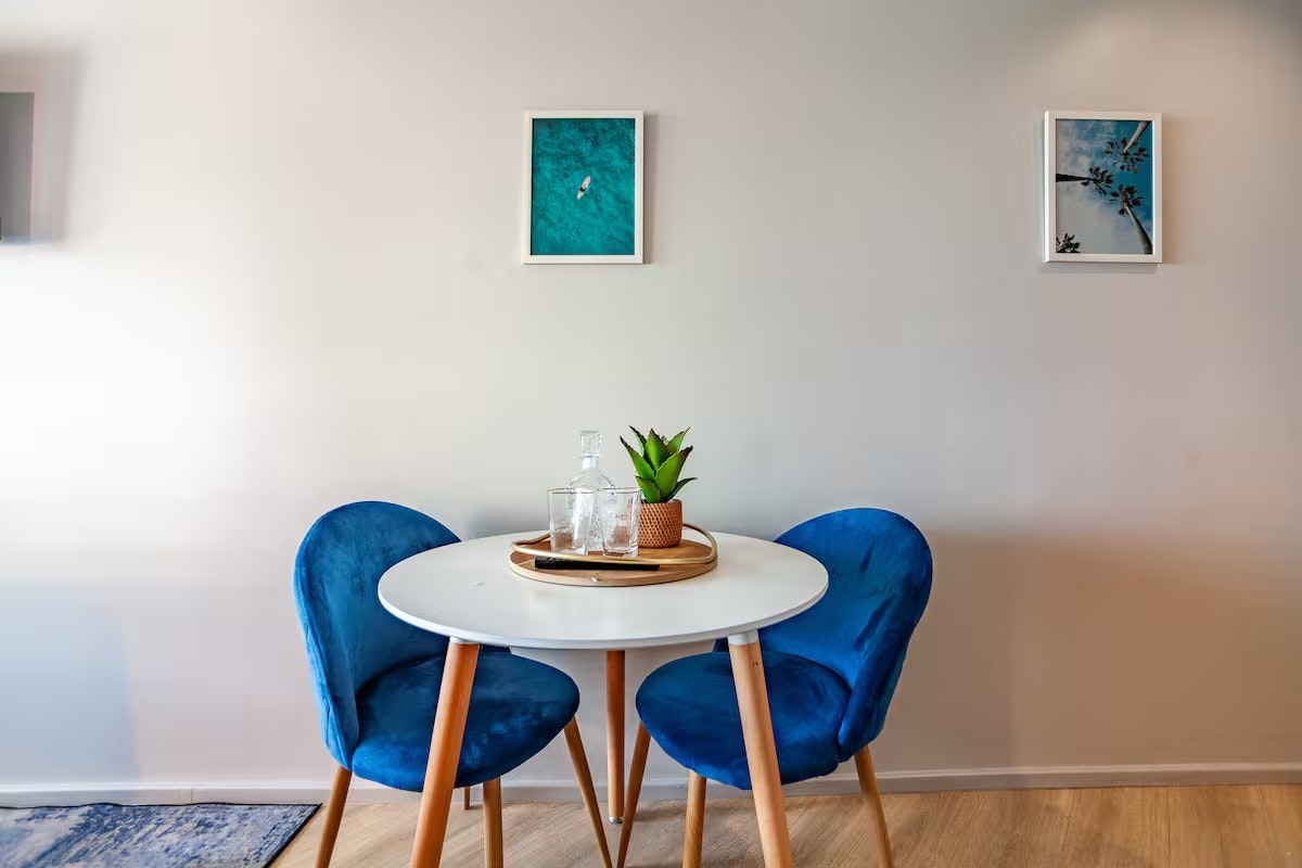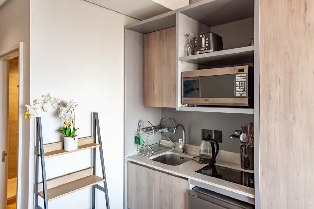 Die kombuisie is toegerus met 'n yskassie, tweeplaat-induksiestoof, mikrogolfoond, noodsaaklike eetgerei en breekware, sowel as tee- en koffiemaakgeriewe. 'n Eetkamertafel met twee sitplekke word ook voorsien. Vir vermaak en gerief sluit die ateljee 'n TV met Netflix en gratis WiFi in. Die woonstel is klimaatbeheer met sentrale lugversorging en verhitting, wat die hele jaar deur gemak verseker.