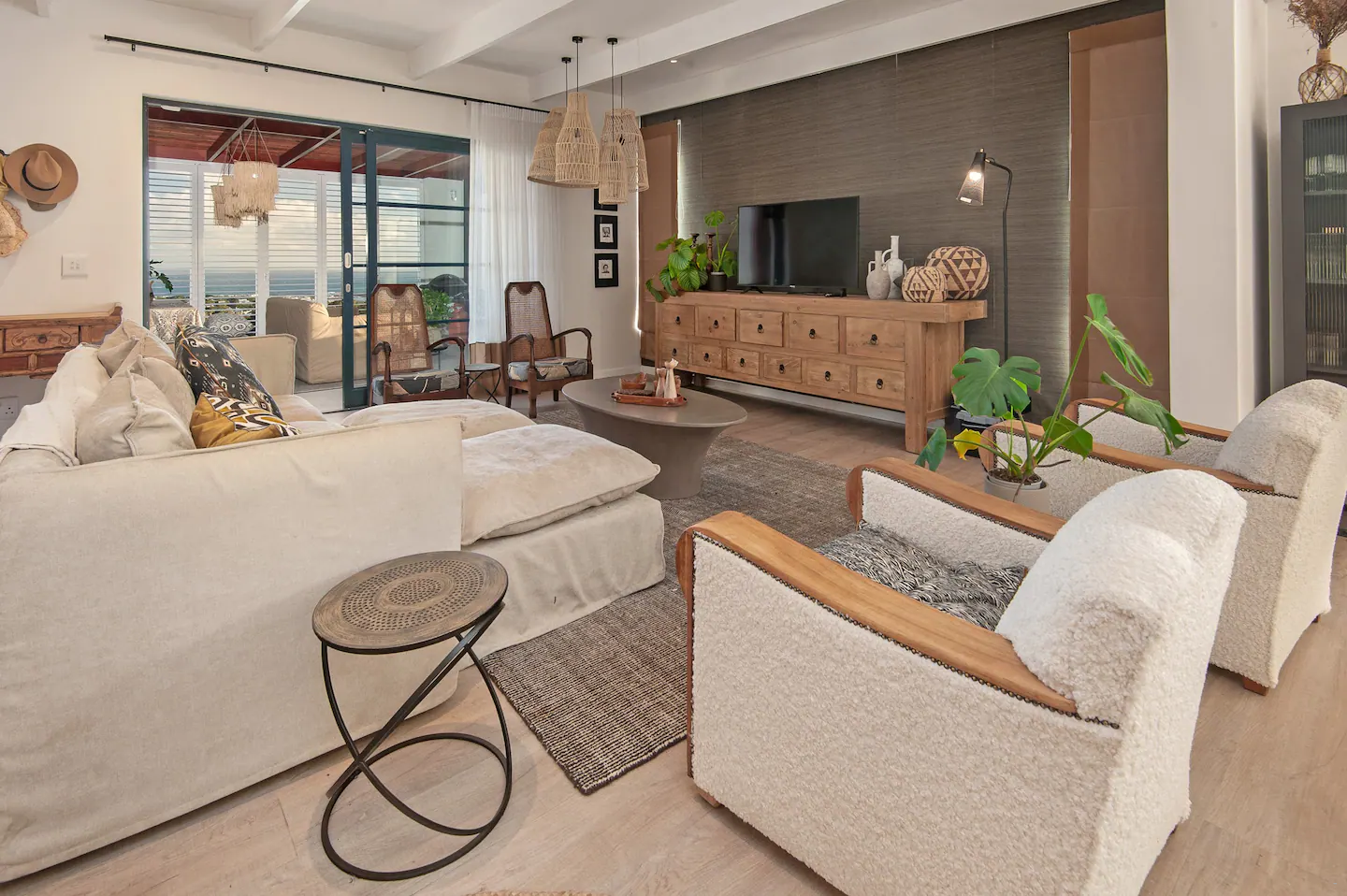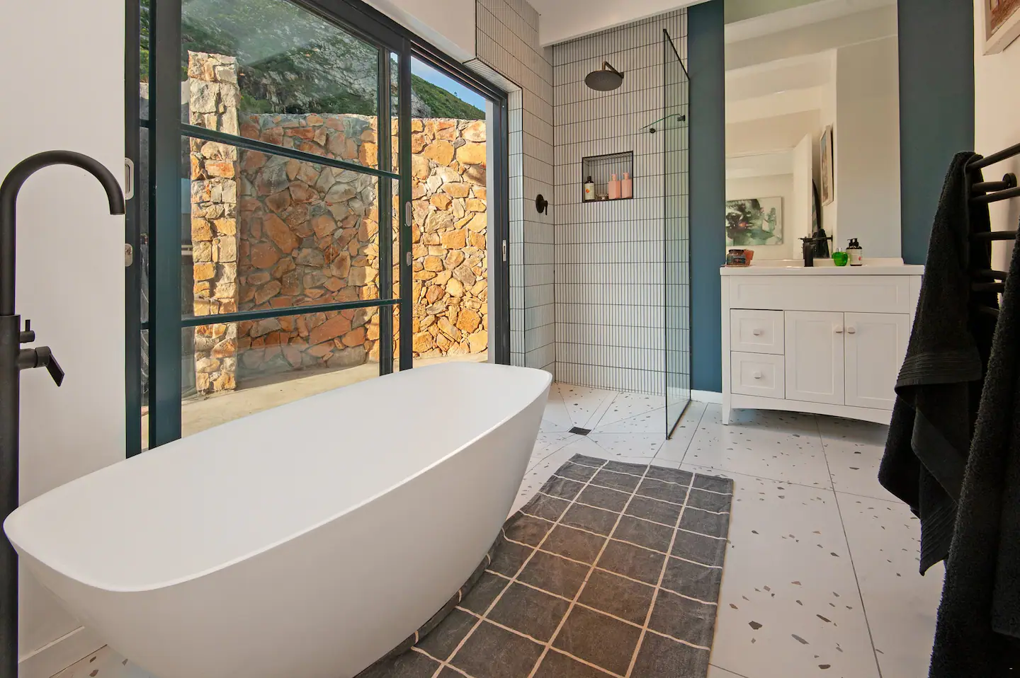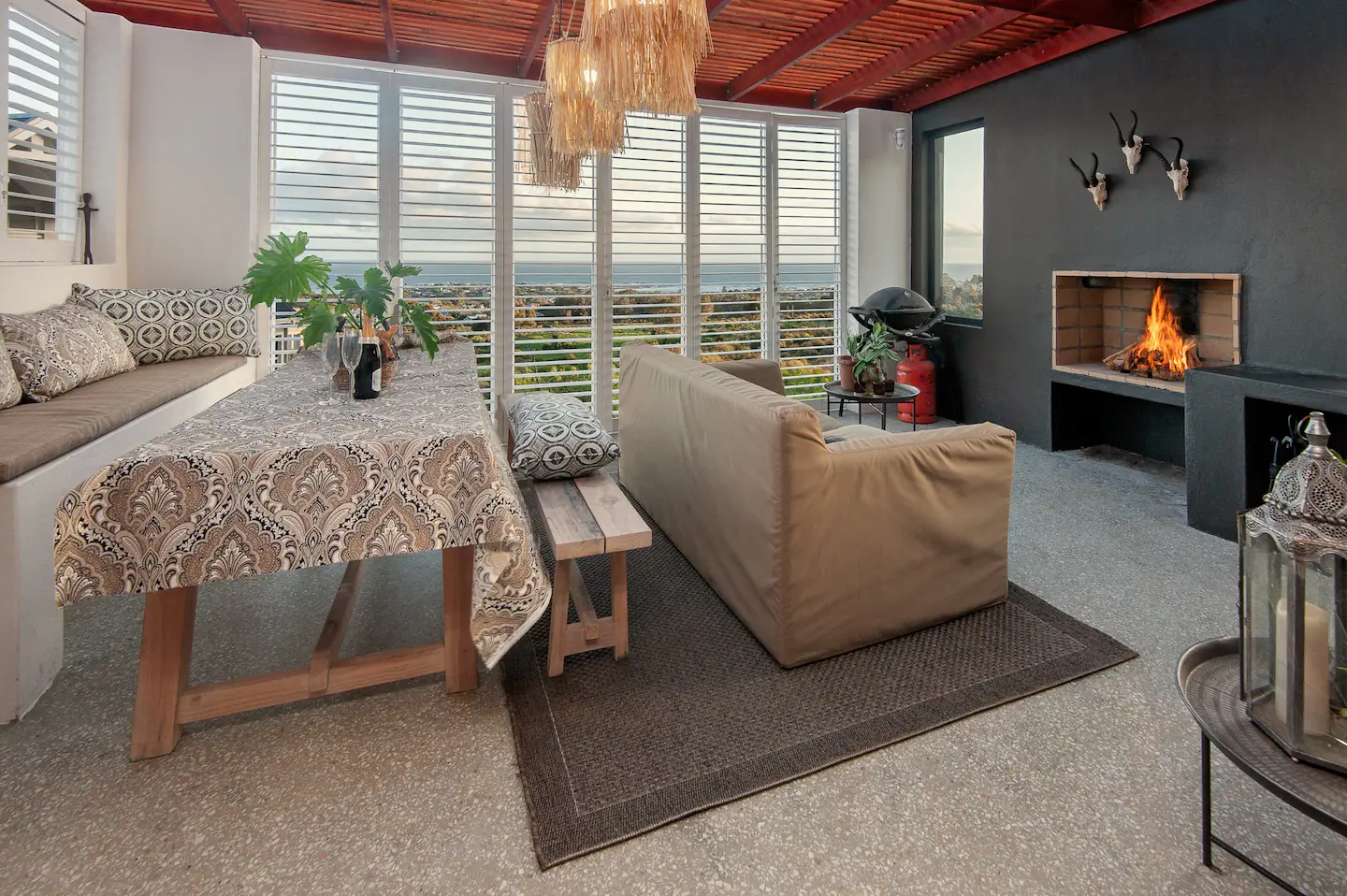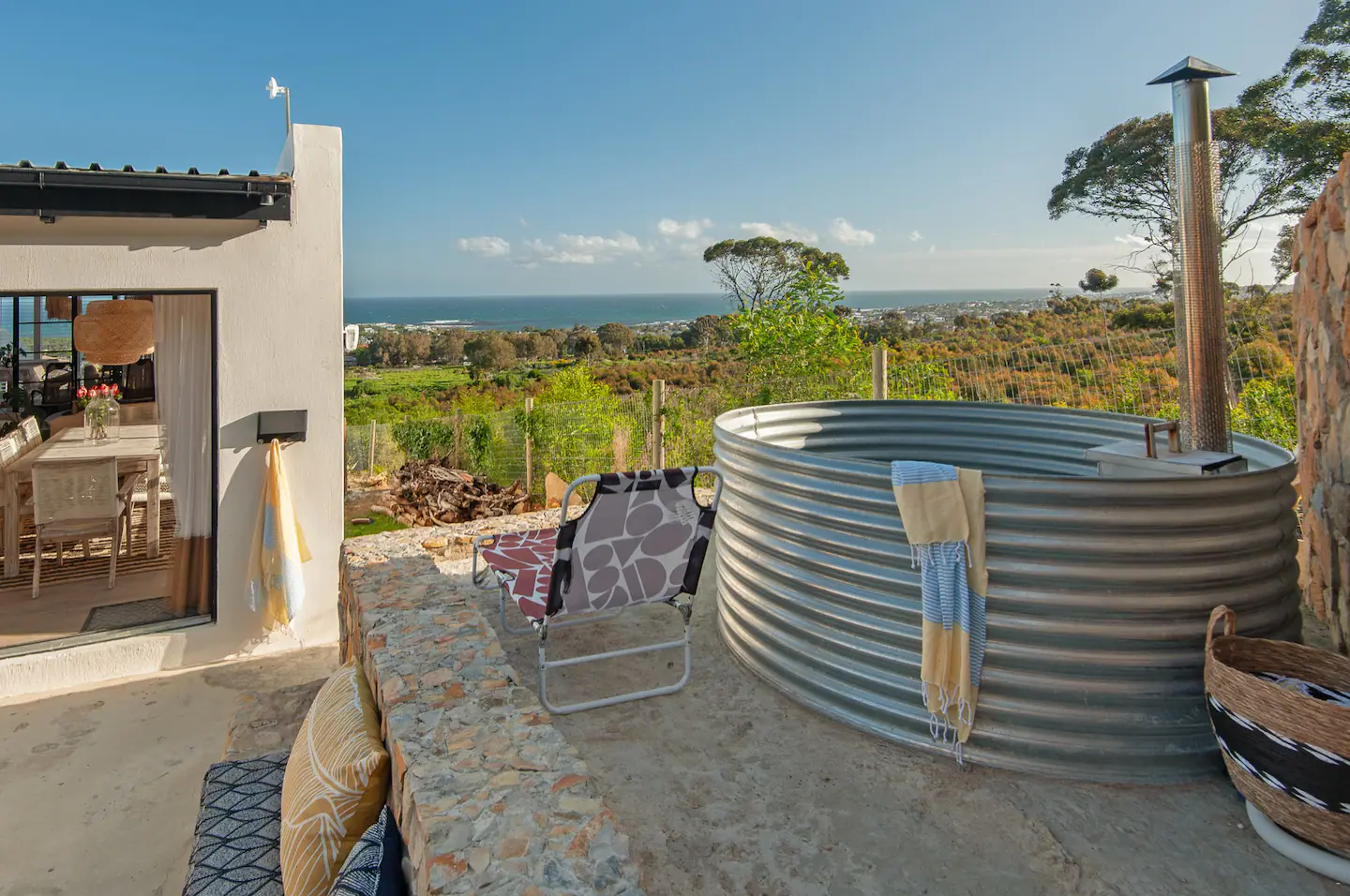Daarbenewens het hierdie huis 'n oordekte patio met 'n binnenshuise kaggel en sitplek, ideaal vir ontspanning. Buite kan gaste 'n houtvuur-warmbad en vuurput geniet, omring deur die see, berge en wynplase.