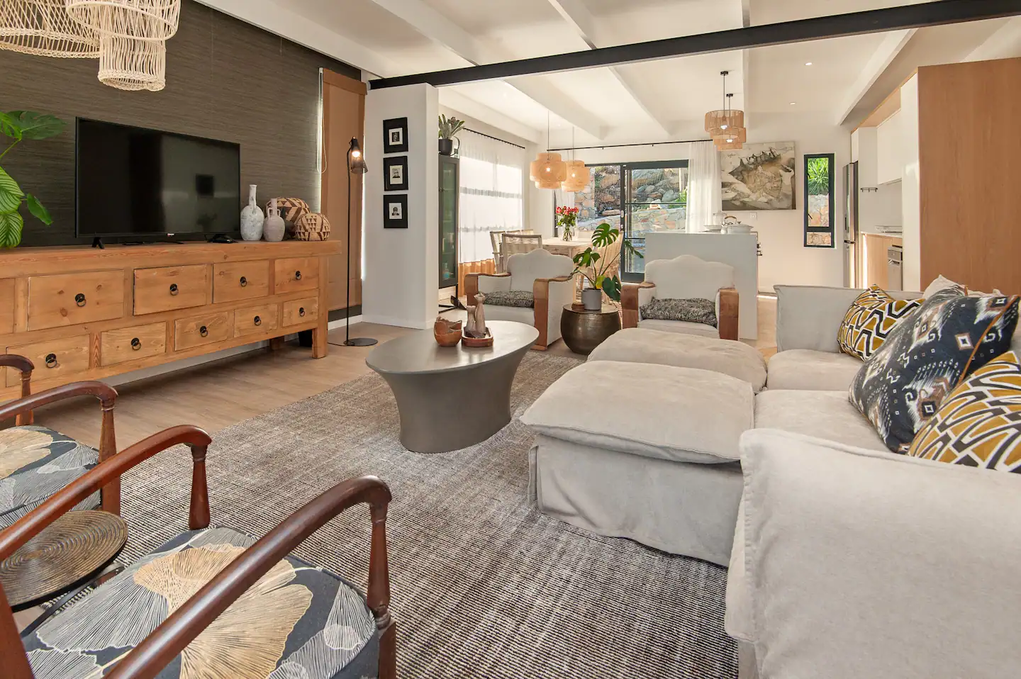 Die oopplan-leefarea beskik oor 'n volledig toegeruste kombuis met 'n gasstoof, gasoond, mikrogolfoond, ketel, broodrooster, yskas-vrieskas en 'n skottelgoedwasser. Gaste kan 'n maaltyd by die etenstafel geniet of ontspan op een van die gemaklike rusbanke in die sitkamer. Vir gaste-vermaak is 'n TV en toegang tot gratis WiFi beskikbaar. Daar is 'n omsetter wat die TV en WiFi sal laat loop in geval van kragonderbrekings.