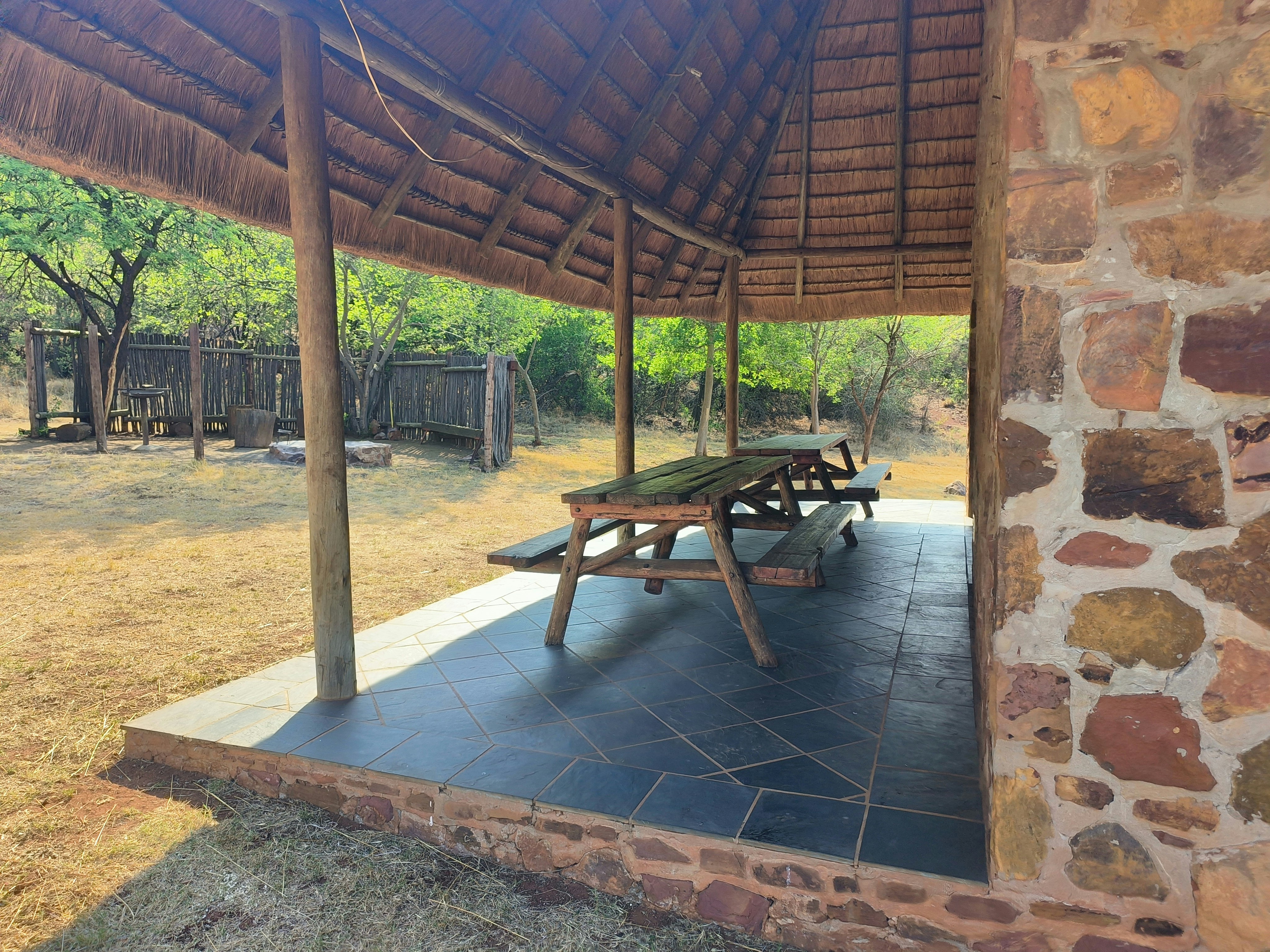 The cabin is lit up with lights powered by solar panels, and also works for cell phone chargers. A boma with braai facilities are available outside, and the cabin present a patio as well.