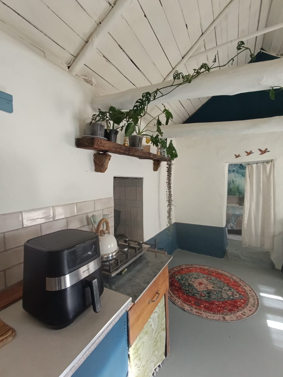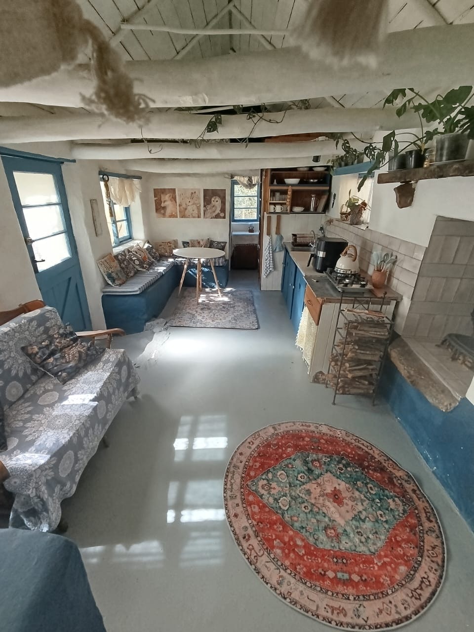 The open-plan living area offers a fully equipped kitchenette fitted with a modern 2-plate gas stove, air fryer, Queen Anne woodstove, and a full-sized fridge-freezer. There is also a comfortable dining area. The living area offers a small couch and reading material next to the woodstove for those cozy nights. There is a desk and chair suitable for working on your laptop or watching a movie. Our resident cats love to visit guests at the cottage.