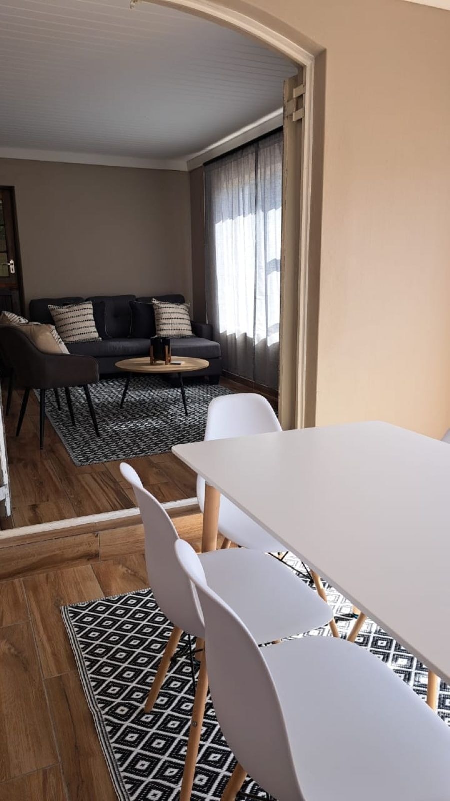 The kitchen is open-plan to the living area and is equipped with a fridge-freezer, microwave, oven, gas stove, cutlery, crockery, and tea- and coffee-making facilities. The living area includes comfortable couches opening onto a 6-seater dining table.