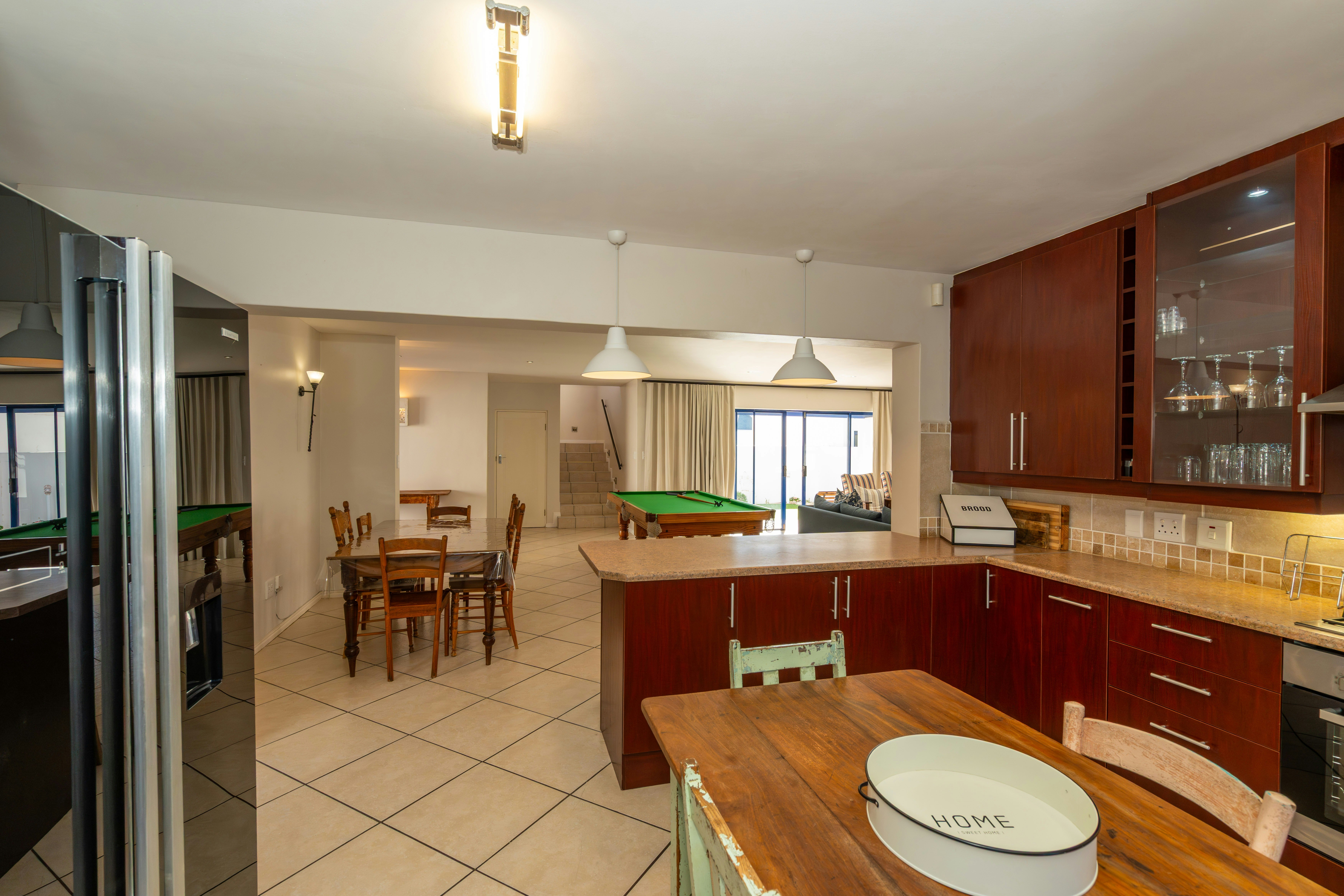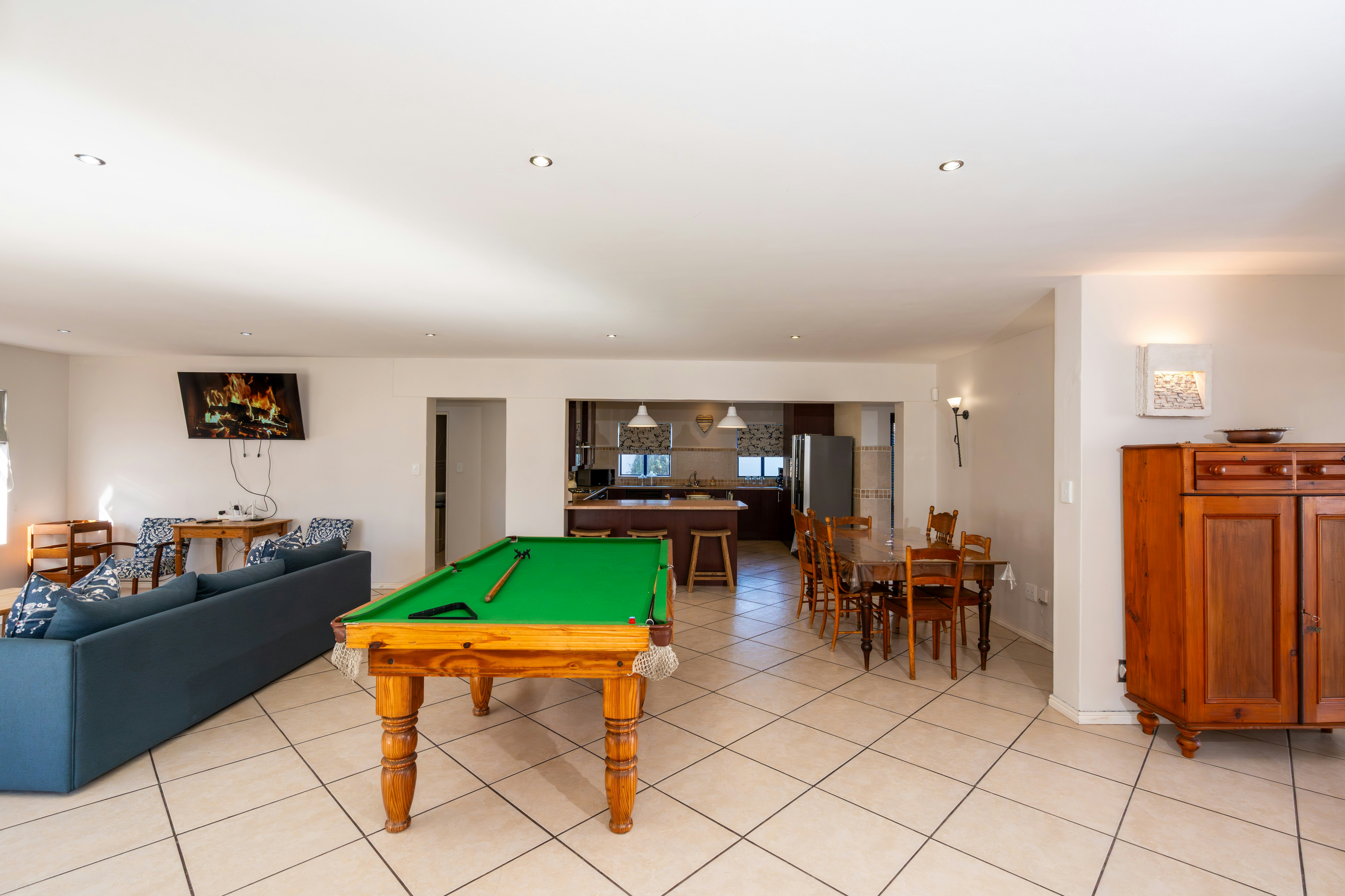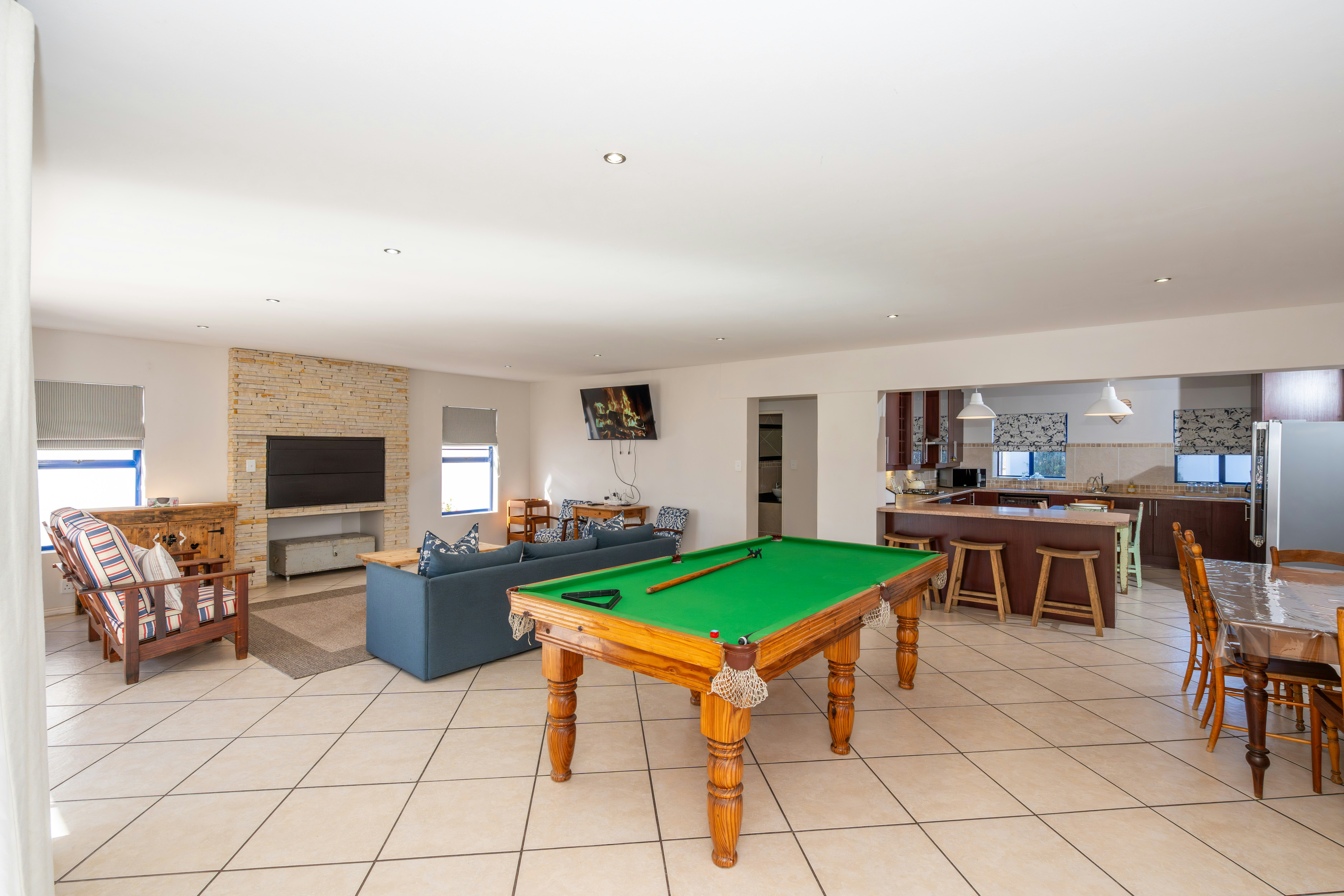 The kitchen is open-plan to the living area and is equipped with a fridge-freezer, microwave, oven, gas stove, cutlery, crockery, and tea- and coffee-making facilities. The living area includes a dining table, a pool table, a built-in braai, and comfortable couches.