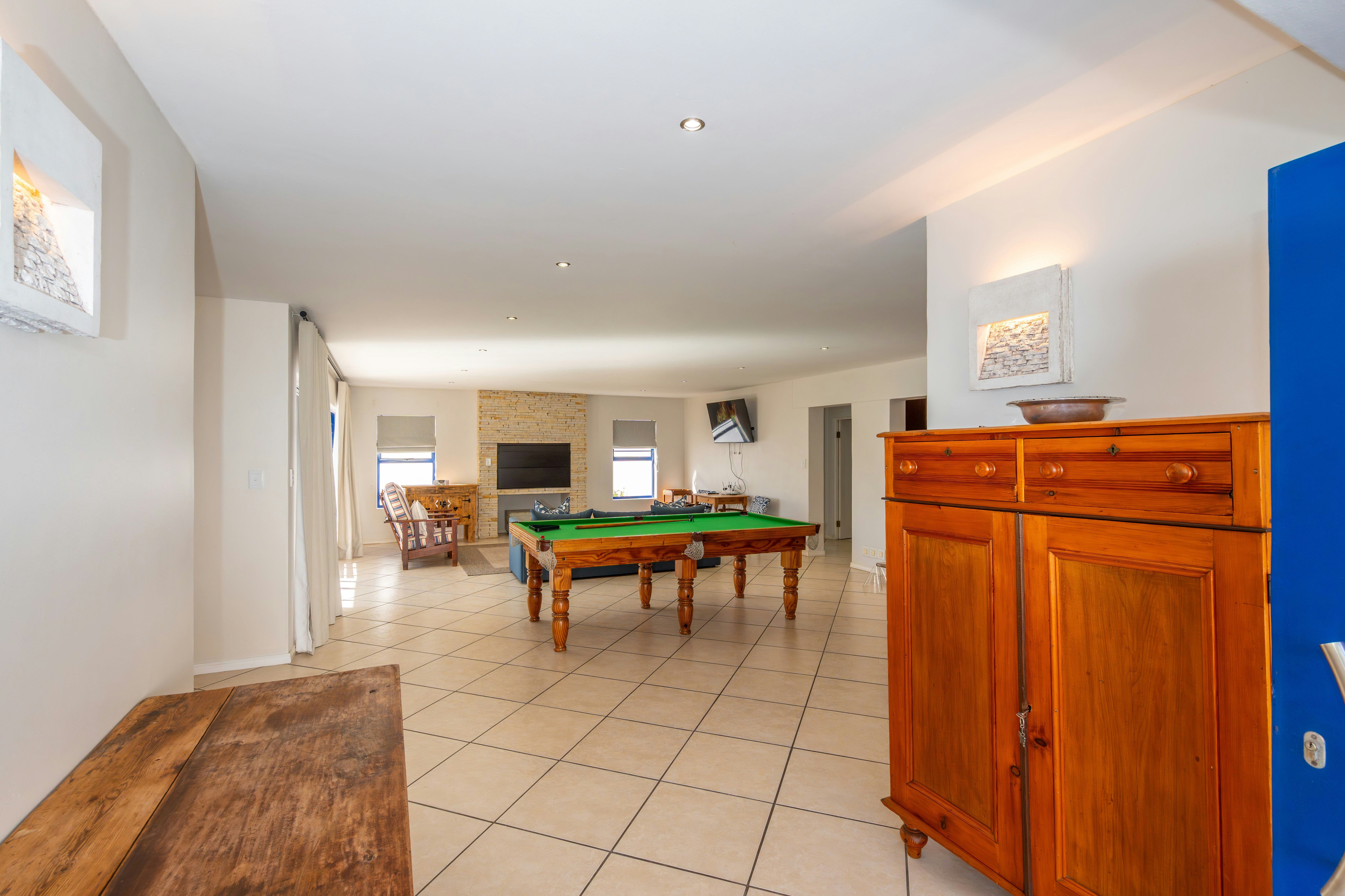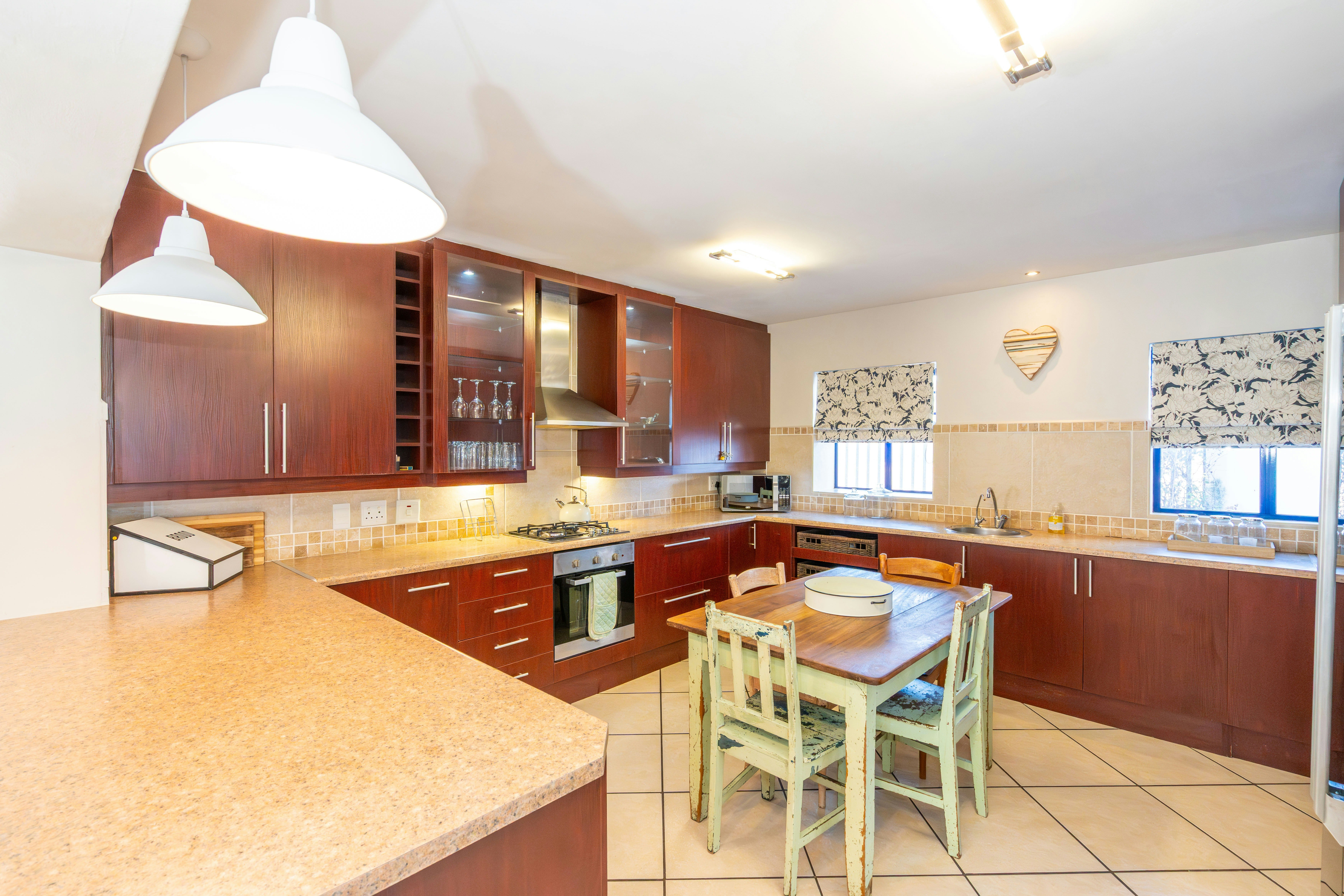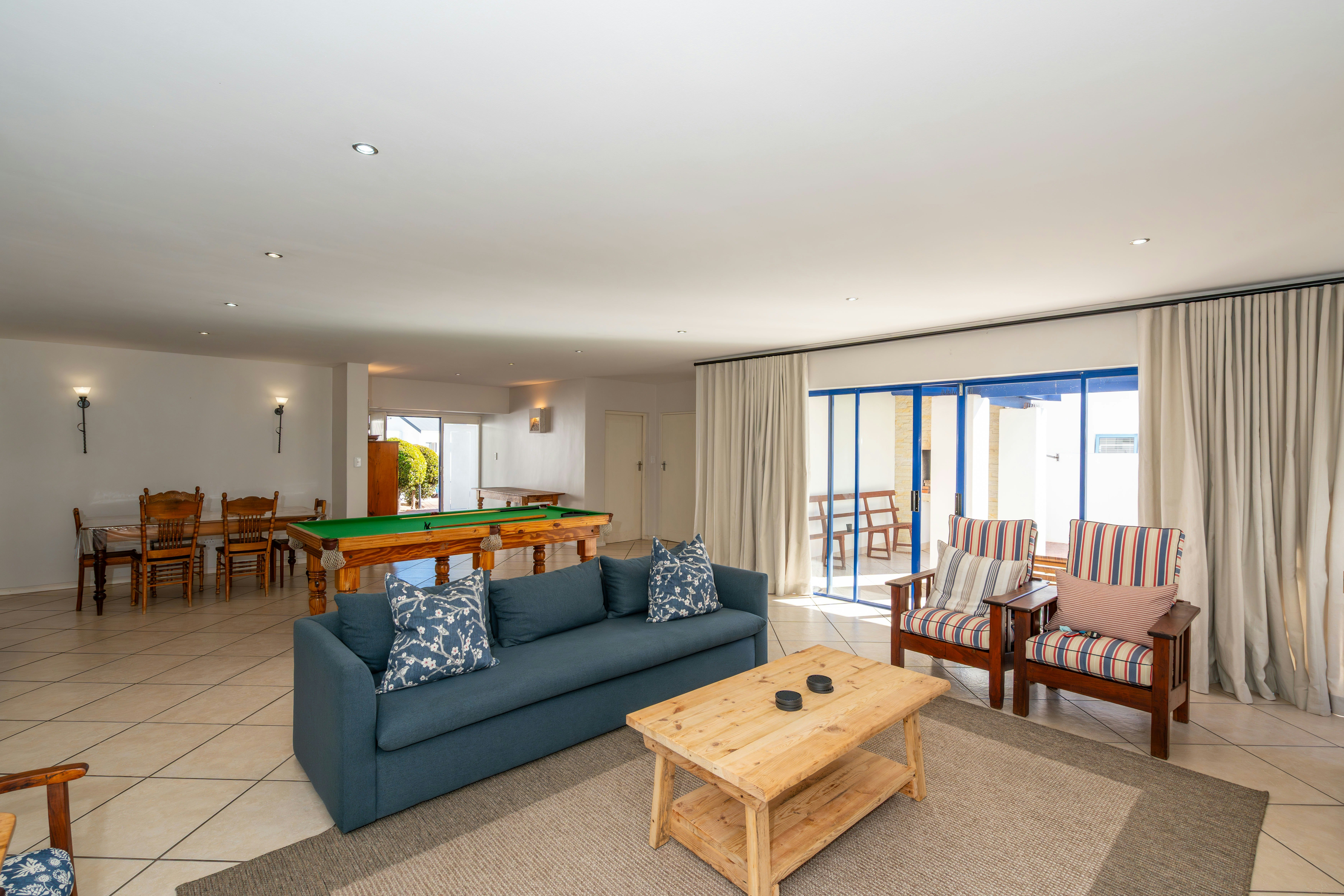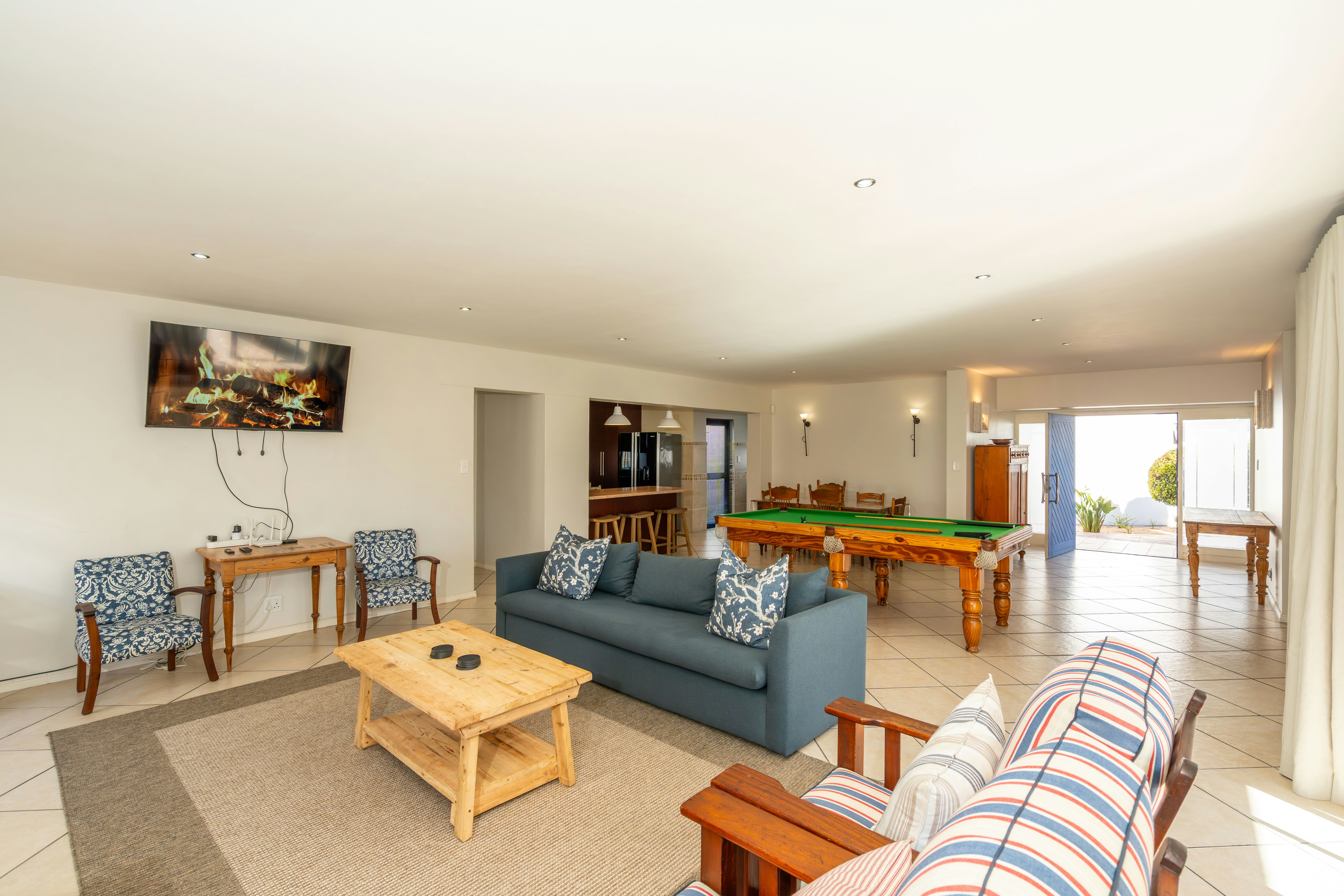 The kitchen is open-plan to the living area and is equipped with a fridge-freezer, microwave, oven, gas stove, cutlery, crockery, and tea- and coffee-making facilities. The living area includes a dining table, a pool table, a built-in braai, and comfortable couches.