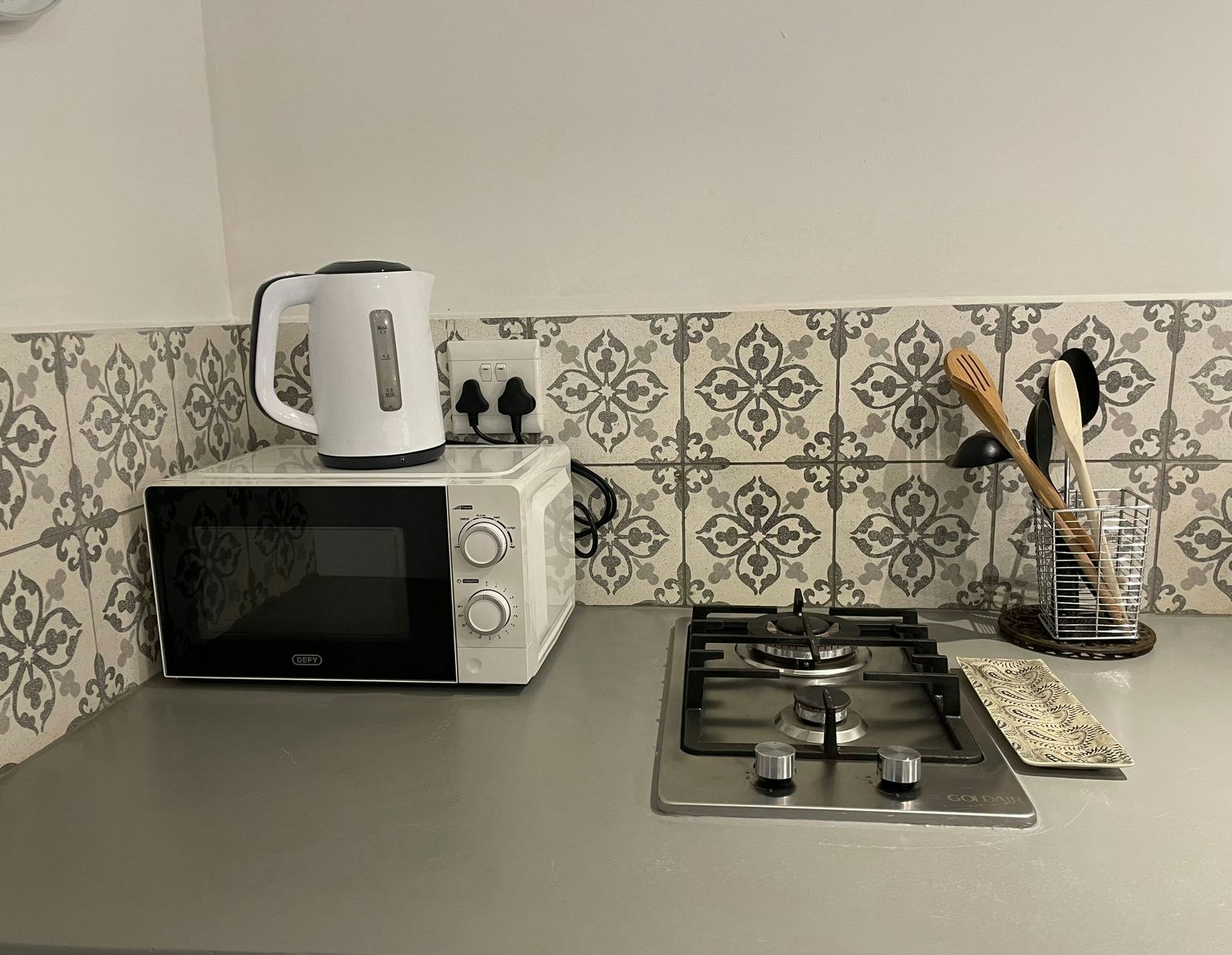 The kitchenette is equipped with a bar fridge, a 2-plate gas stove, microwave, toaster, basic cutlery and crockery, as well as tea- and coffee-making facilities. There’s a private patio outside with a small dining table and chairs where guests can enjoy their meals together. Guests are afforded secure, covered parking behind a remote-controlled gate.