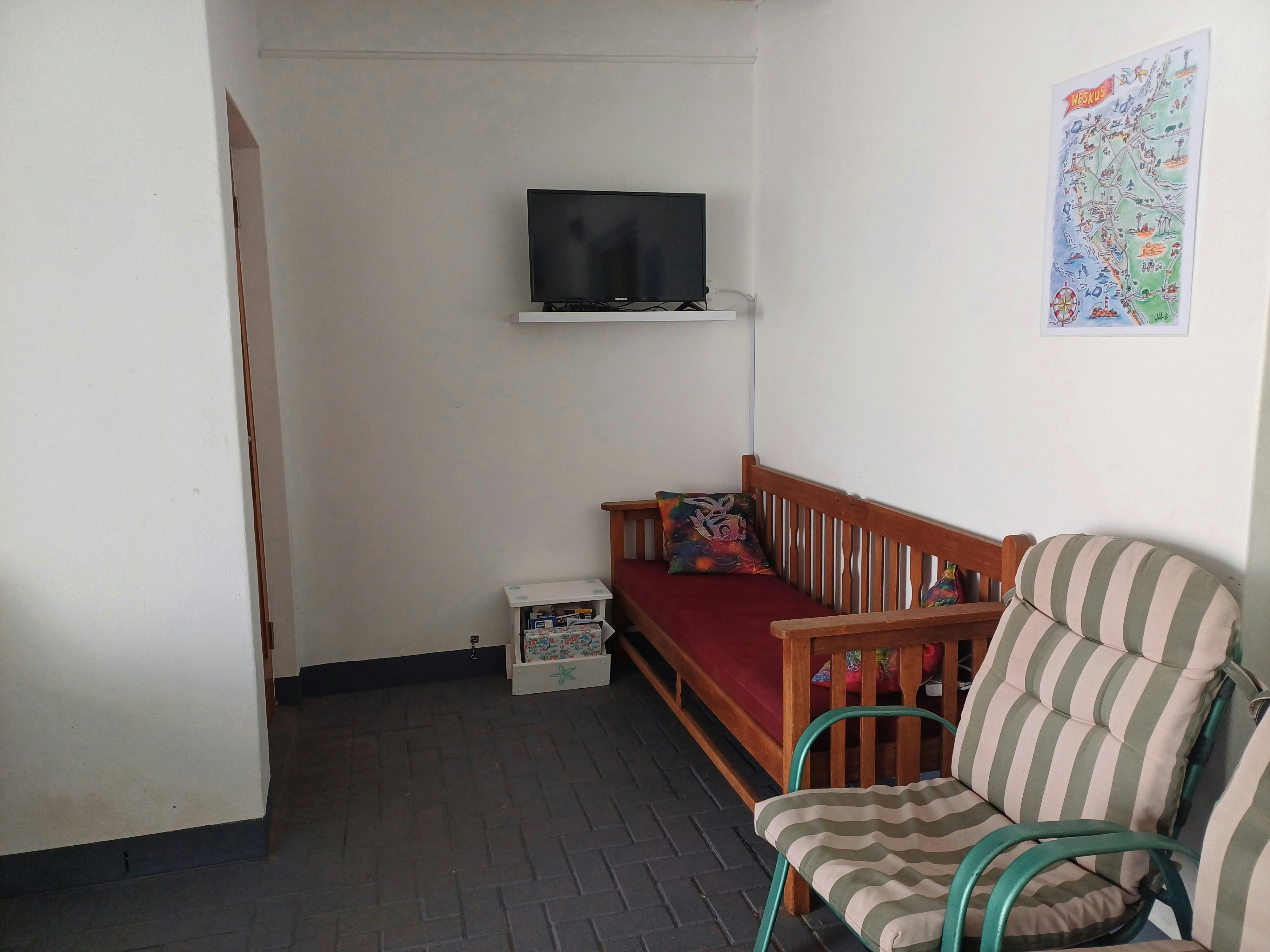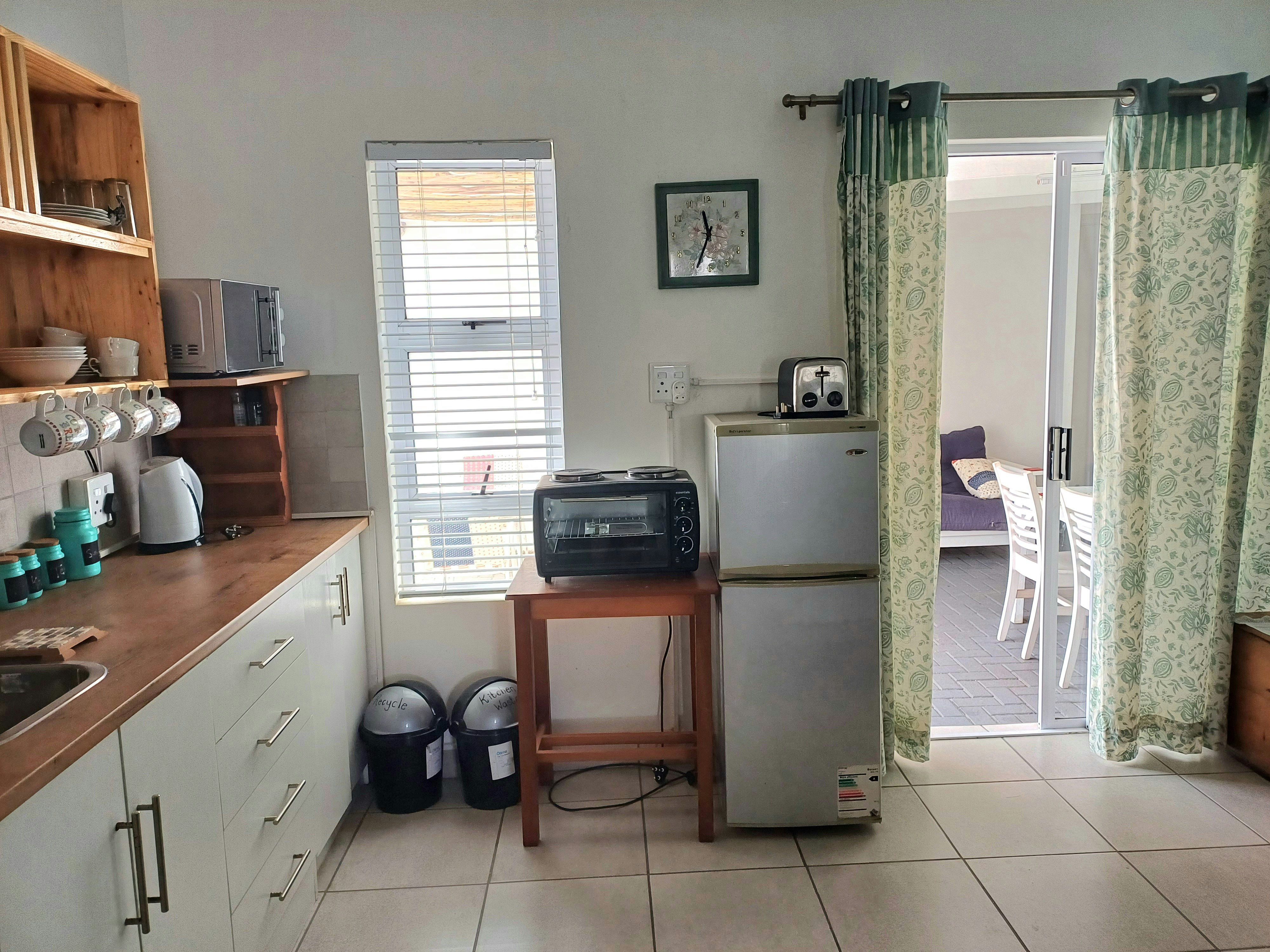 The kitchen is fully equipped with a fridge-freezer, mini-oven with a two-plate stove, microwave, toaster, kettle, and braai pan. Guests also have access to free Wi-Fi and a TV with Openview channels.