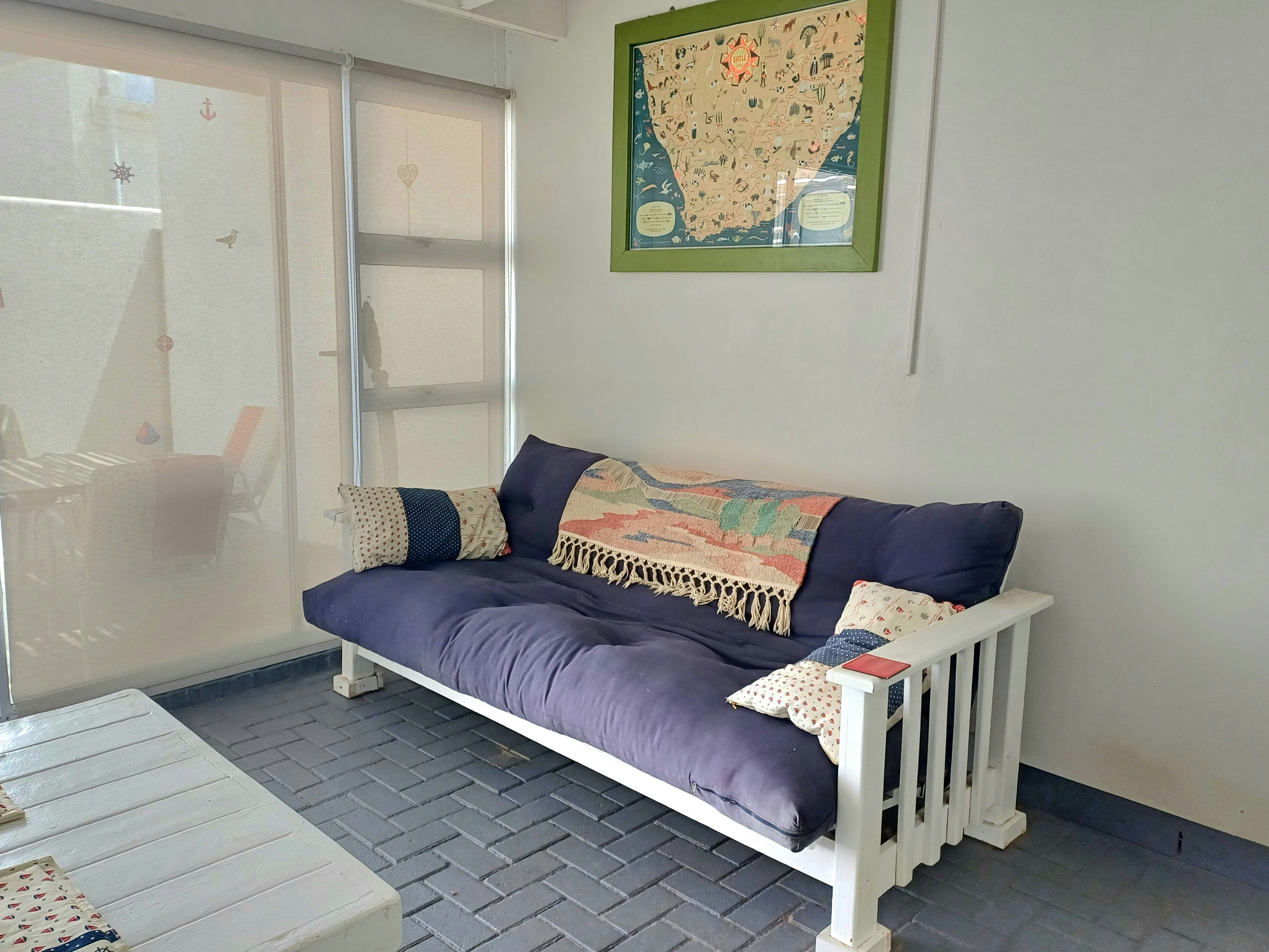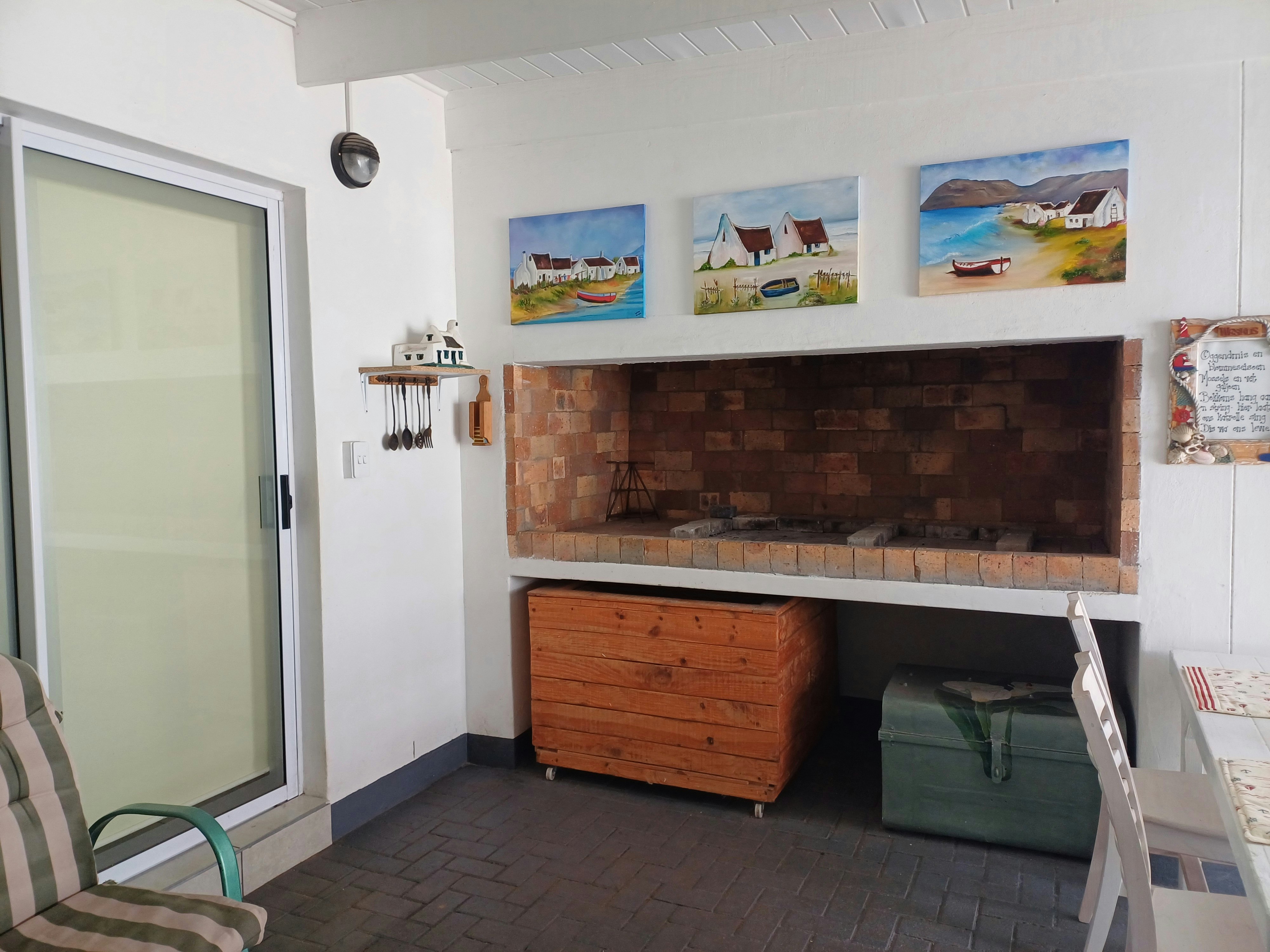 The enclosed braai room features built-in facilities and opens onto a patio with a table and seating for four. Guests are welcome to relax on the blue garden couch while enjoying the fresh air and views of the sea.