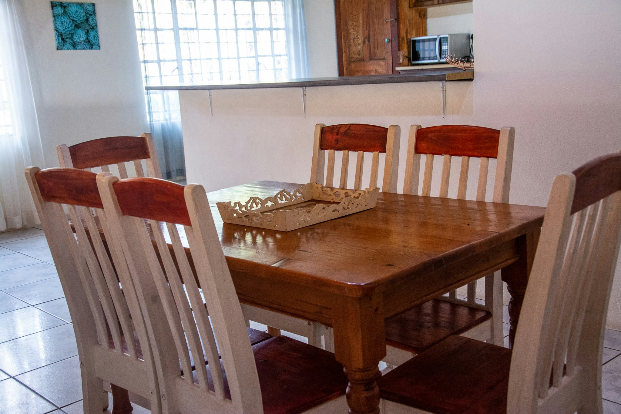 The kitchen is well-equipped with a fridge, gas stove as well as microwave. The kitchen leads to the dining area. The spacious living area features a lounge suite and opens onto the patio which boasts panoramic views of the mountains and river.