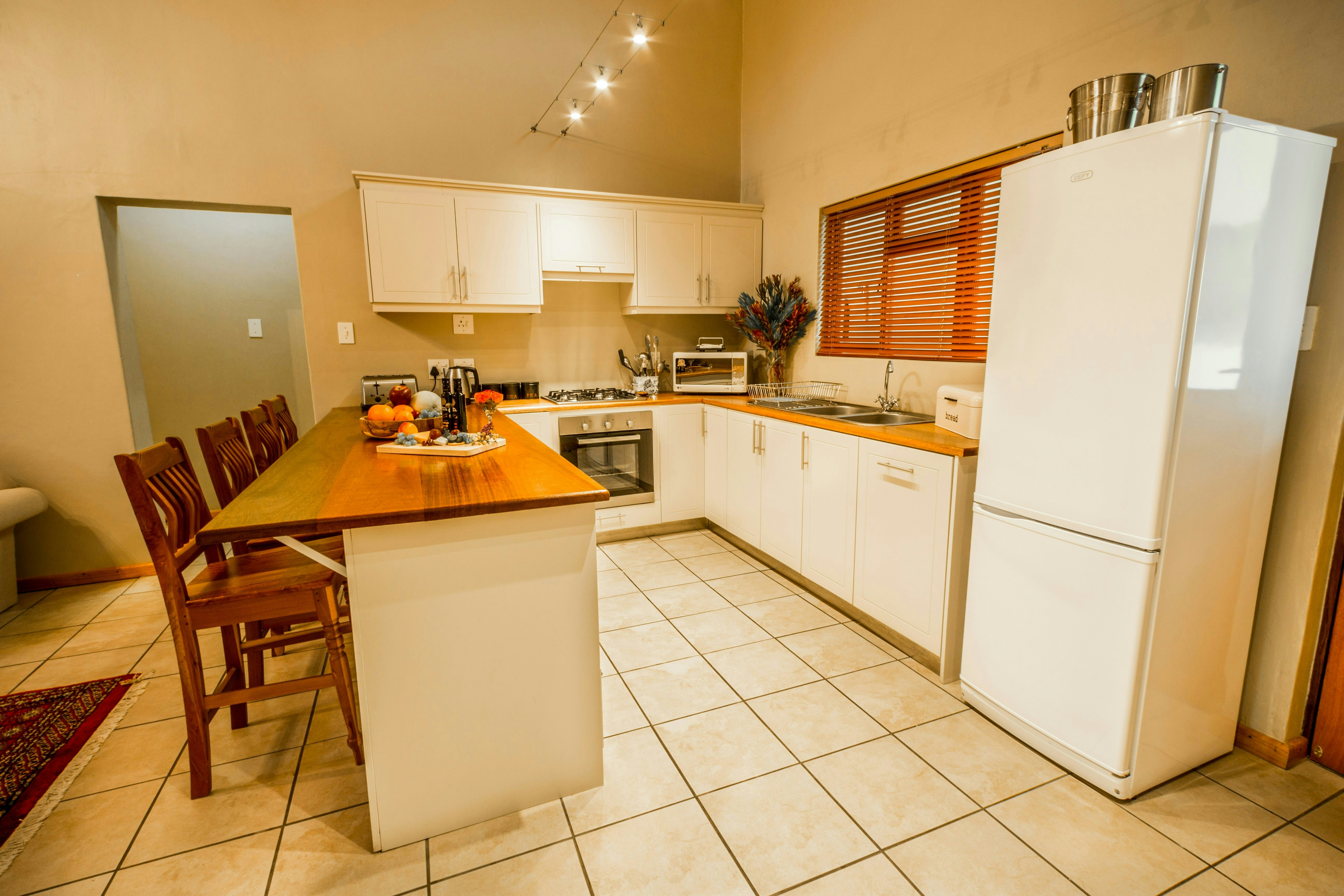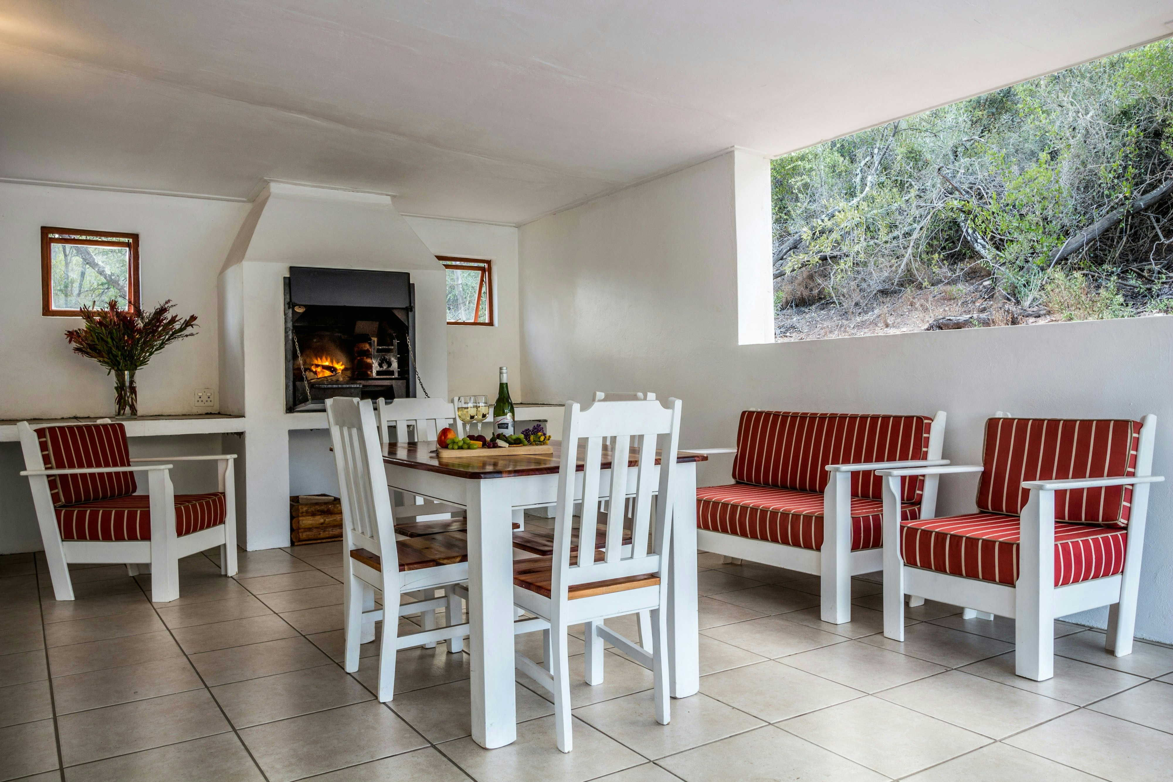 Die kombuis is met 'n gasstoof, oond, mikrogolf, ketel, broodrooster, eetgerei, breekware en 'n yskas-vrieskas toegerus. Die sitkamer en eetarea het gemaklike sitplek vir gaste om te eet en te ontspan, en spog ook met 'n houtkaggel. 'n TV met DStv-kanale en gratis WiFi is beskikbaar.
