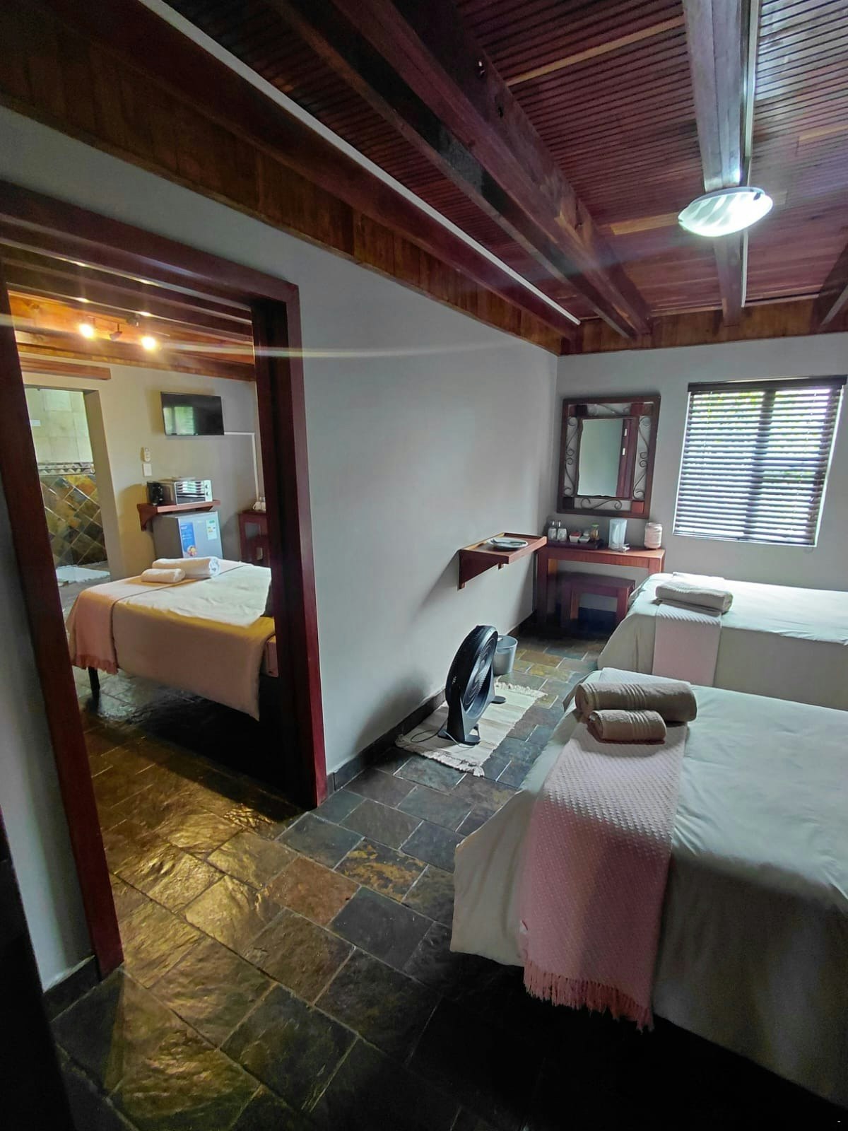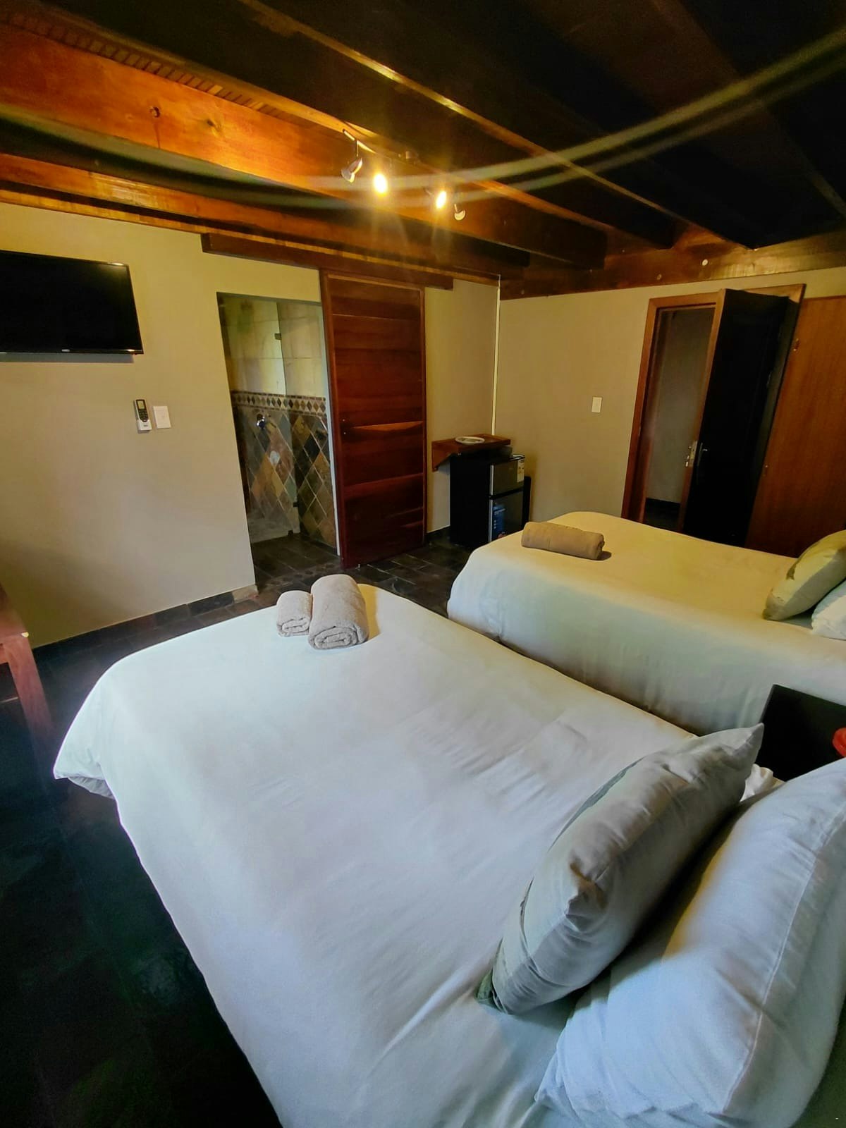 Accommodation is offered in 6 lovely rooms that can comfortably accommodate 2 to 4 guests each. The rooms are furnished with 2 three-quarter beds that can be converted into a king-size bed. The en-suite bathroom is fitted with either a bath or a shower.