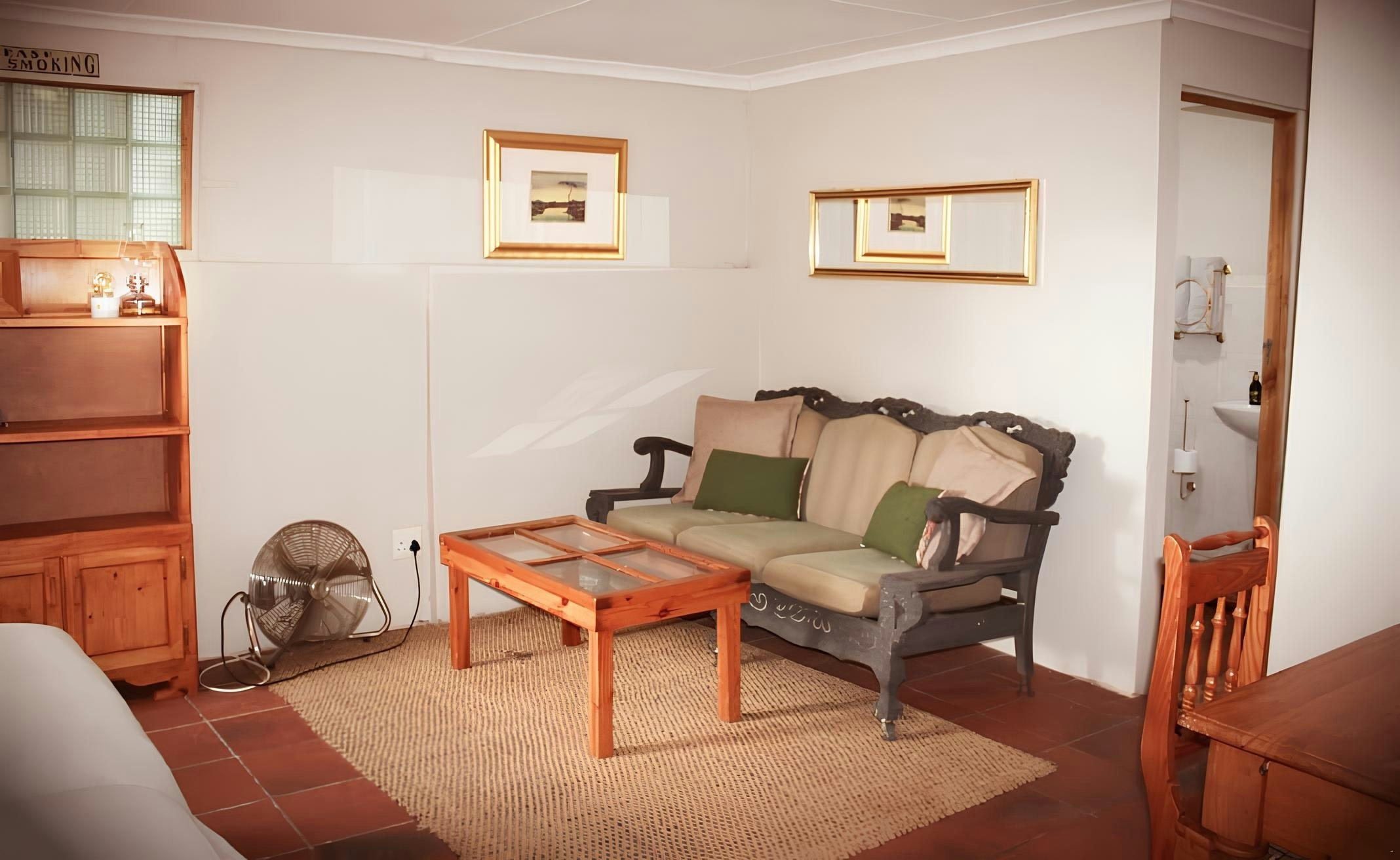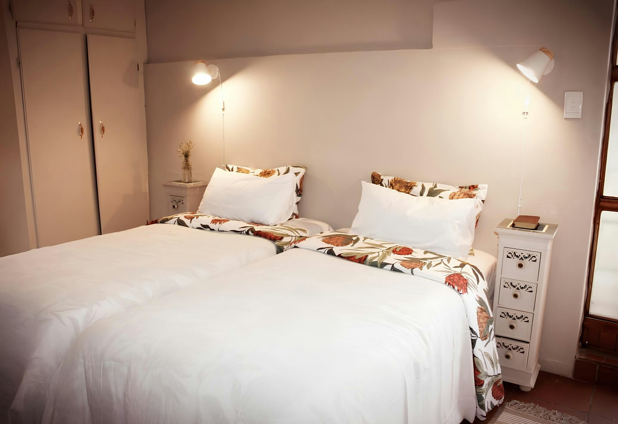 This cottage accommodates 2 guests and features an open-plan sleeping area with an en-suite bathroom. The sleeping area contains 2 single beds, and the bathroom is fitted with a shower, toilet, and washbasin. Linen and bath towels are provided.