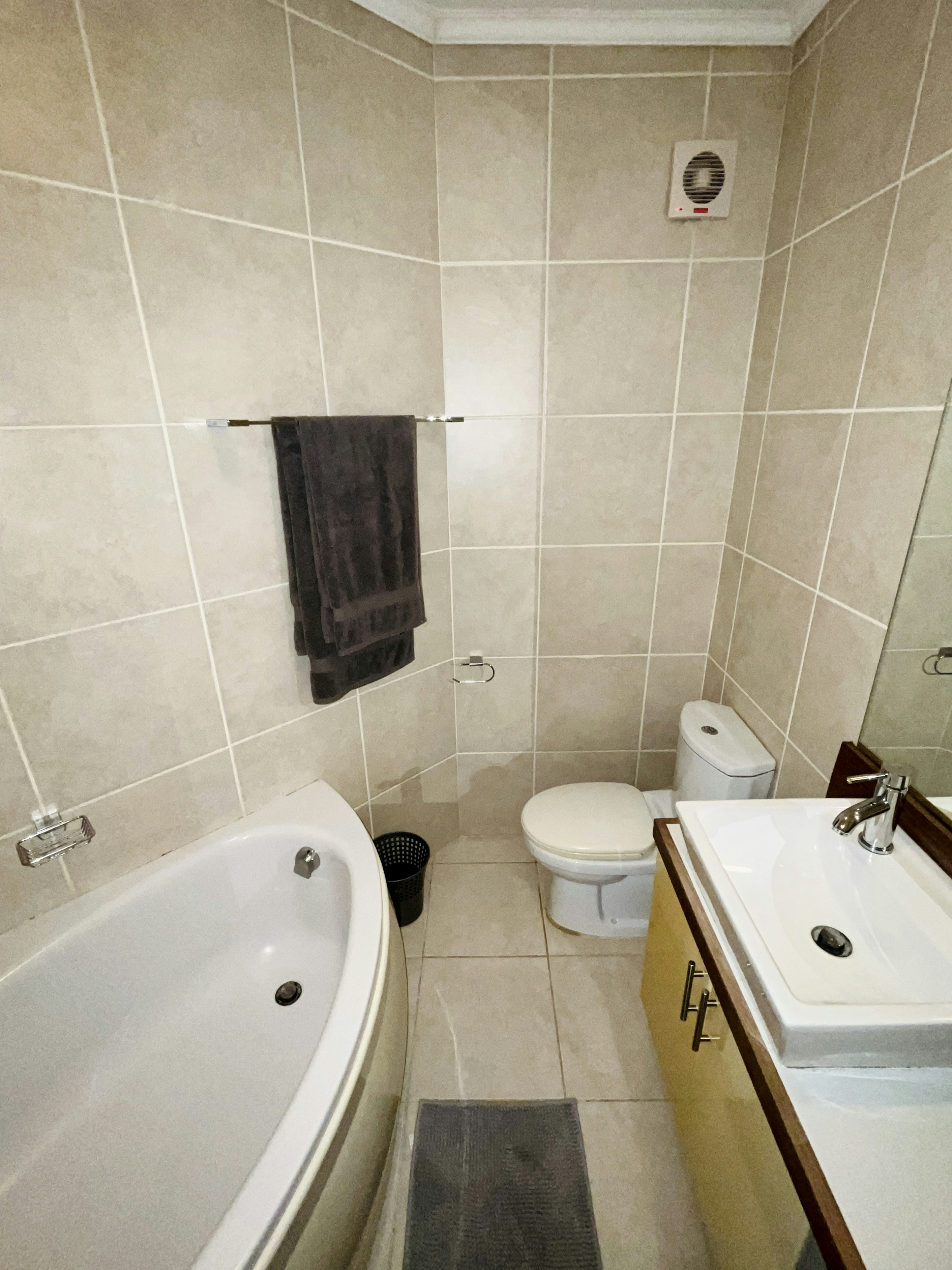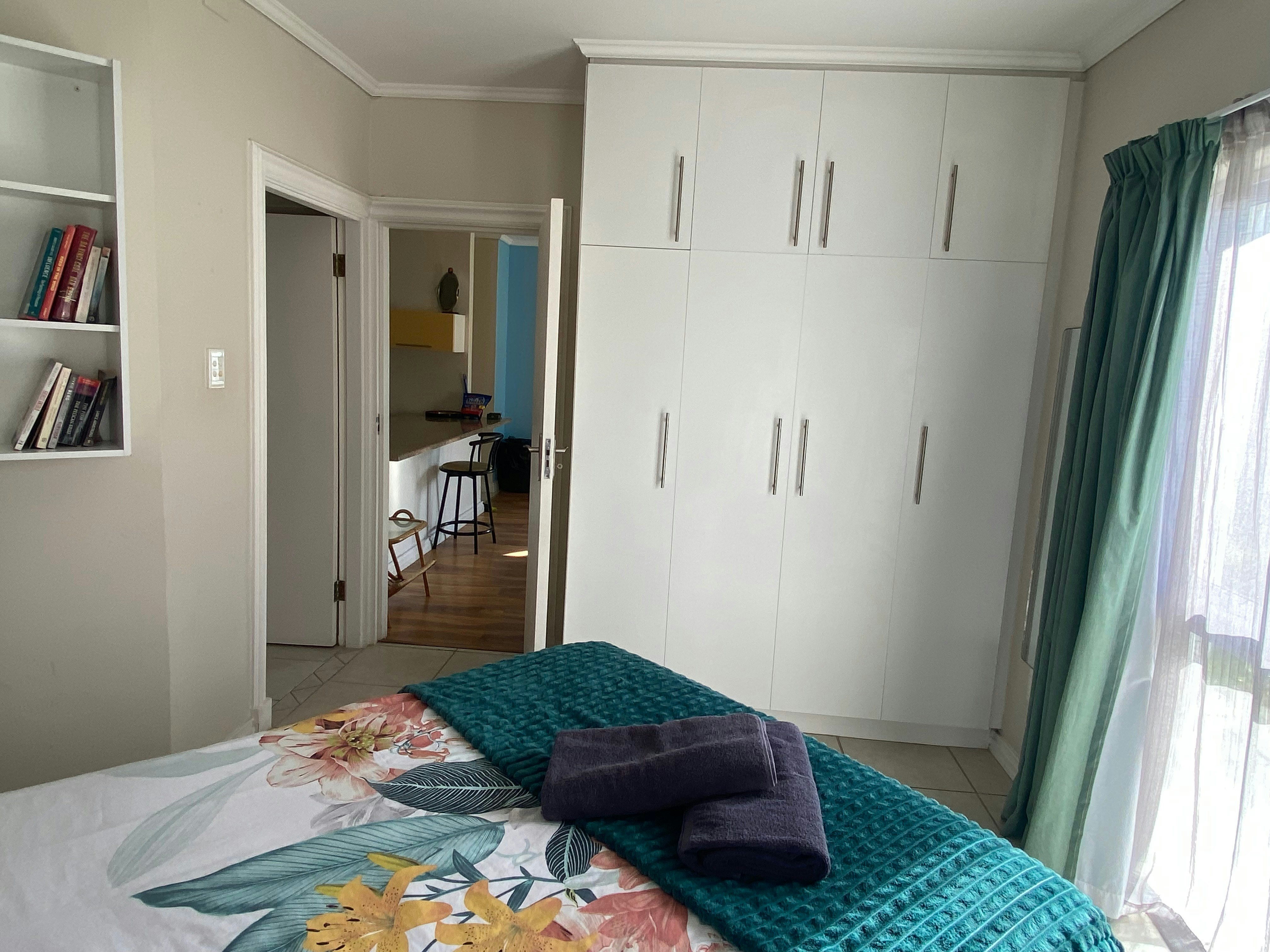 The open-plan kitchen is equipped with a fridge-freezer, stove, oven, toaster, microwave, basic cutlery and crockery, as well as tea- and coffee-making facilities. A dishwasher is available for extra convenience. The living area is furnished with a lounge suite and a flat-screen TV. Free Wi-Fi is also available. There’s also a spacious private patio where guests can relax and enjoy the garden or cool down in the shared swimming pool. Braai facilities and secure parking are also available on the premises.