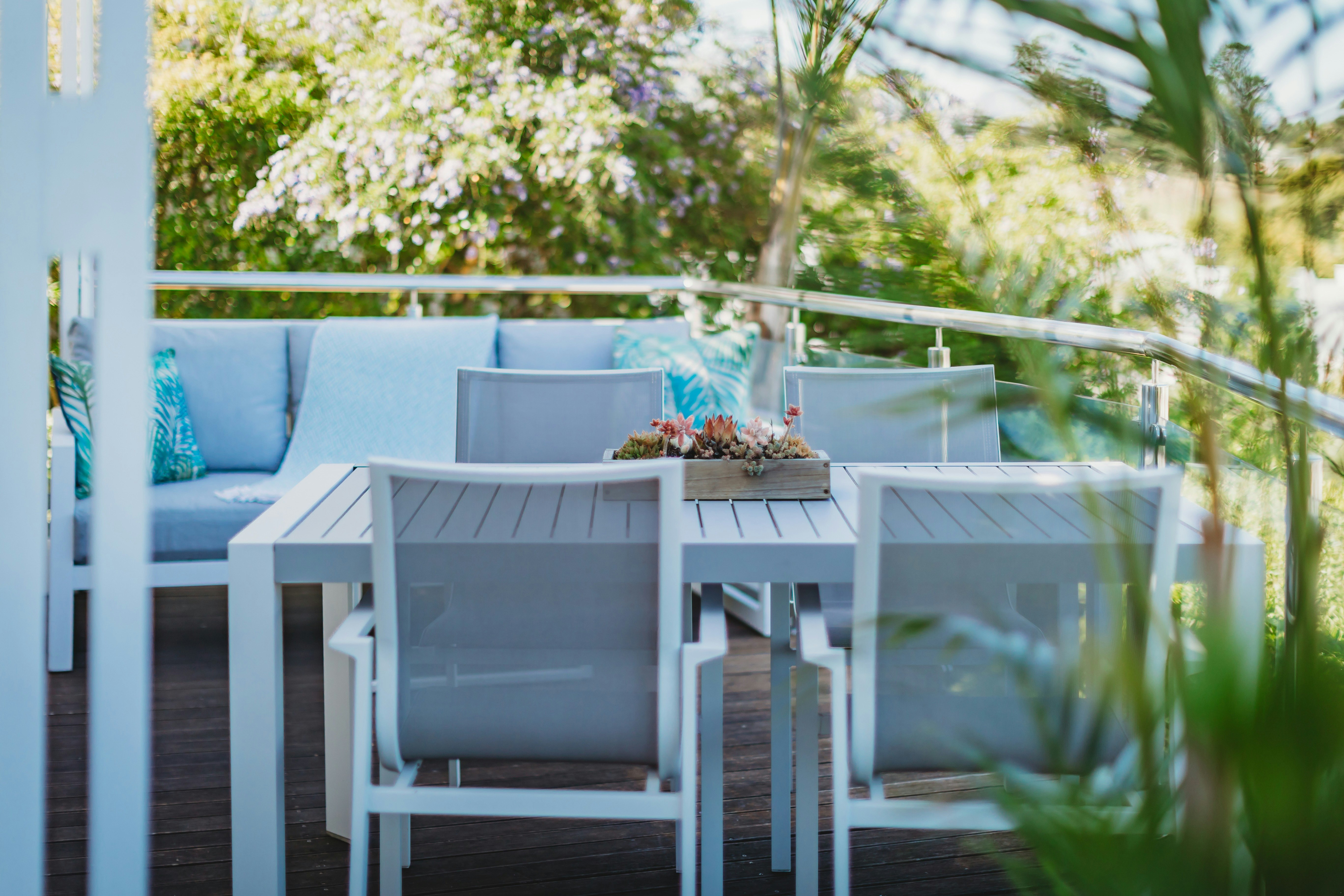 Large sliding glass doors open to a patio with a table, chairs, and a Weber grill for outdoor cooking. From the patio and the fire pit in the garden, guests can enjoy stunning views of the 11th fairway and the Outeniqua Mountains.