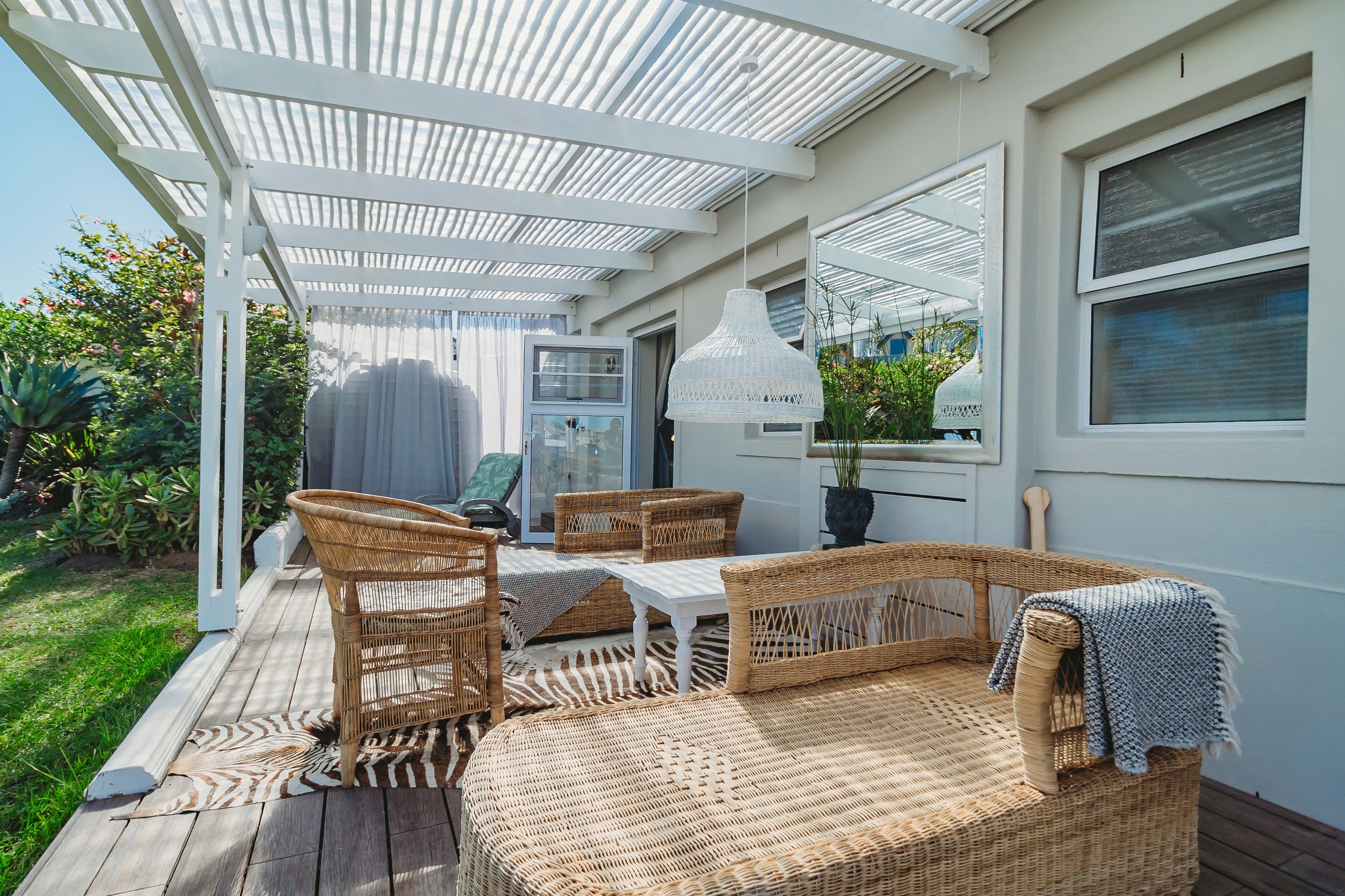Groot glasskuifdeure lei na 'n stoep met 'n tafel, stoele en 'n Weber-braai. Gaste asemrowende uitsigte oor die 11de skoonveld en die Outeniekwaberge vanaf die stoep en die vuurput in die tuin geniet.