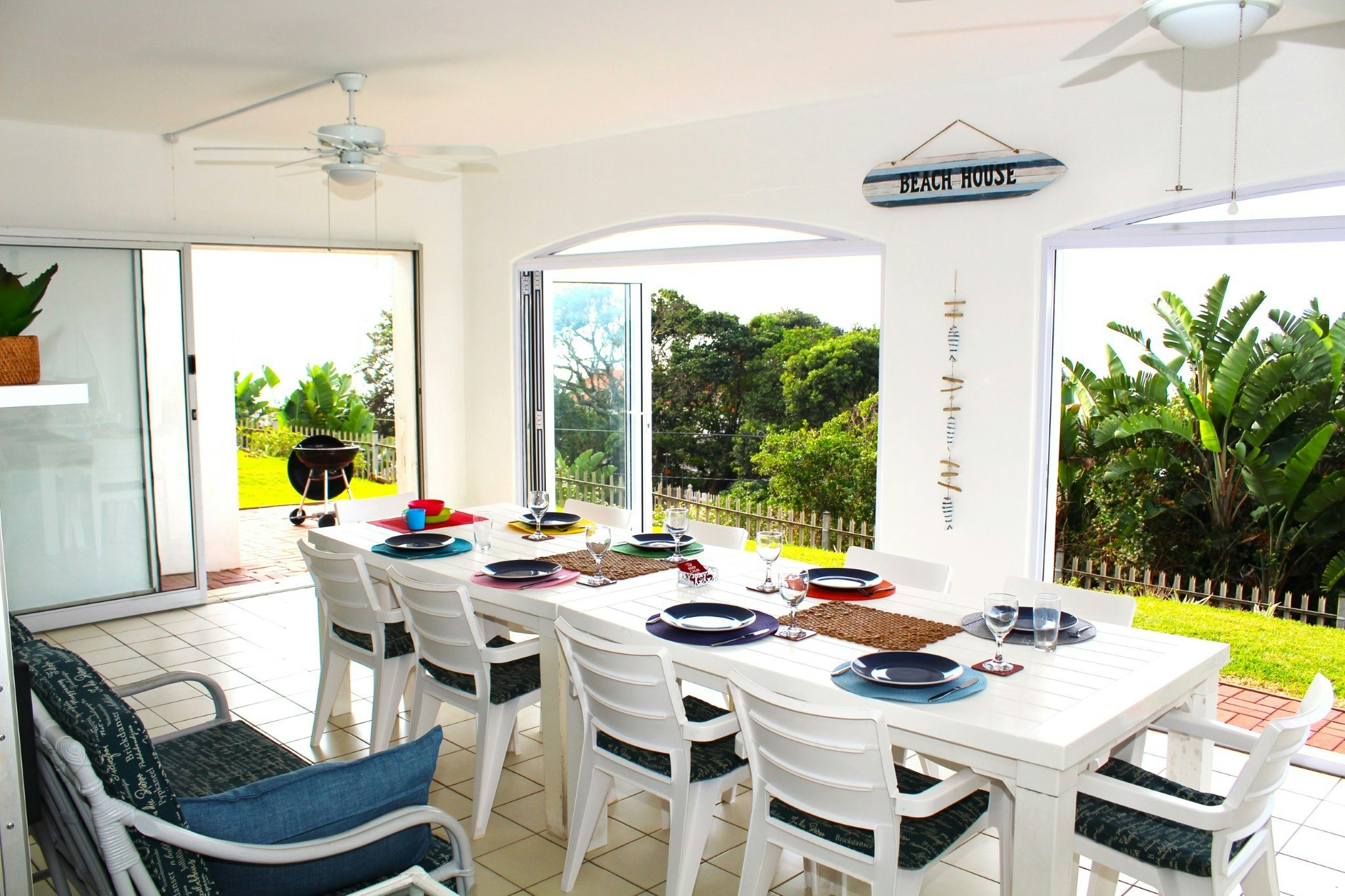 The living area opens onto an enclosed patio with sea views and outdoor seating. Guests have access to portable braai facilities, a single lock-up garage, and limited unallocated guest parking.